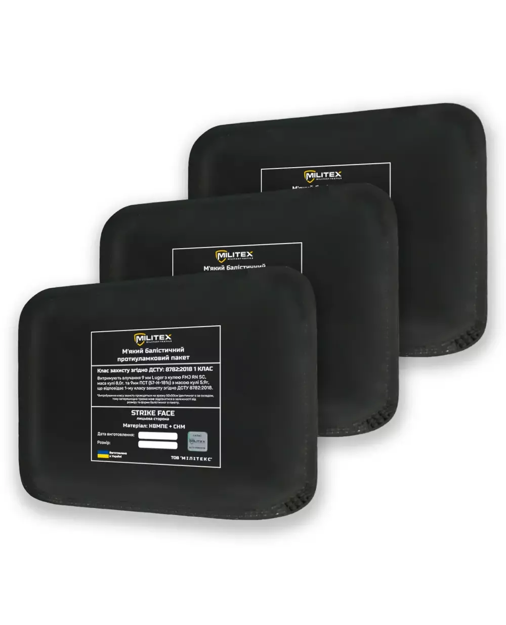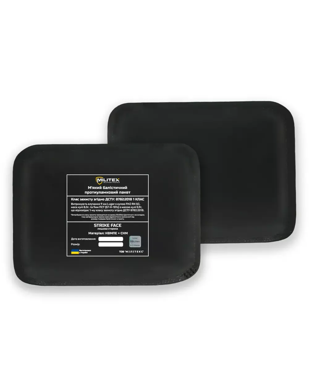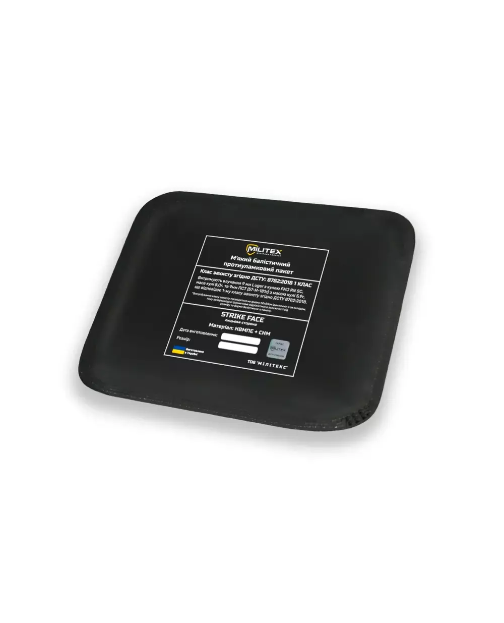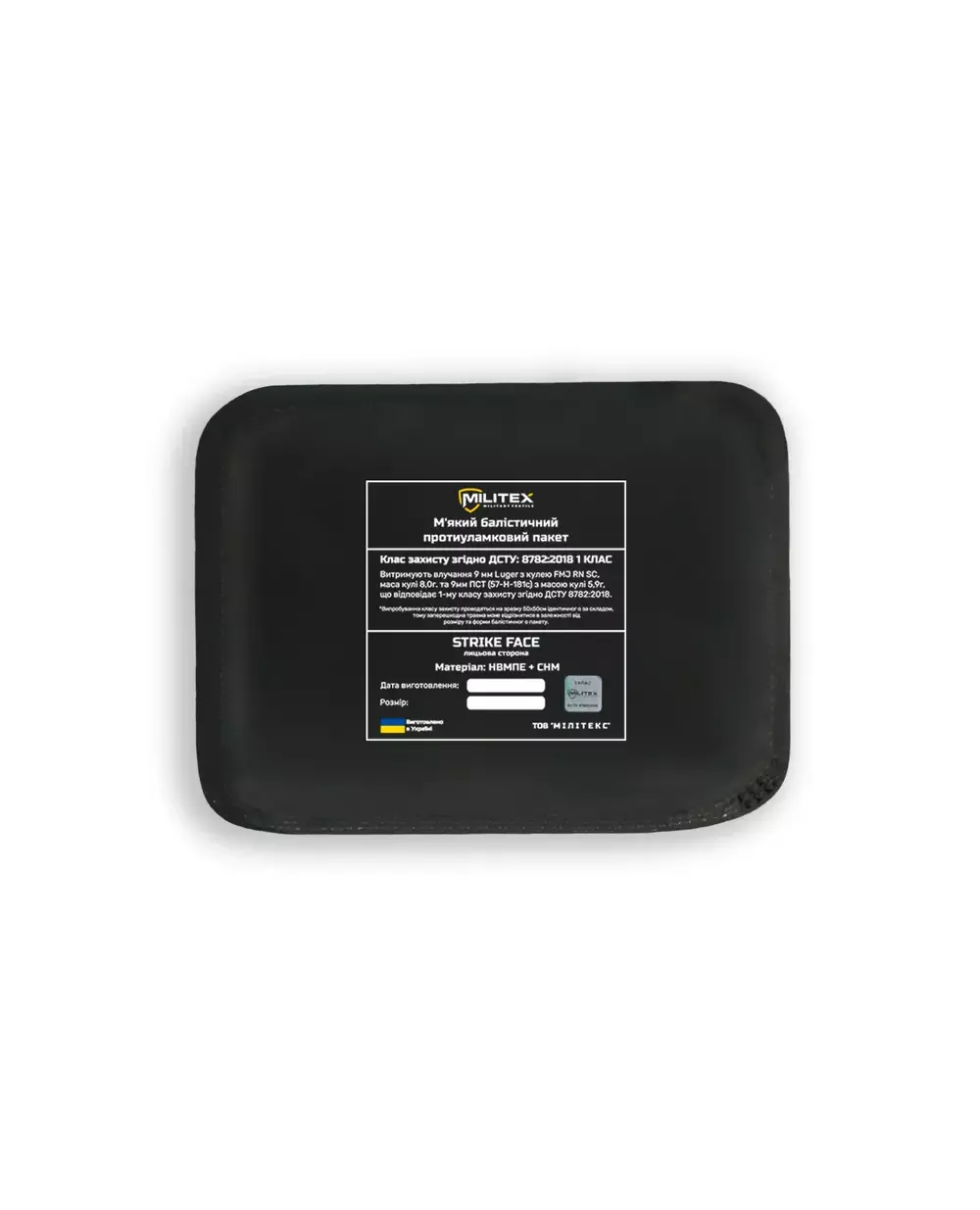 Баллистический пакет изготовлен с соблюдением всех технологических норм и выдержал все испытания: 9х18 мм (скорость 341±1 м/c), 9х19 мм (скорость 401±1 м/c) , соответствующие 1 классу защиты согласно ДСТУ 8782:2018 «Средства индивидуальной защиты».