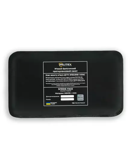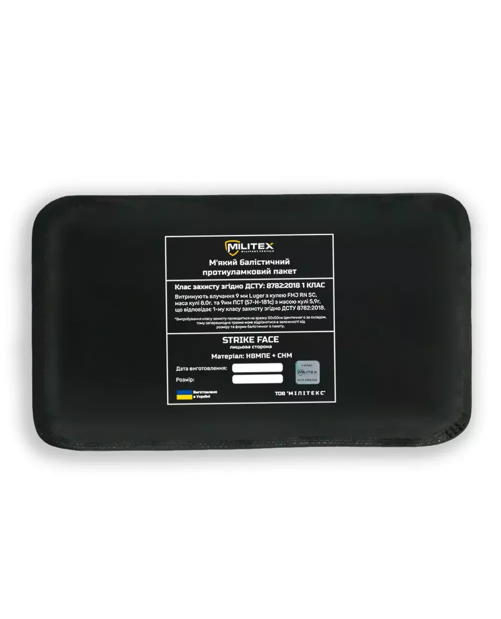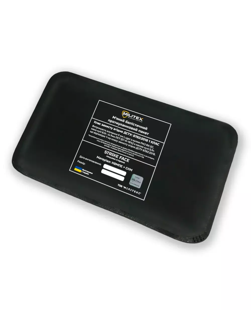 Баллистический пакет изготовлен с соблюдением всех технологических норм и выдержал все испытания: 9х18 мм (скорость 341±1 м/c), 9х19 мм (скорость 401±1 м/c) , соответствующие 1 классу защиты согласно ДСТУ 8782:2018 «Средства индивидуальной защиты».