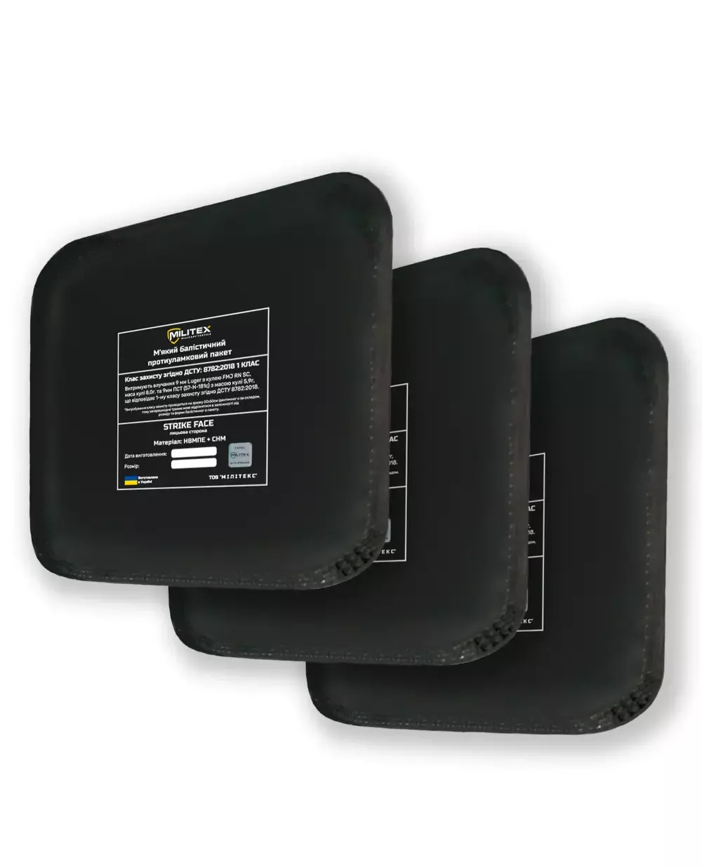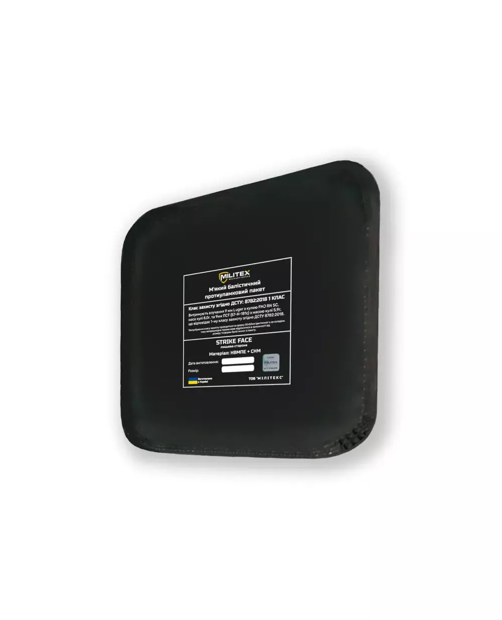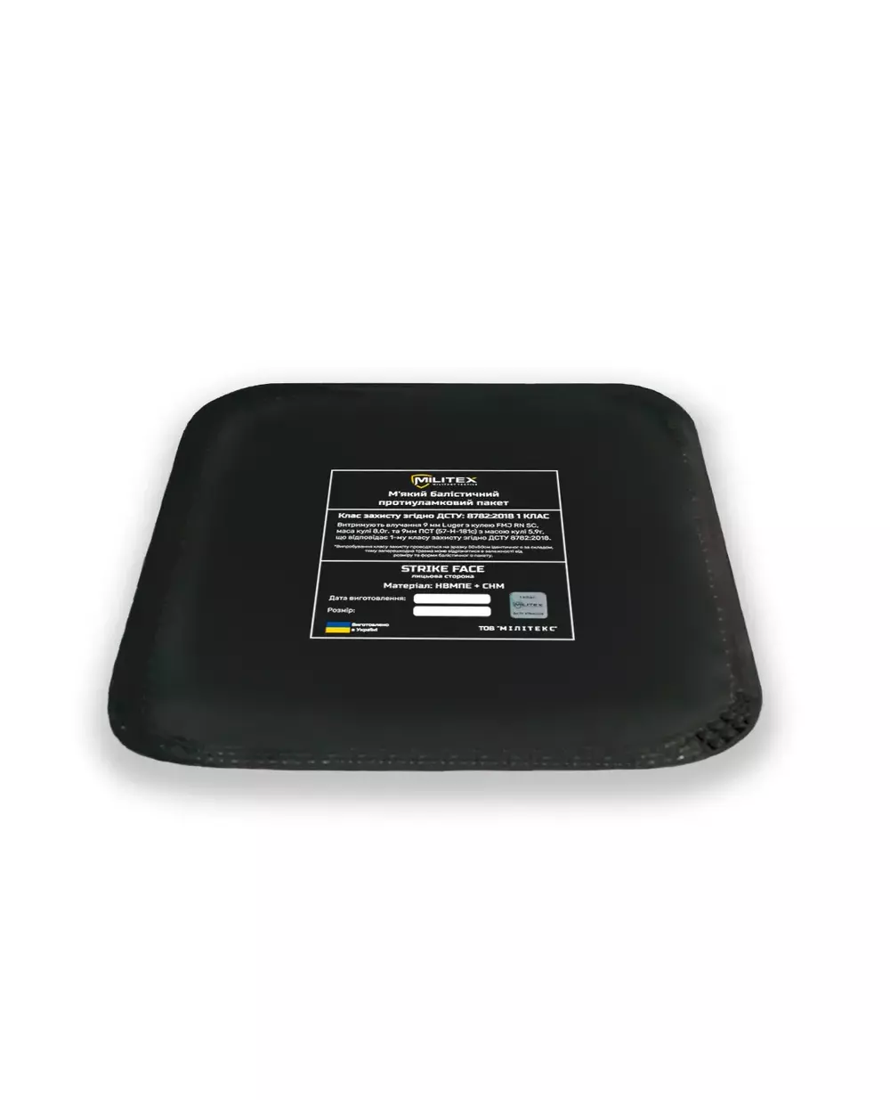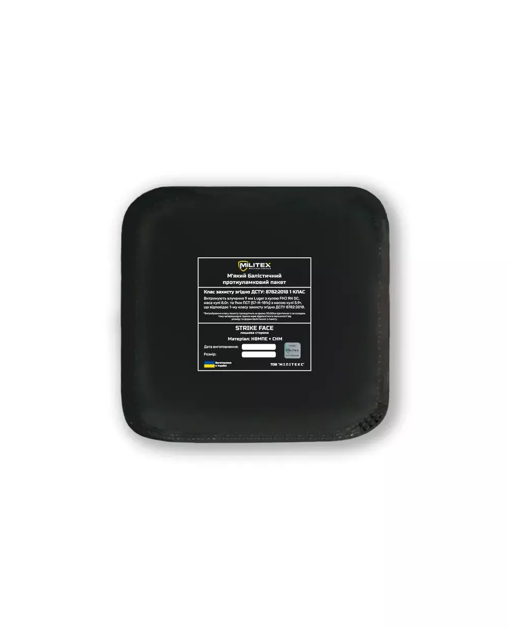 Баллистический пакет изготовлен с соблюдением всех технологических норм и выдержал все испытания: 9х18 мм (скорость 341±1 м/c), 9х19 мм (скорость 401±1 м/c) , соответствующие 1 классу защиты согласно ДСТУ 8782:2018 «Средства индивидуальной защиты».