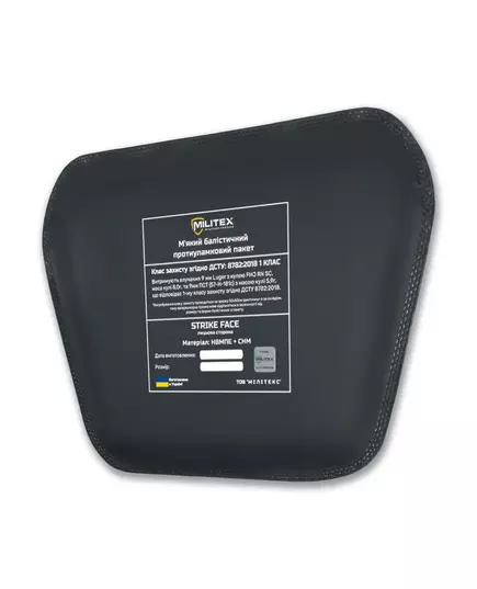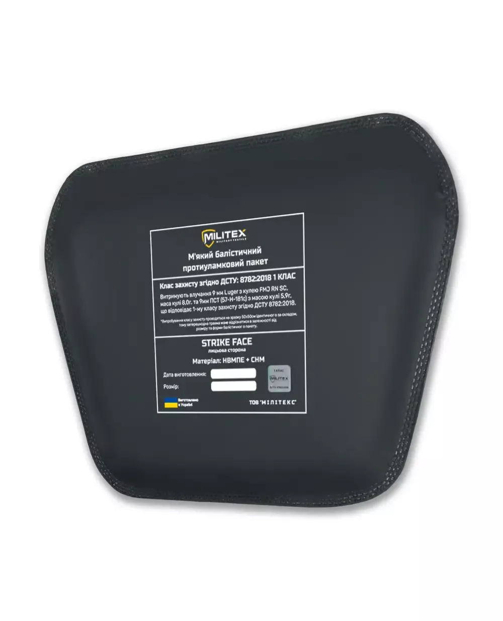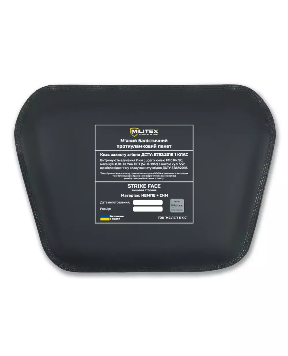Баллистический пакет изготовлен с соблюдением всех технологических норм и выдержал все испытания: 9х18 мм (скорость 341±1 м/c), 9х19 мм (скорость 401±1 м/c) , соответствующие 1 классу защиты согласно ДСТУ 8782:2018 «Средства индивидуальной защиты».