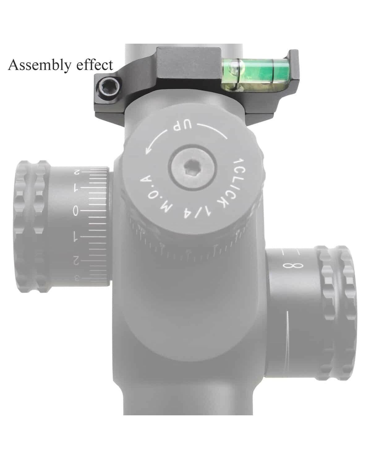 Кольцо с пузырьковым уровнем диаметром 25,4 мм простое в использовании, предназначено для настоящего огнестрельного оружия. Цельнометаллическое кольцо изготовлено из алюминиевого сплава, легкое (всего 12 г) и компактное.