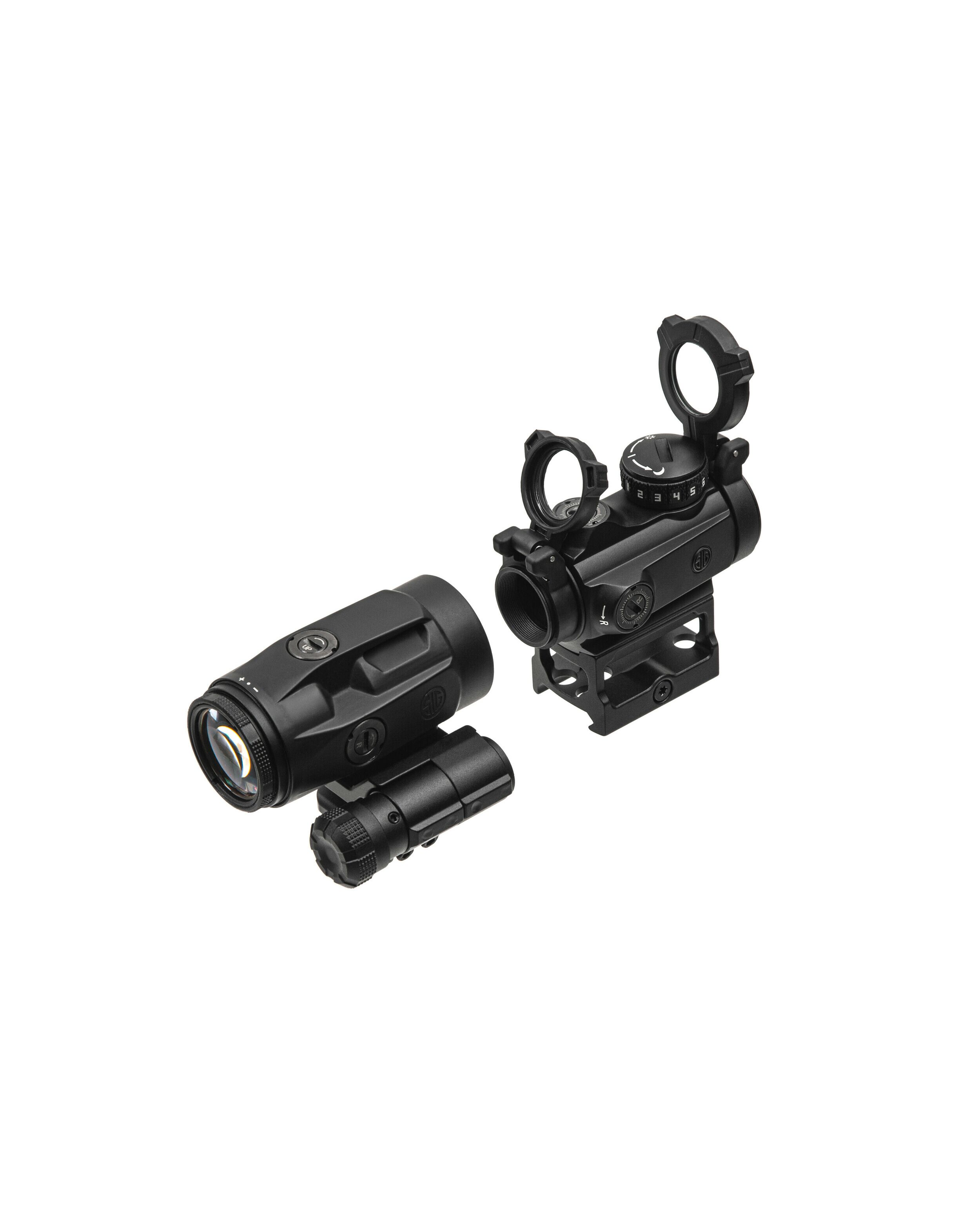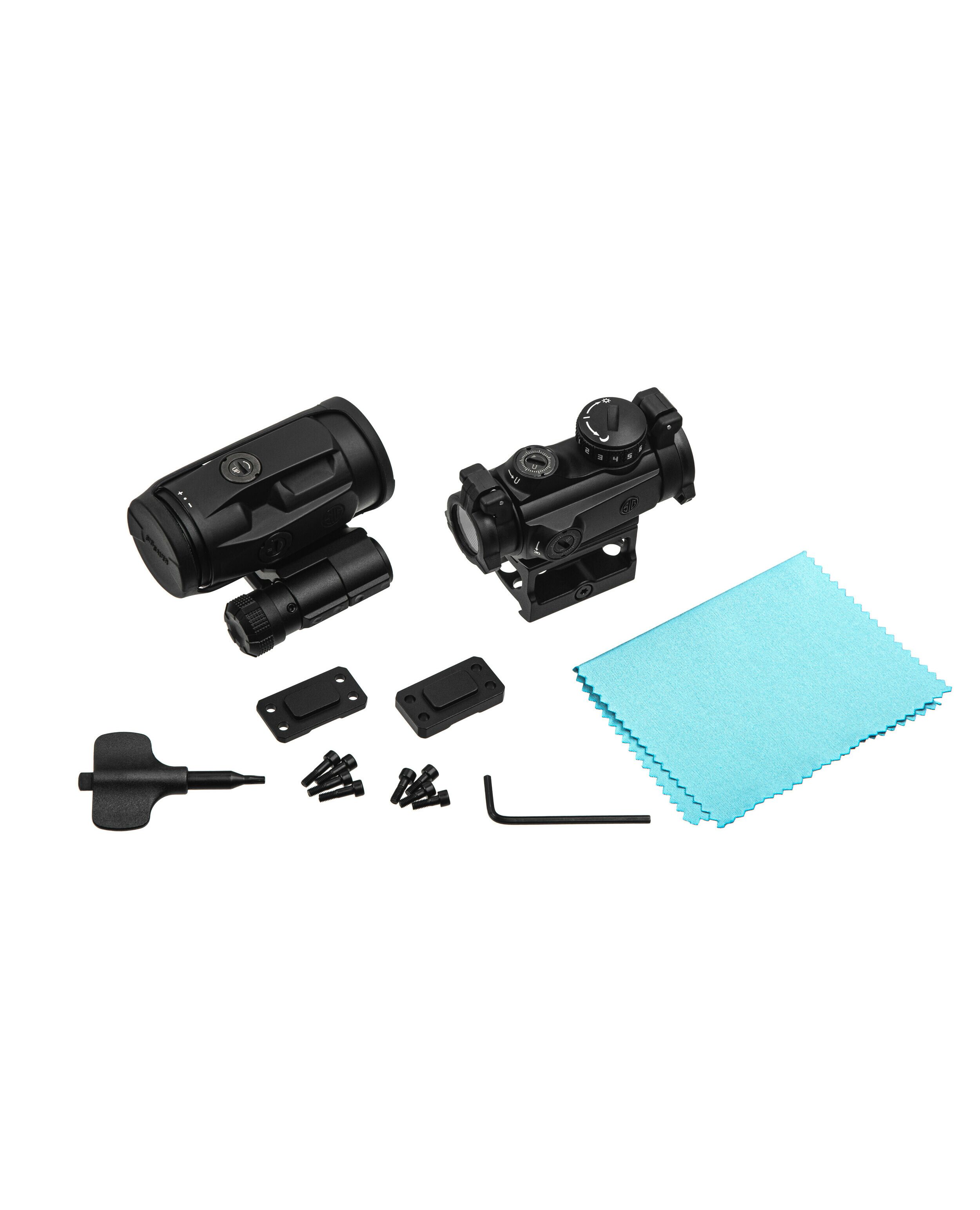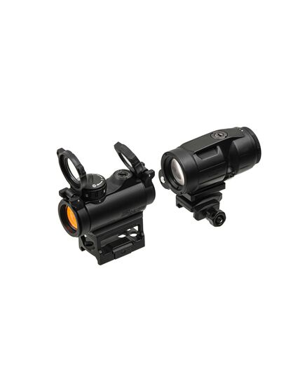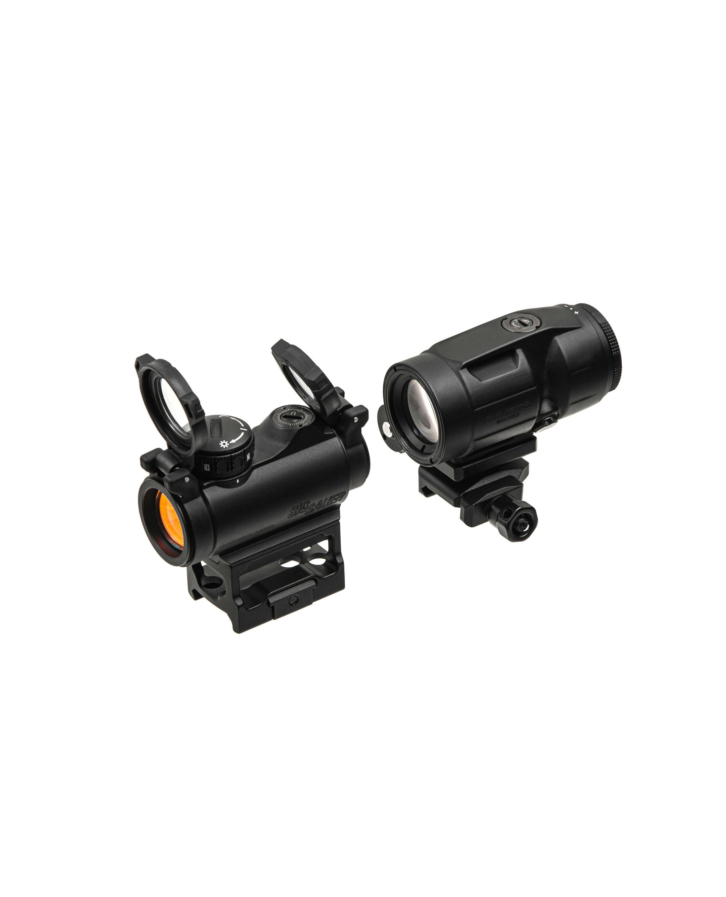 Комплект Sig Optics ROMEO-MSR 2 MOA и JULIET3-MICRO 3x22 мм объединяет высокоэффективное покрытие линз для превосходной светопропускной способности, ультракомпактный размер, легкость, водонепроницаемость и защиту от запотевания по стандарту IPX-7. Коллиматор ROMEO-MSR обеспечивает работу без параллакса с неограниченным удалением выходного зрачка. Прицельная точка коллиматора размером 2 МОА имеет 10 дневных и 2 ночных режима яркости, которые помогают поражать цель в любых условиях в течение 20 000 часов от батареи CR1632. Корпус и крепеж изготовлены из авиационного алюминия. Прицел имеет откидные крышки. JULIET3-MICRO обеспечивает увеличение 3х и имеет крепеж с поворотной кнопкой на 90°. Корпус увеличителя изготовлен из алюминия авиационного класса для обеспечения надежной работы в течение всего срока службы. Прицел и увеличитель крепятся на оружие на планку Пикатини. В комплекте поставляется крепеж высотой 35.8 мм для прицела, ключи, источник питания CR1632, микрофибра для обслуживания.