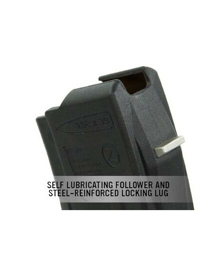 Магазин оснащен запирающими выступами, усиленными сталью, съемной пластиной, пружиной из нержавеющей стали и толкателем с низким коэффициентом трения, что обеспечивает производительность и долговечность военного уровня, которые вы ожидаете от PMAG.