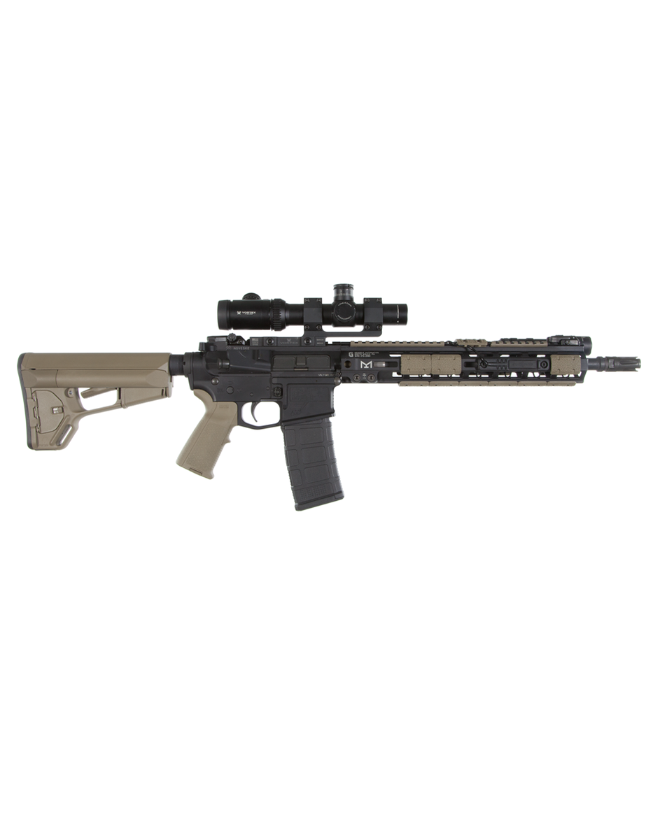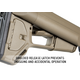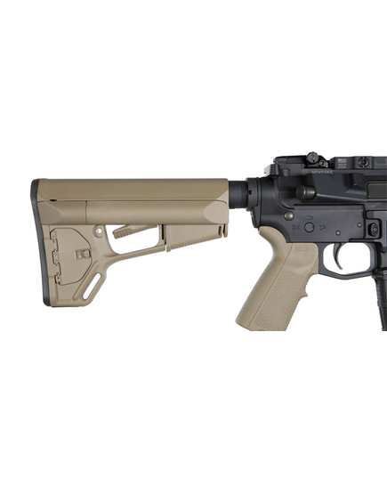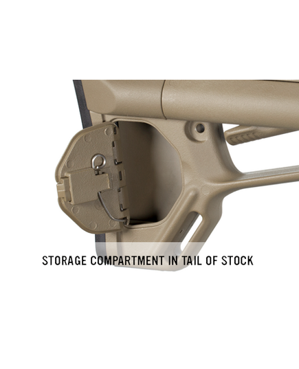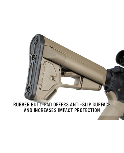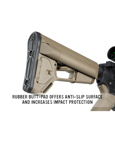 Надежная дополнительная система фиксации не позволяет прикладу колебаться и обеспечивает стабильность оружия во время стрельбы, на прикладе есть место для установки быстросъёмной антабки QD, как с правой, так и с левой стороны. Стандартный нескользящий затыльник толщиной 7,6 мм позволяет легко оперировать оружием и избегать зацепов даже в бронежилете или полном военном обмундировании.