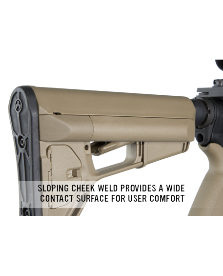 Так же как и приклады серии CTR®, данная модель имеет обтекаемый А-образный дизайн, который крайне удобен для «вскидки» и надежно защищает рычаг складывания от непреднамеренного нажатия.