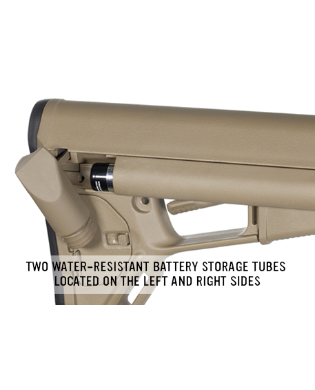 Приклад оснащен двумя водонепроницаемыми отделениями для хранения батареек и отделением для хранения различной мелочевки.