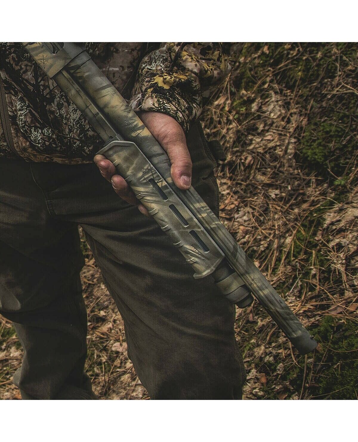 - Увеличена длина, в конце и в начале цевья специальные упоры, не дающие соскользнуть руке и способствующие лучшему контролю оружия.