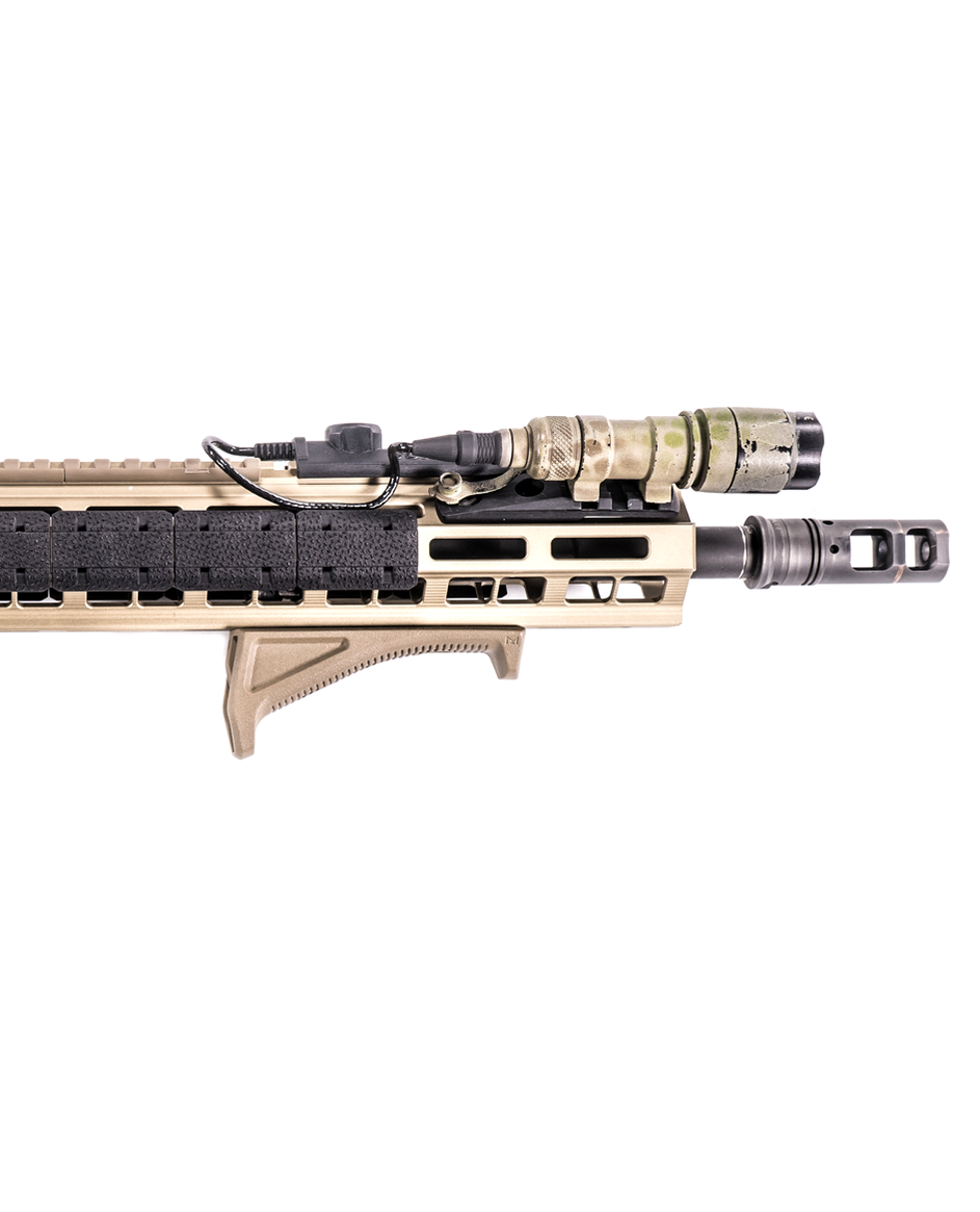 Благодаря форме рукоятки и ее расположению стрелок инстинктивно держит оружие правильно, мышцы рук не перенапрягаться, что позволяет вести прицельную стрельбу длительное время, также правильный хват позволяет значительно снизить влияние импульса отдачи на точность быстрой серии выстрелов. Все необходимые крепежи M-LOK входят в комплект поставки.
