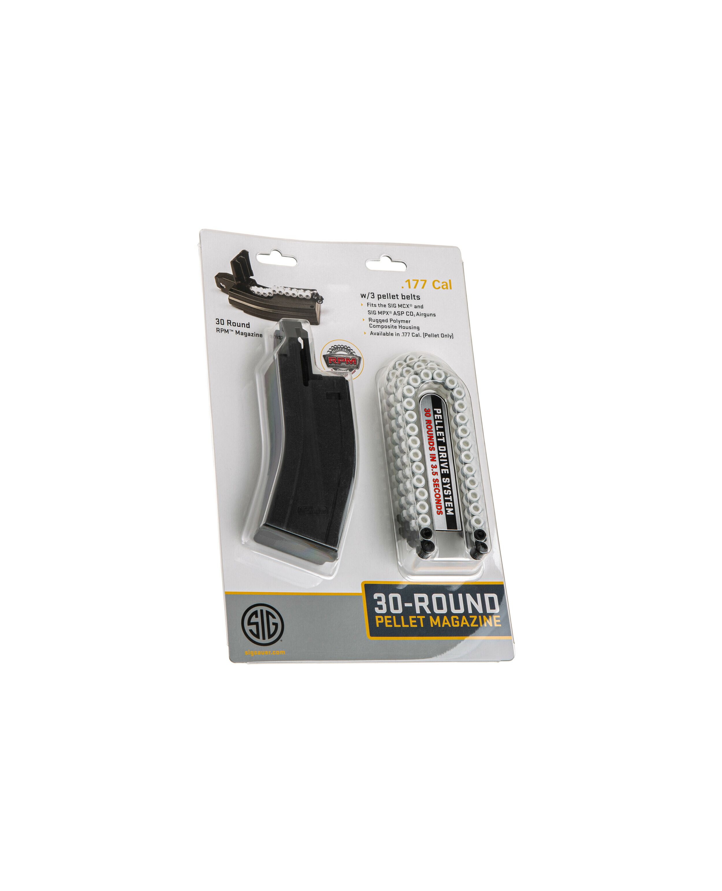 Сменный магазин для винтовок SIG SAUER MPX/MCX Изготовленные из прочного полимерного композита, магазины для пневматической винтовки повышают производительность до стандартов SIG. Этот запатентованный магазин снимает ограничения на скорость стрельбы в пневматических винтовках SIG MCX и SIG MPX. Используя вращающуюся систему привода, SIG RPM ™ плавно подает 30 свинцовых патронов типа Диаболо на ленту. В комплекте три повторно заправляемых ленты .