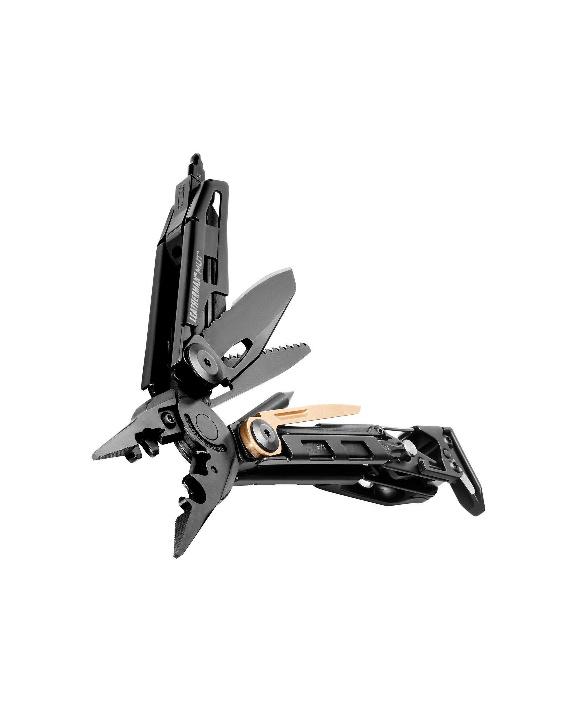 Leatherman MUT имеет несколько мест для крепления чистящих стержней и щеток с резьбой, а также встроенную стандартную отвертку и биты Torx для любых работ. Другие инструменты включают плоскогубцы, комбинированный нож 420HC, пилу, молоток и т.д. Стандартно поставляется с оливковым чехлом MOLLE и инструментом для регулировки открытых прицельных приспособлений, интегрированным с удлинителем для бит.