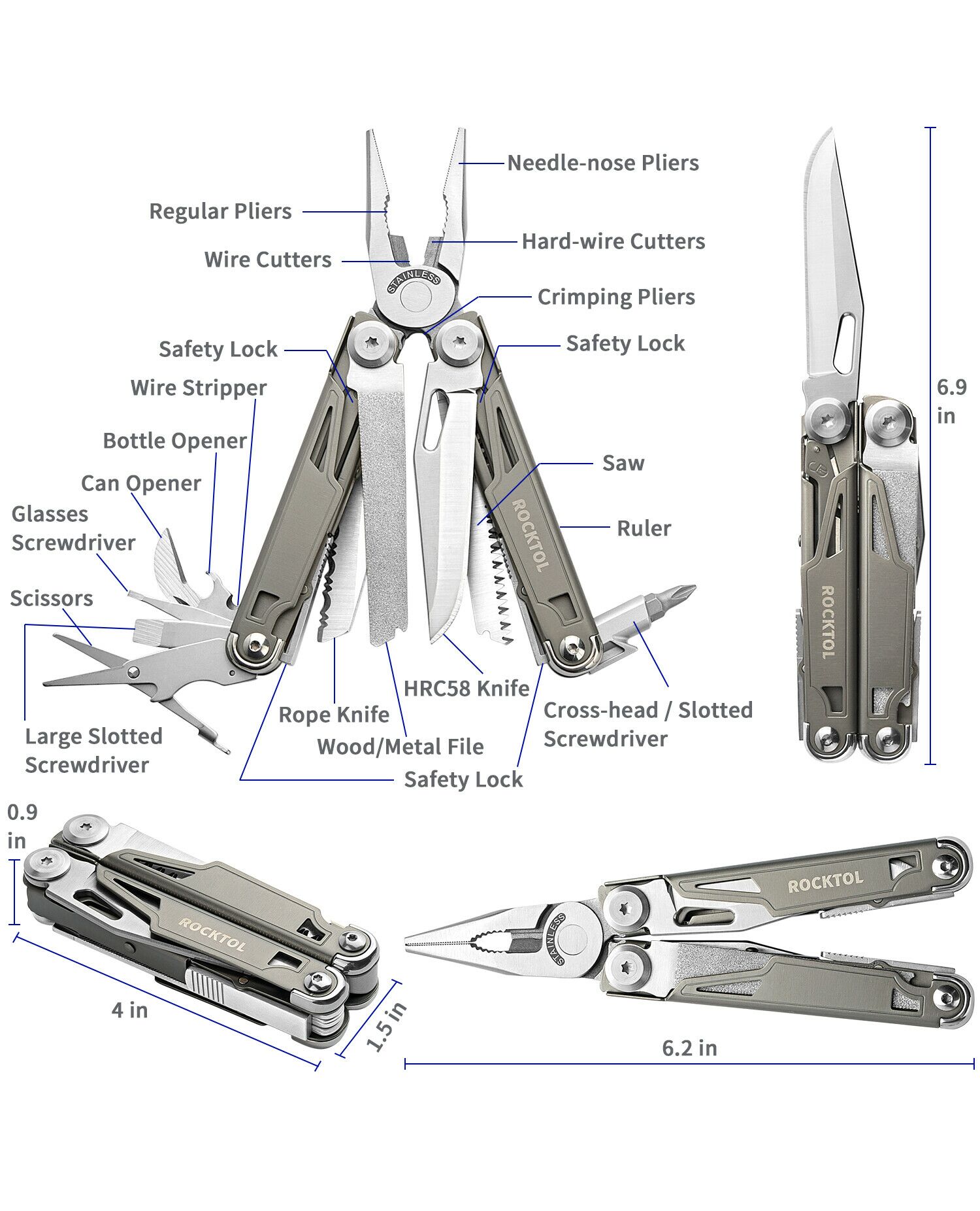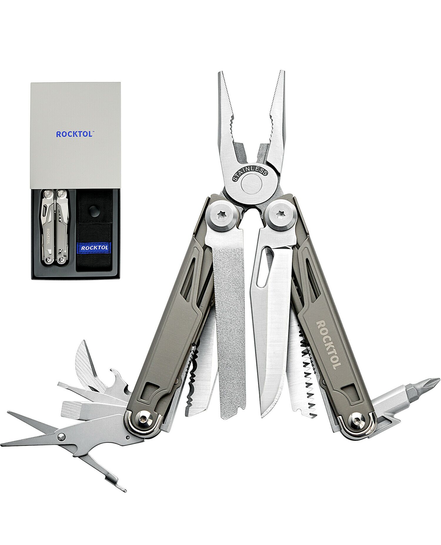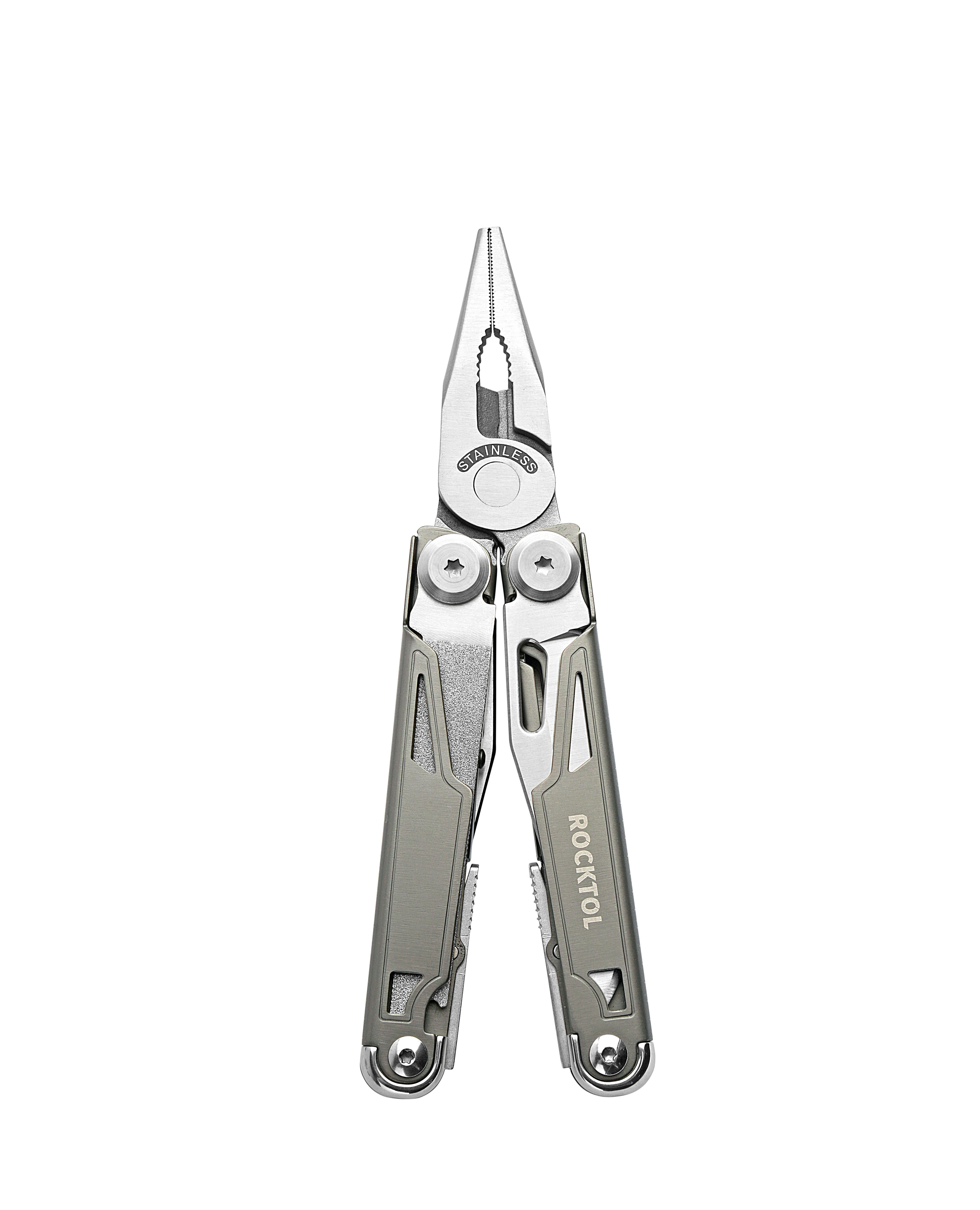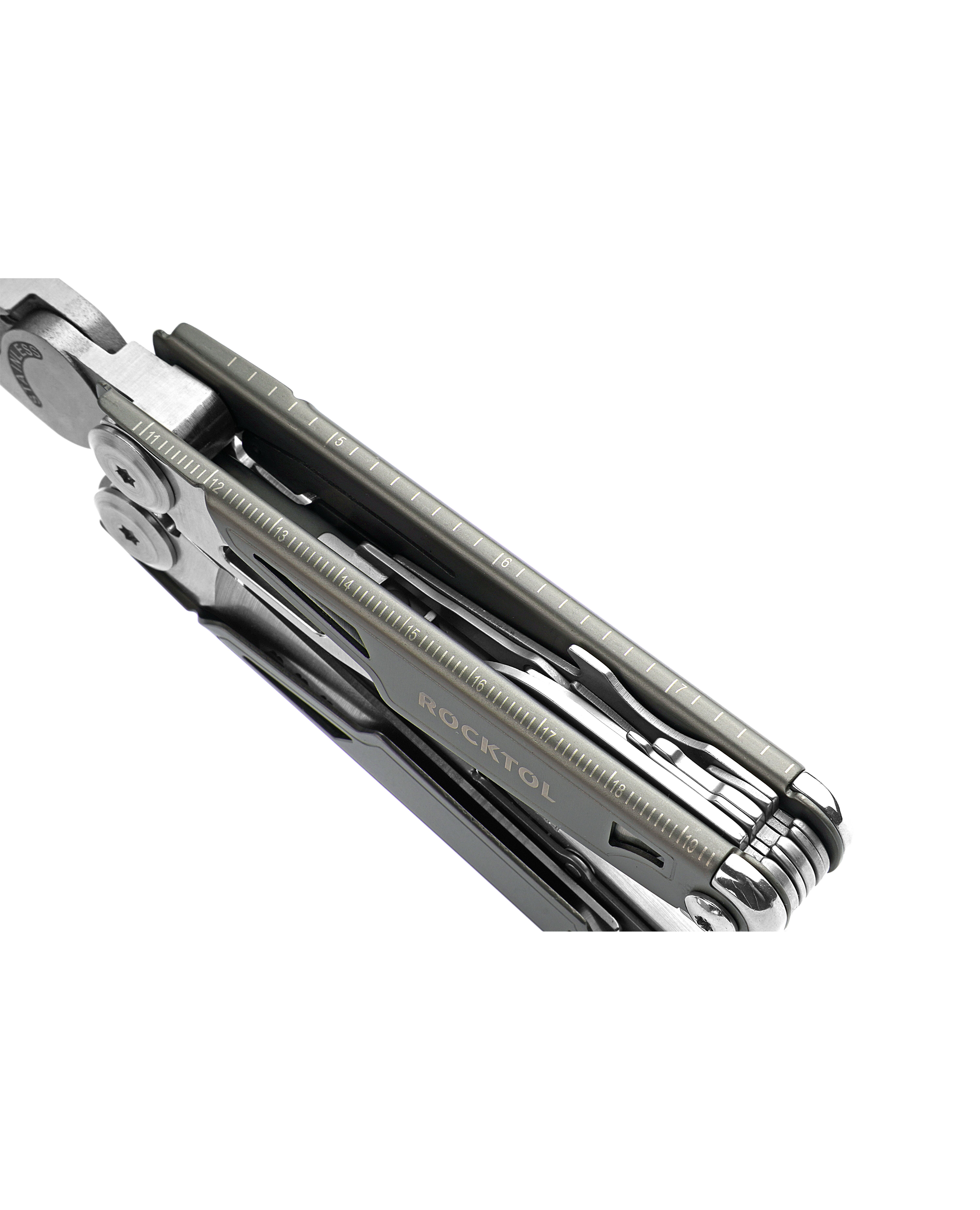 Представляем высококачественный многофункциональный инструмент Rocktol 19 в 1 с рамой с титановым покрытием и сверхострым ножом из нержавеющей стали марки 7Cr17 с твердостью до HRC 58. Он идеально подходит для сложных работ и приключений на природе. Каждый инструмент оснащен надежным механизмом блокировки для дополнительной безопасности, а прочная конструкция из нержавеющей стали гарантирует его долговечность. Кроме того, компактная и легкая конструкция, а также прочный нейлоновый чехол позволяют легко носить его с собой, куда бы вы ни отправились.