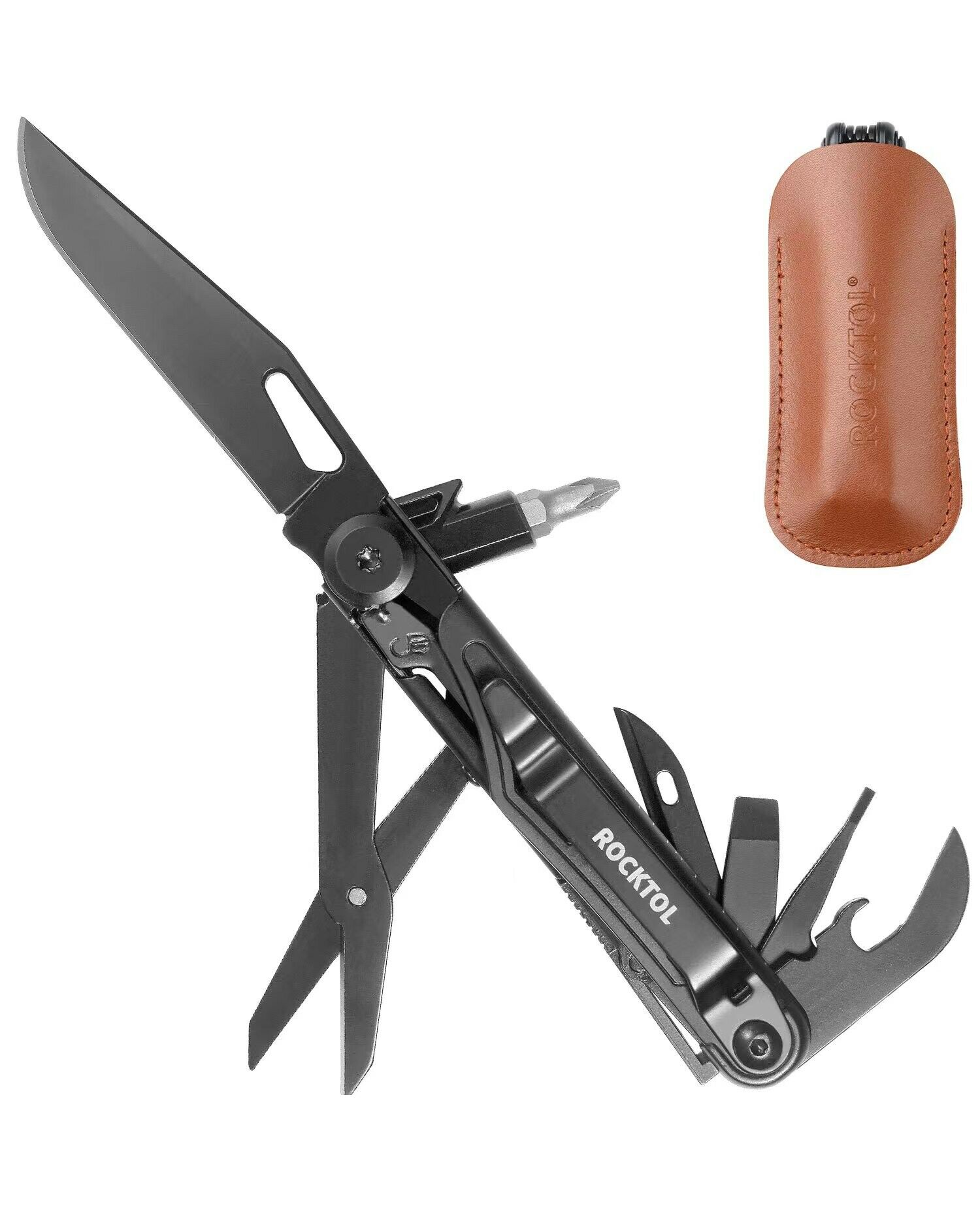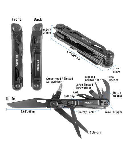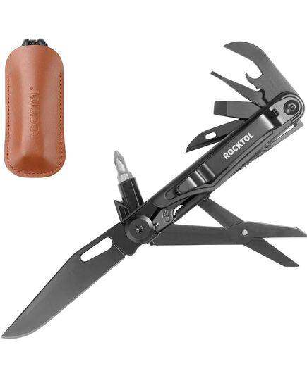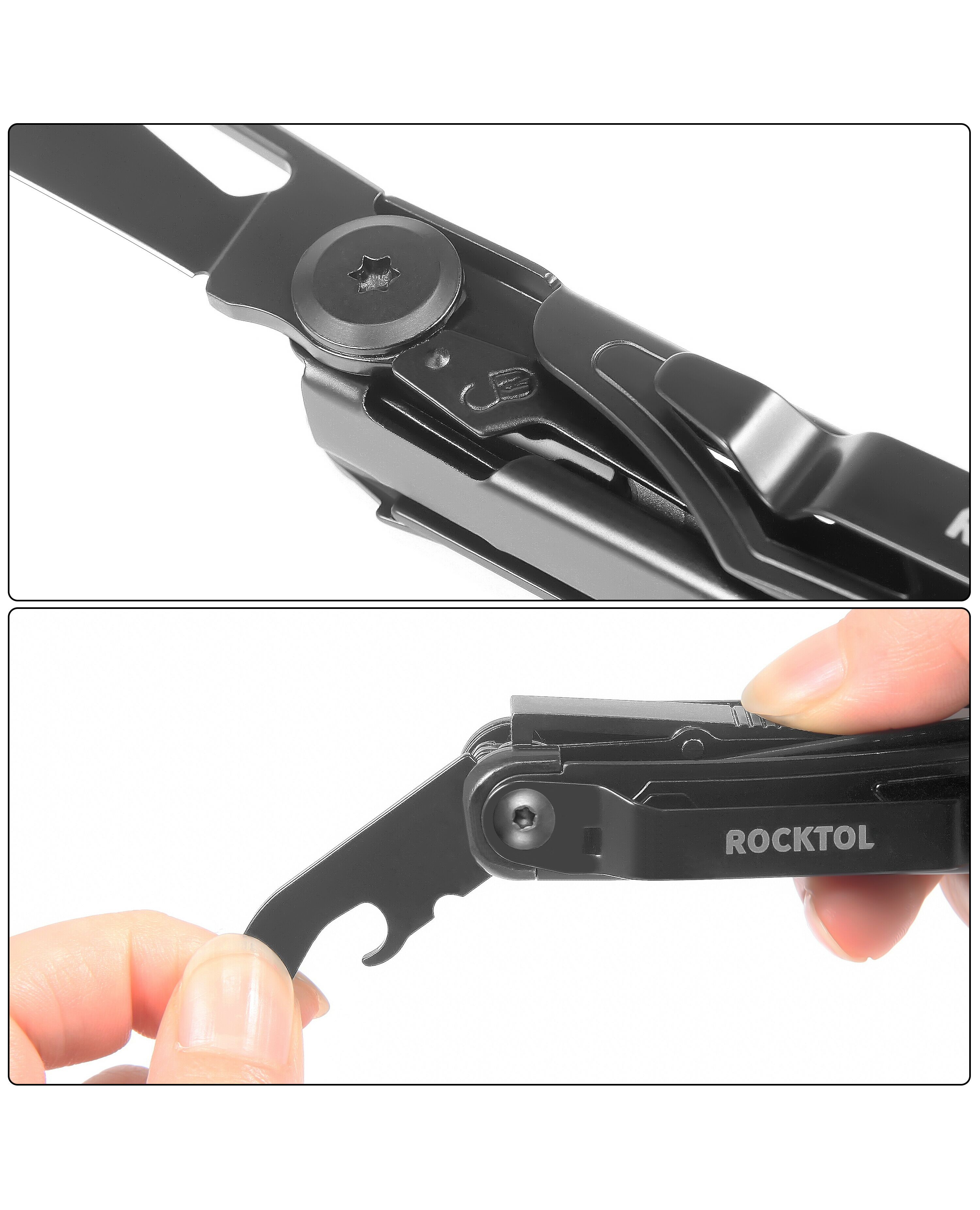 Многофункциональный нож Rocktol оснащен лезвием длиной 68 мм, изготовленным из высококачественной нержавеющей стали марки 7Cr17 с твердостью HRC58, что обеспечивает длительную остроту и легкую резку. Он может похвастаться дополнительными функциями, включая отвертки Phillips #1 и 3/16", шлицевые и плоские отвертки, открывалки для банок и бутылок, инструмент для зачистки проводов, шило, большие ножницы и встроенный карманный зажим.