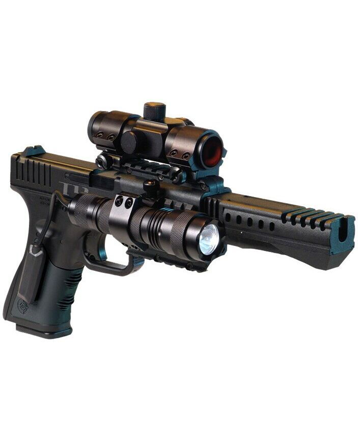Пневматика Crosman T4 OPTS имеет размеры - в длину 220 мм, и вес всего 600 грамм в снаряженном состоянии. Поэтому идеально подходит для обучения стрельбы. Комплектуется фонариком, компенсатором ствола, лазерным указателем, двумя 8-зарядными барабанами-клипа.