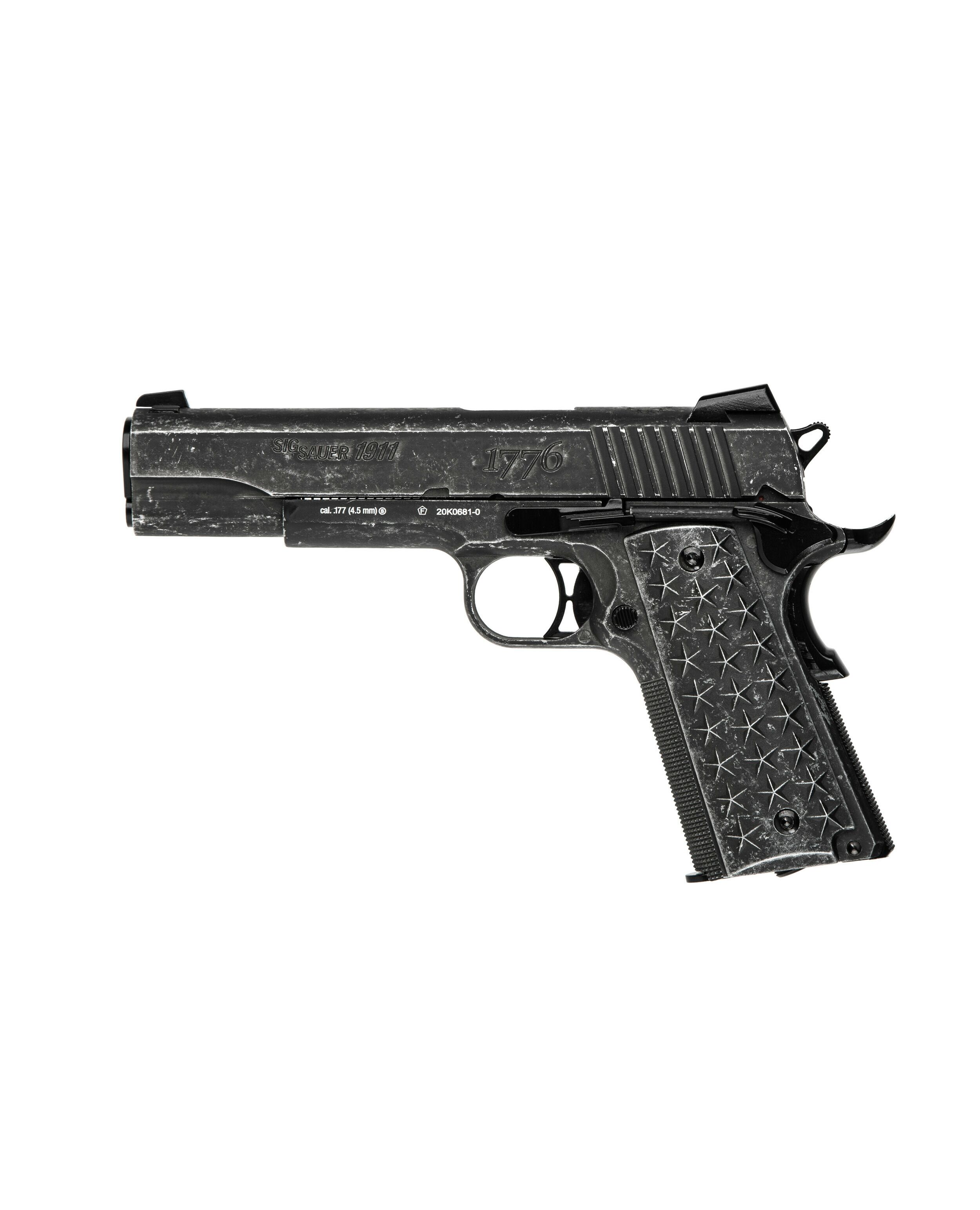 Компания Sig Sauer выпустила великолепный пневматический пистолет 1911 "Wе The People", приуроченный ко Дню Независимости США и стилизованный под известный пистолет Colt 1911. Визуально пистолет получился невероятно красивым, а специально "состаренное покрытие" добавляет элегантности. На затворной раме выгравирована надпись "We The People" в честь преамбулы в Конституции США, а также год принятия декларации о независимости - "1776". Модель полностью изготовлена из металла. Рукоять имеет текстурированную накладку, как и в оригинале - по 25 звезд на каждой стороне, обозначающие количество штатов. Пистолет имеет каркасный спусковой крючок, как и в оригинальной огнестрельной модификации. В качестве прицельных приспособлений используется фиксированные целик и мушка. На тыльной стороне рукояти расположена предохранительная клавиша. После отстрела всего магазина пистолет становится на затворную задержку. Отсек для 12 граммовых баллончиков расположен в сьемном магазине. Вместительность - 17 пуль. Вес пистолета составляет 997 грамм.