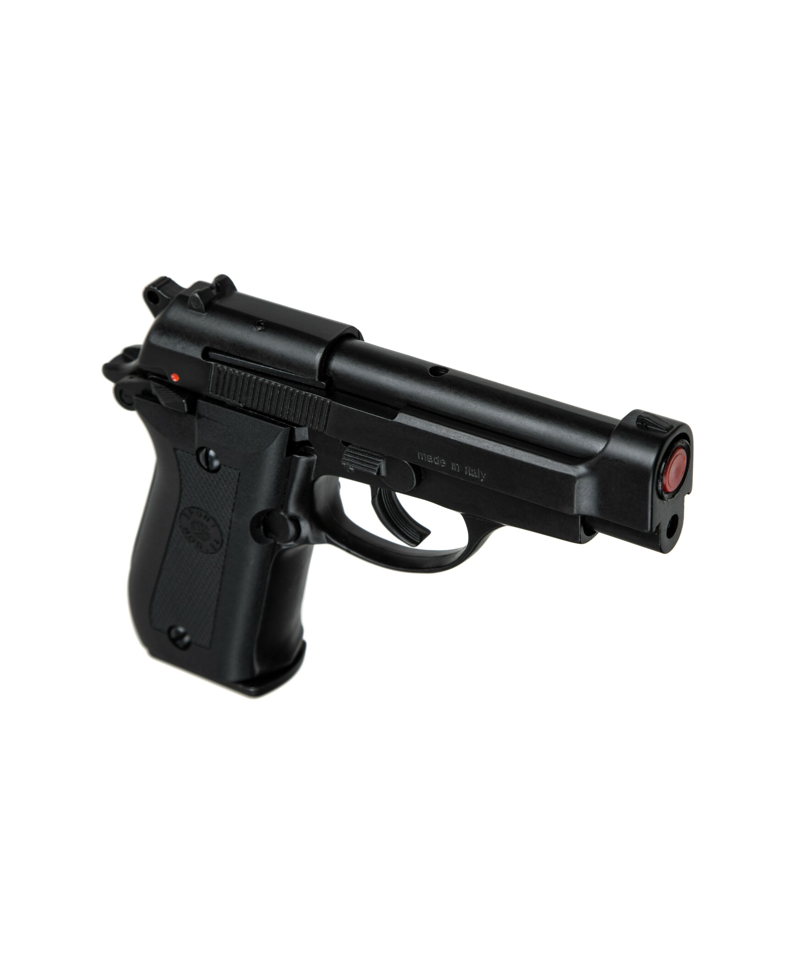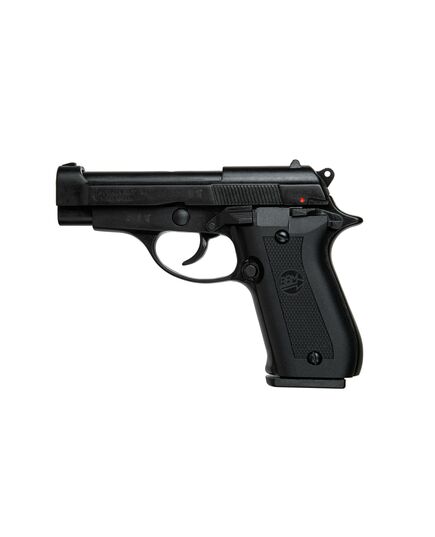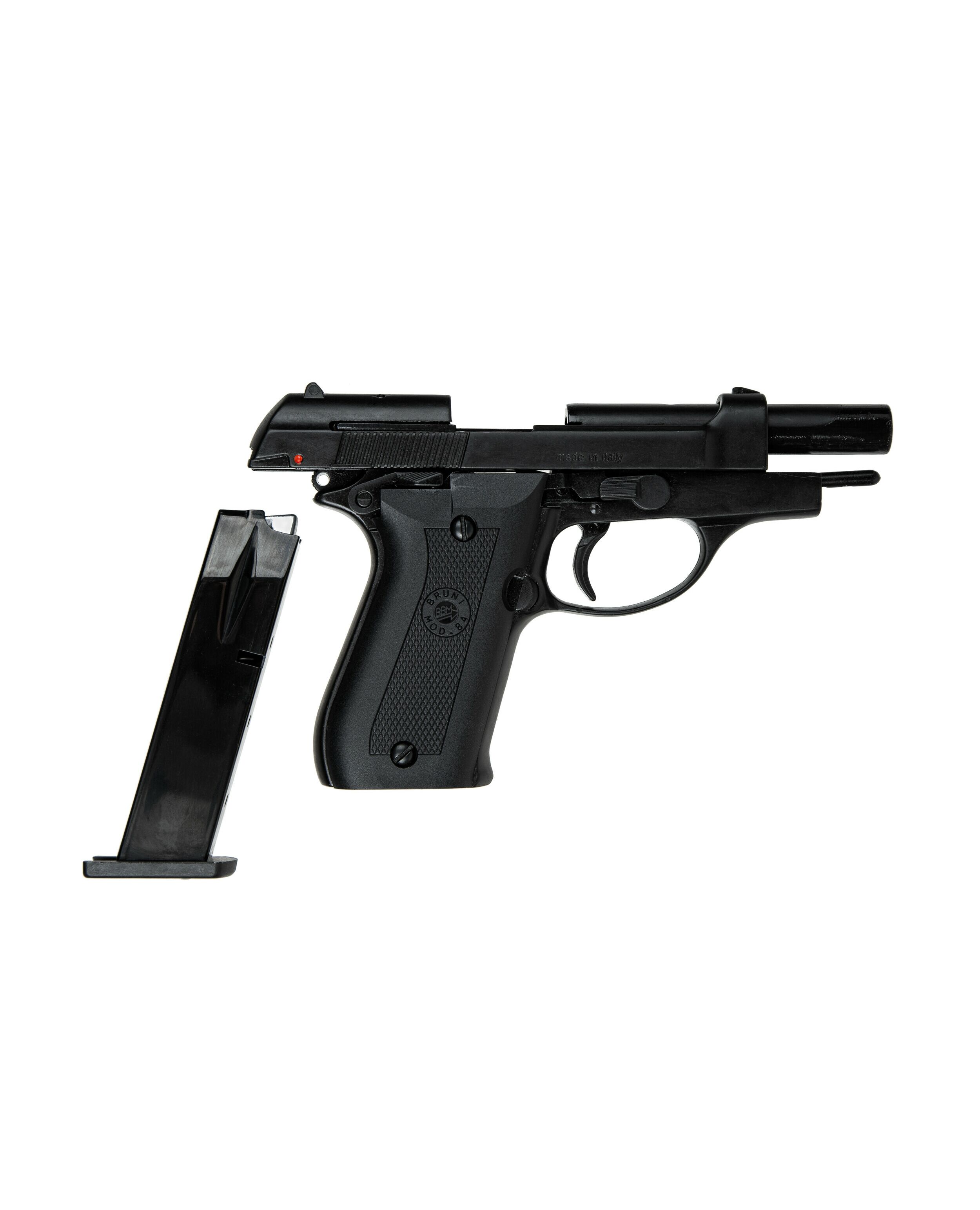 Сигнальный пистолет от компании Bruni 84 кал.9 РАК является копией знаменитой во всём мире Beretta 84. Данное приспособление предназначено для отстрела холостых патронов калибра 9мм РАК. Затвор и рама выполнены из цинкового сплава, что имитирует вес пистолета приближенный к оригиналу. Накладки на рукоядь выполнены из полимерных материалов. УСМ по способу взвода, двойного действия (Double Action) - курок можно взводиться, как вручную, так и при нажатии на спусковой крючок. Также пистолет оборудован ручным предохранителем.