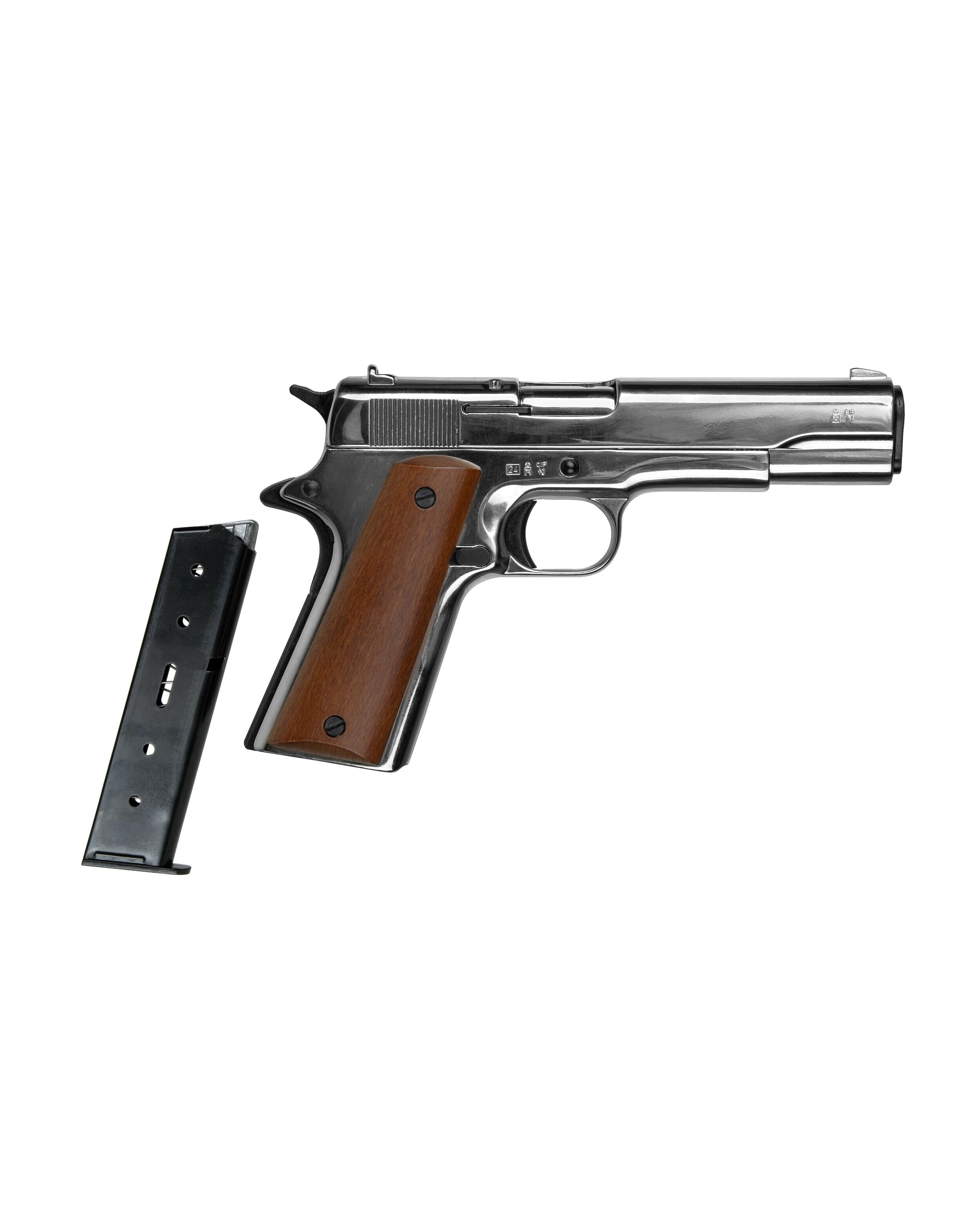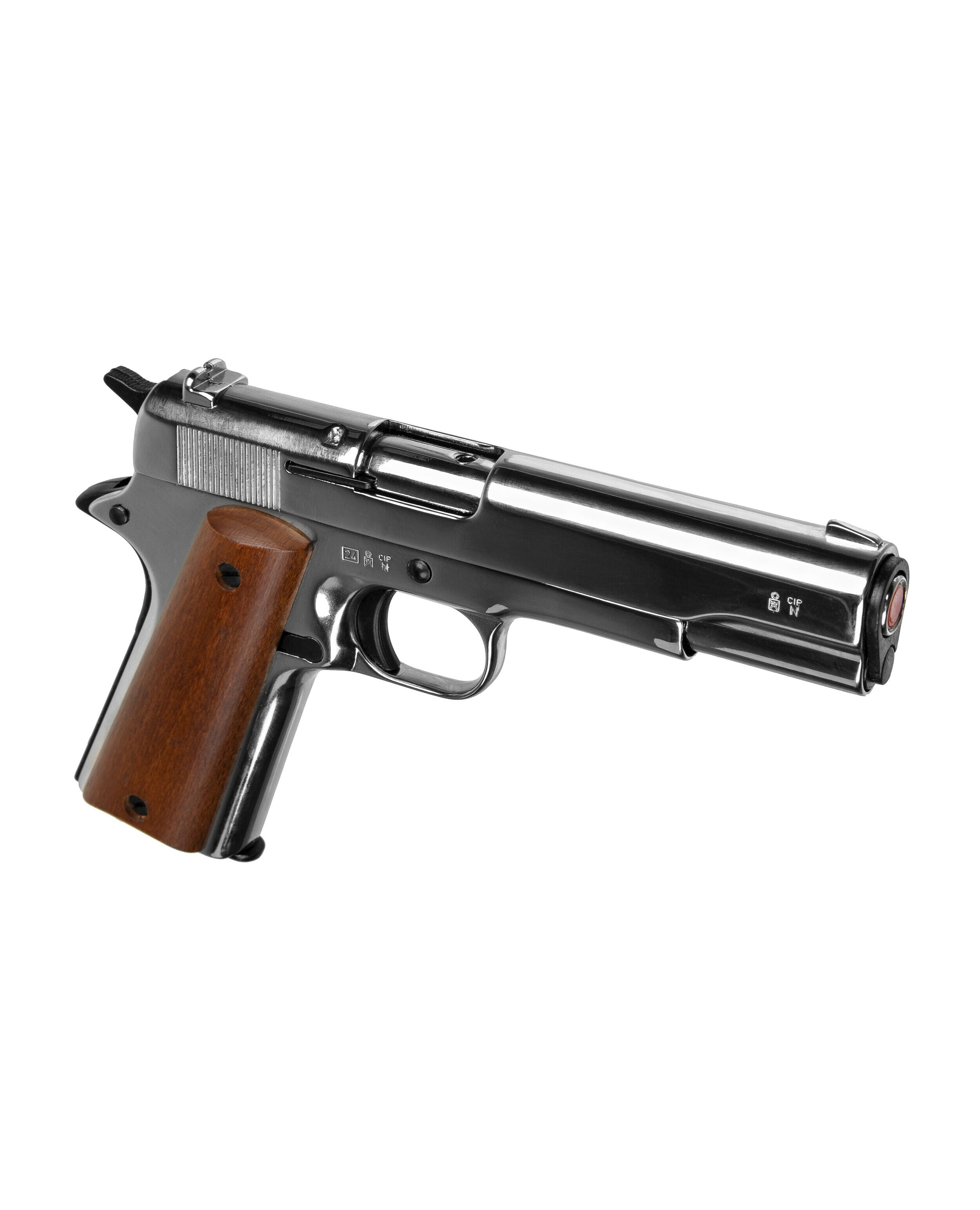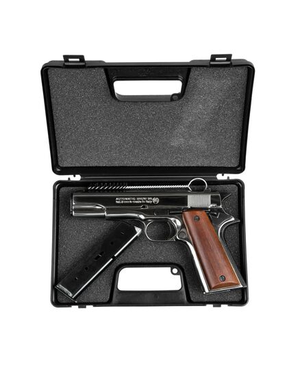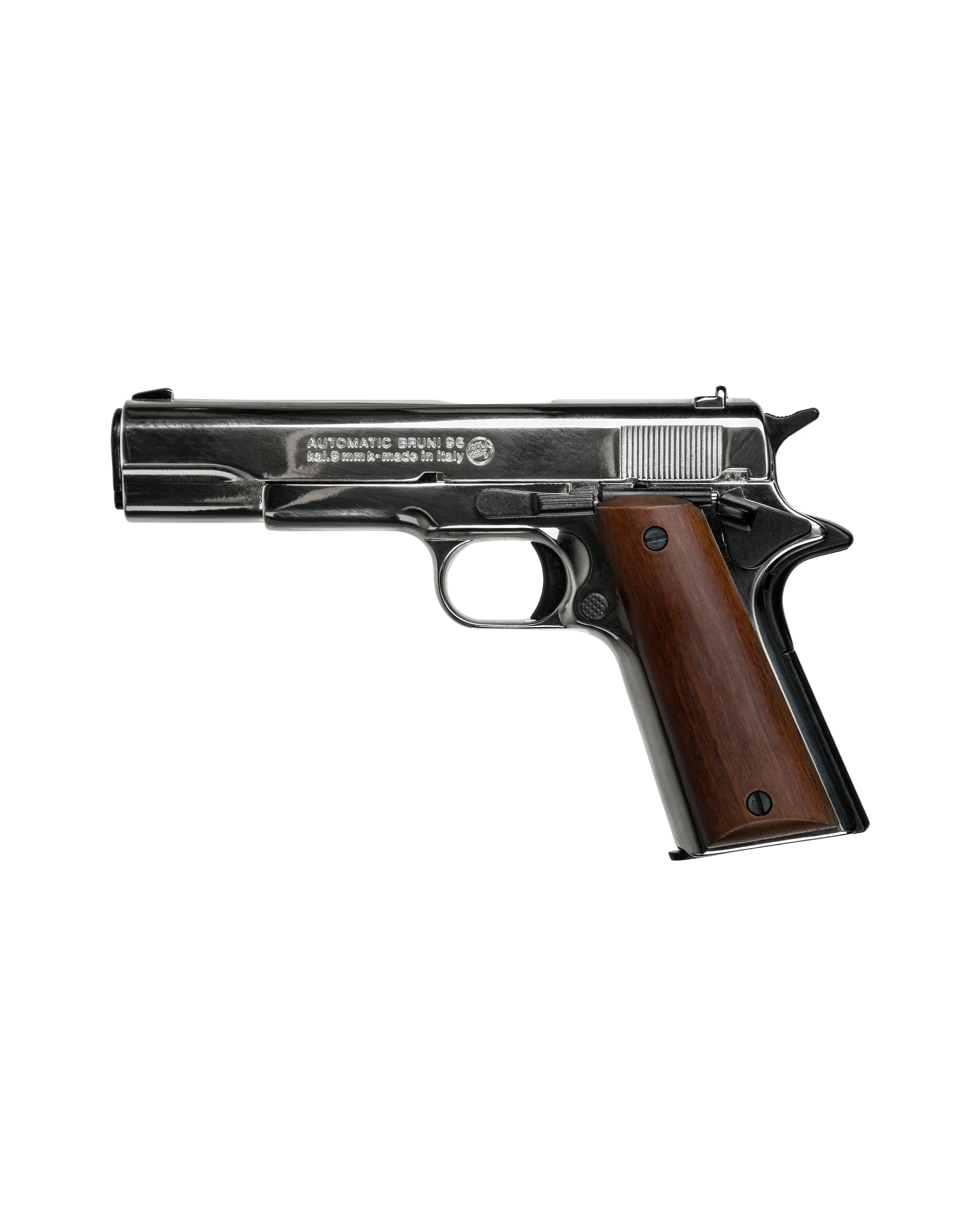 Сигнальный пистолет от компании Bruni 96 кал.9 РАК является копией легендарного М1911. Данное приспособление предназначено для отстрела холостых патронов калибра 9мм РАК. Затвор и рама выполнены из цинкового сплава, что имитирует вес пистолета приближенный к оригиналу. Накладки на рукоядь выполнены из дерева. УСМ по способу взвода, одинарного действия (Single Action) - нажатие на спусковой крючок не взводит курок, а просто совершает выстрел, взвод курка происходит за счёт движения затвора. Также пистолет оборудован ручным предохранителем.