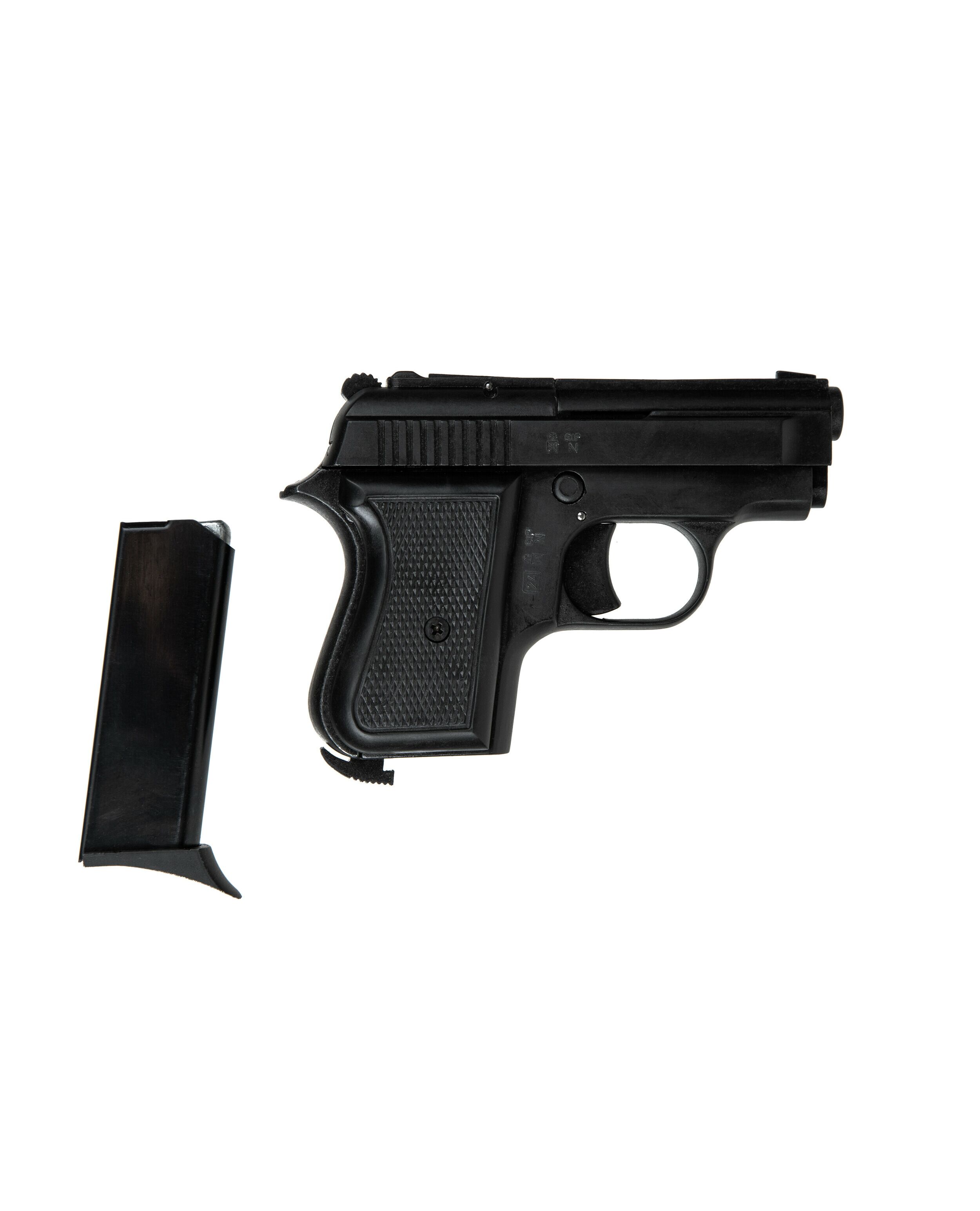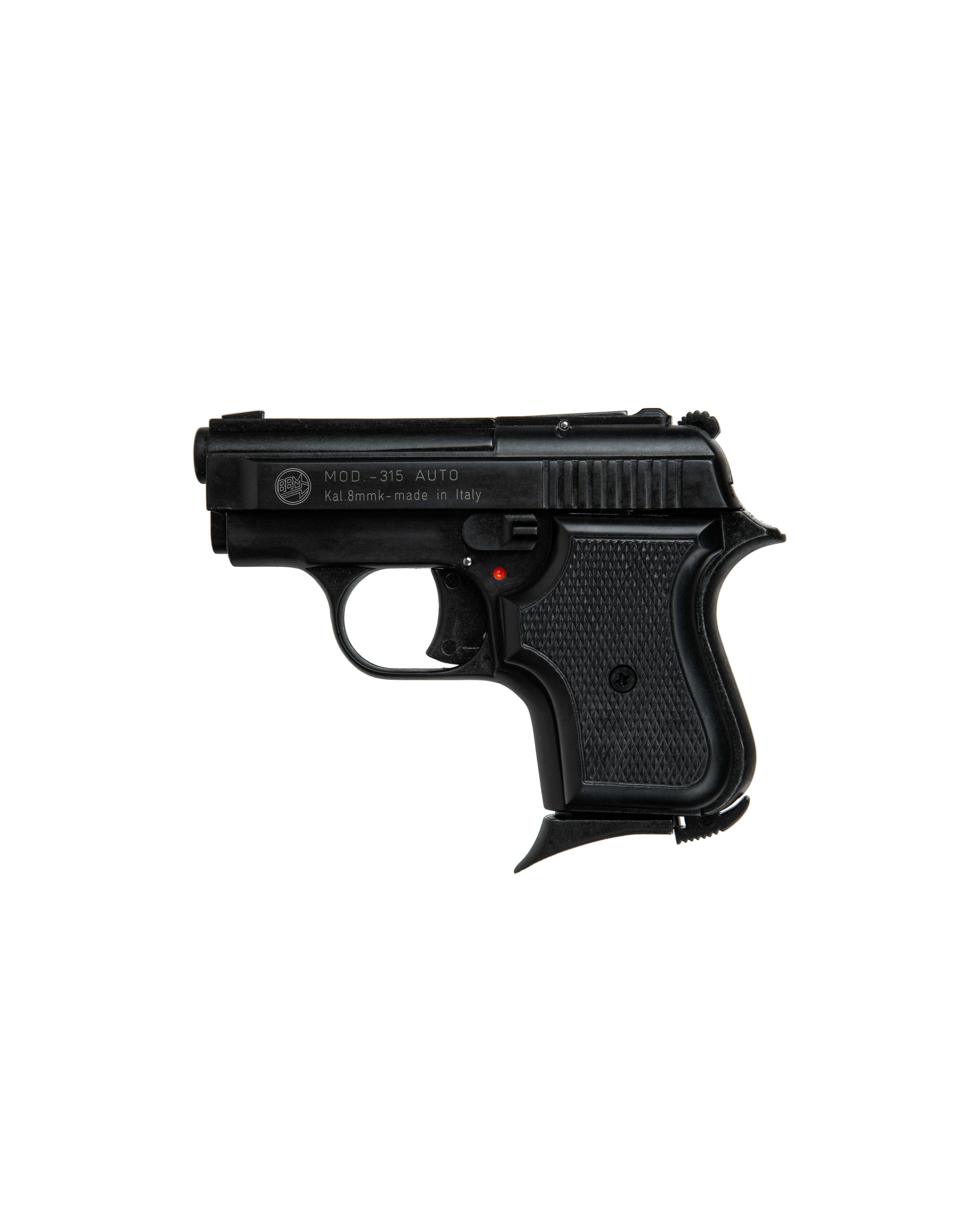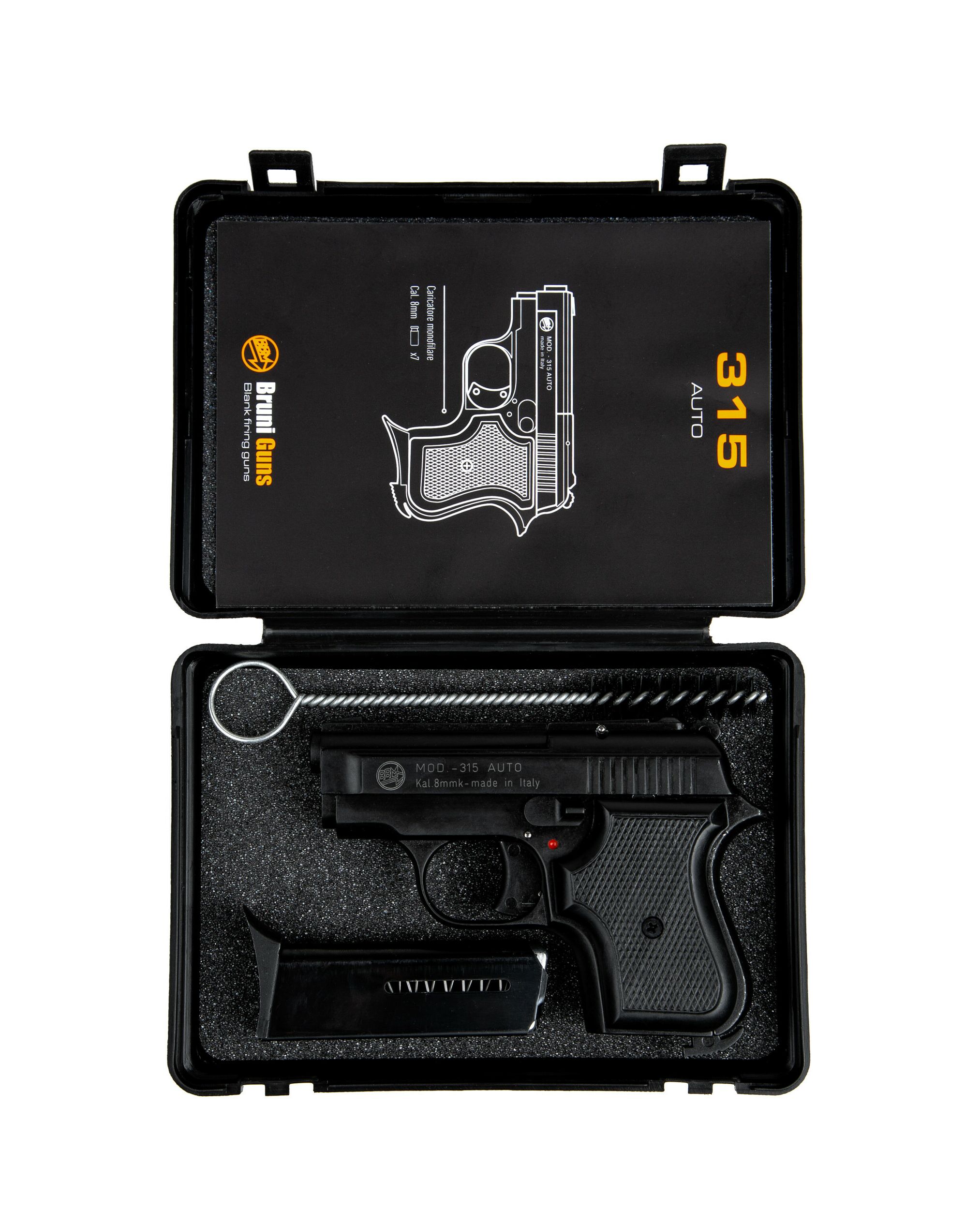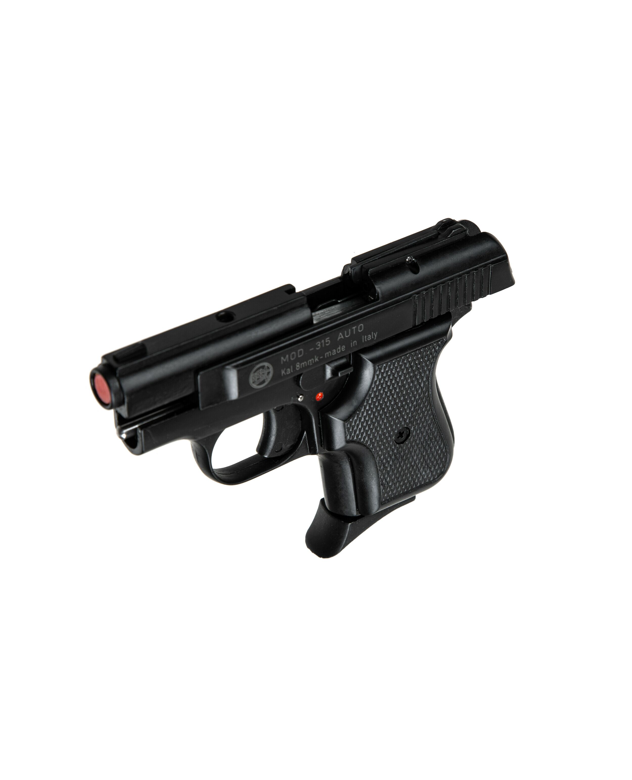 Сигнальный пистолет от компании Bruni 315 кал.8 является репликой на мини пистолеты Beretta. Данное приспособление предназначено для отстрела холостых патронов калибра 8мм. Затвор и рама выполнены из цинкового сплава, что имитирует вес пистолета приближенный к оригиналу. Накладки на рукоядь выполнены из пластика. УСМ по способу взвода, одинарного действия (Single Action) - нажатие на спусковой крючок не взводит курок, а просто совершает выстрел, взвод курка происходит за счёт движения затвора. Также пистолет оборудован ручным предохранителем.
