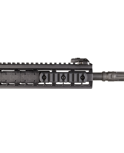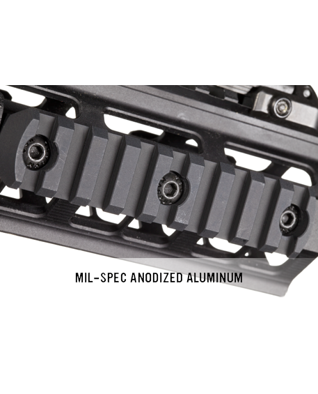 M-LOK™ ALUMINUM RAIL, 9 SLOTS – направляющая стандарта 1913 Picatinny. Изготовлена из алюминия, способна выдерживать серьезные ударные нагрузки. Предназначена для установки различных аксессуаров (рукояти переноса огня, крепления для фонарей и лазерных целеуказателей и т.д.). Подходит для использования с цевьями системы M-LOK.
