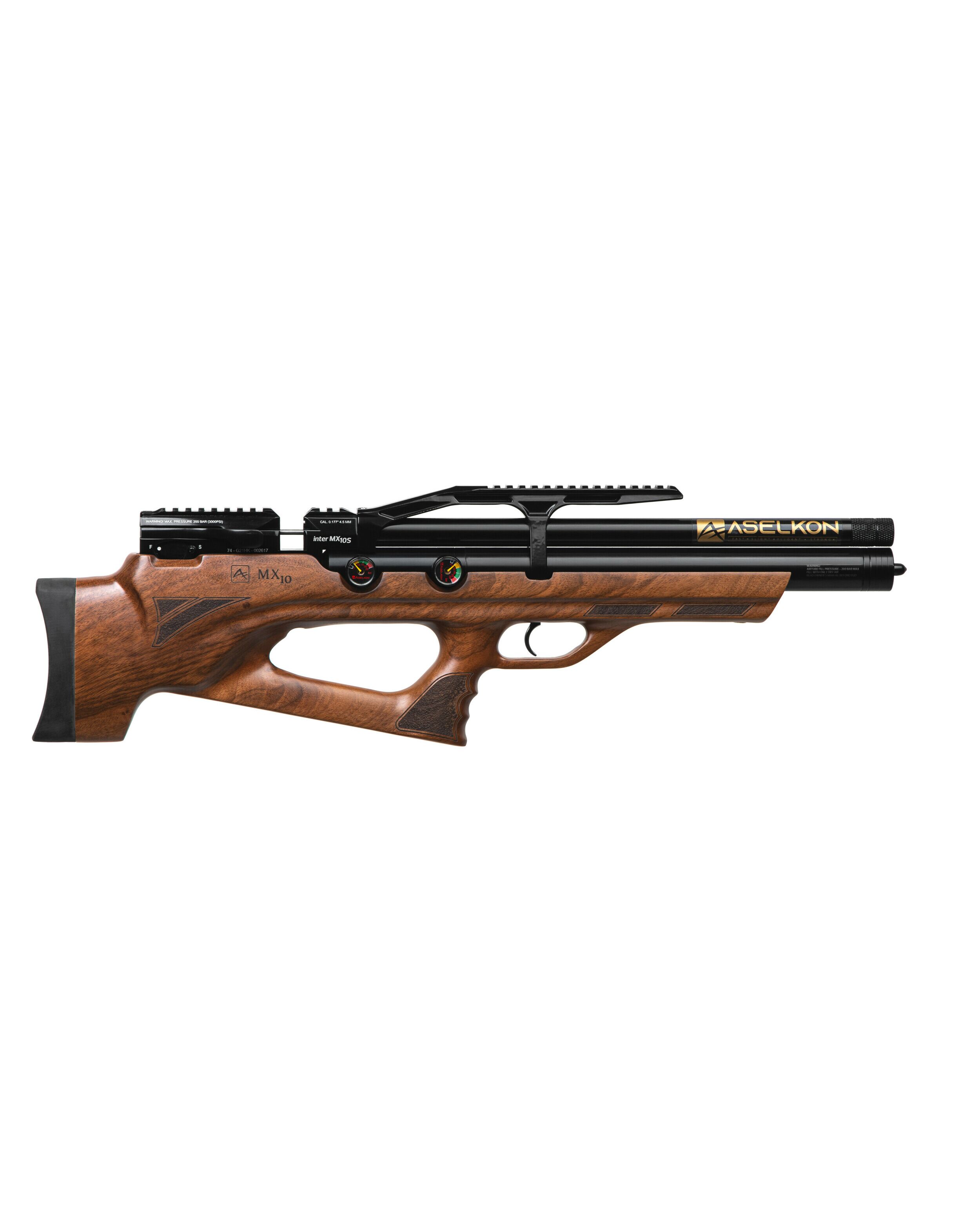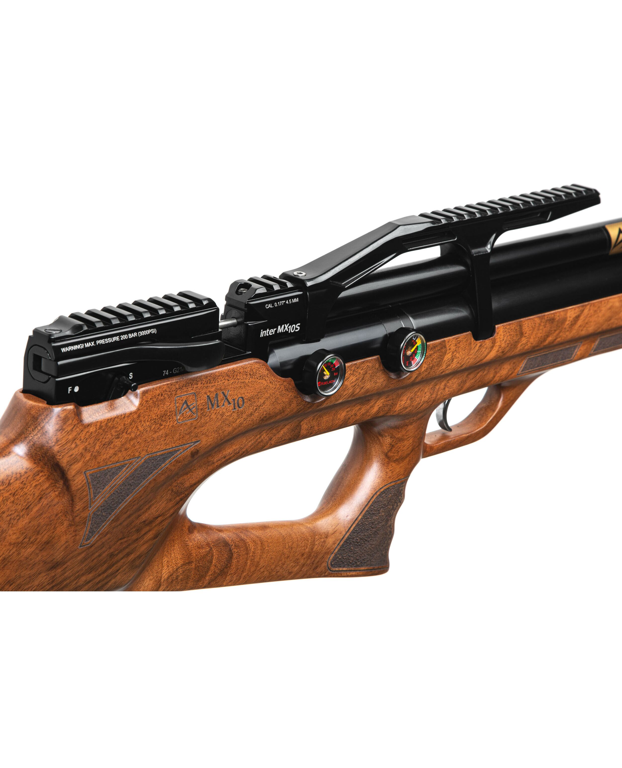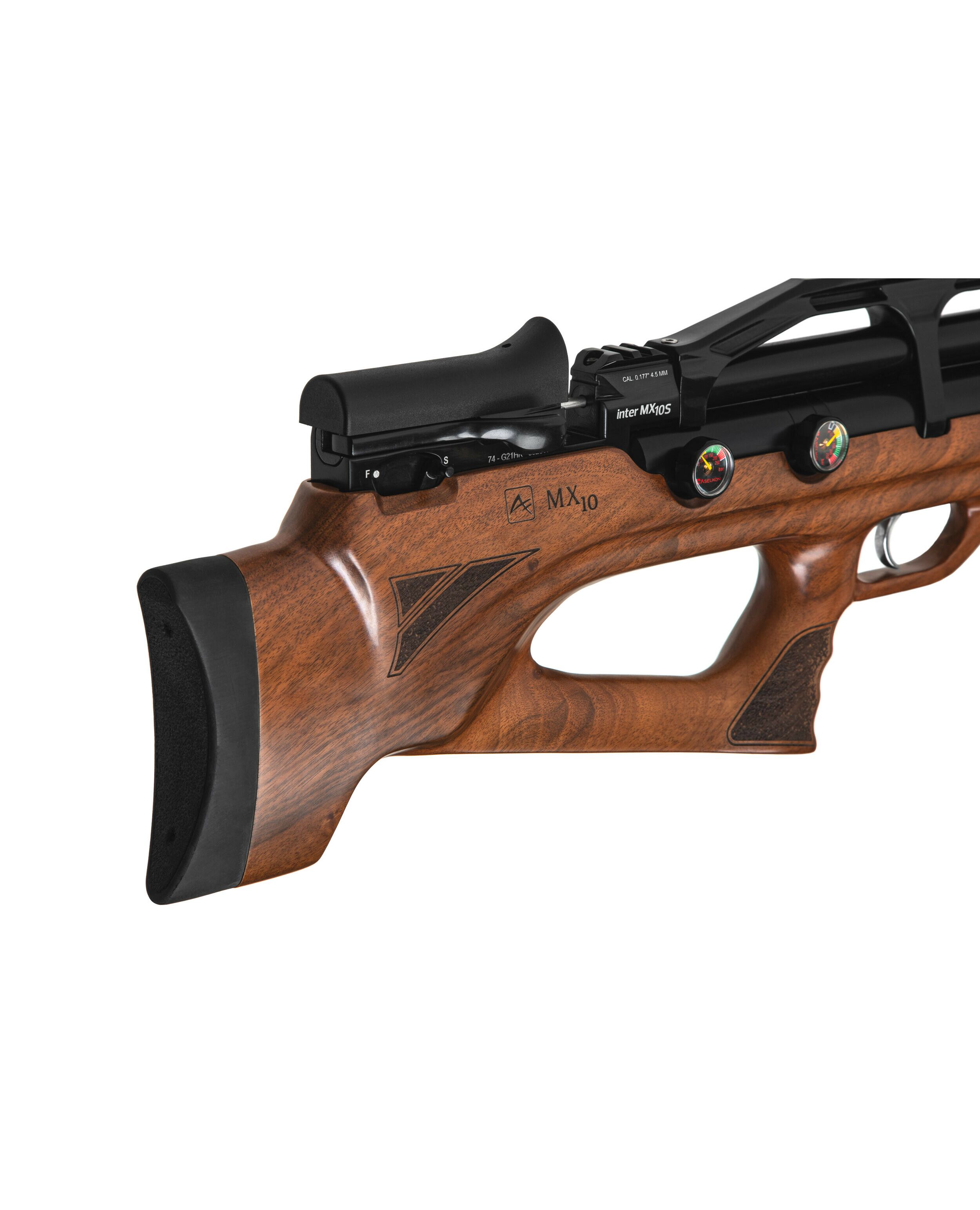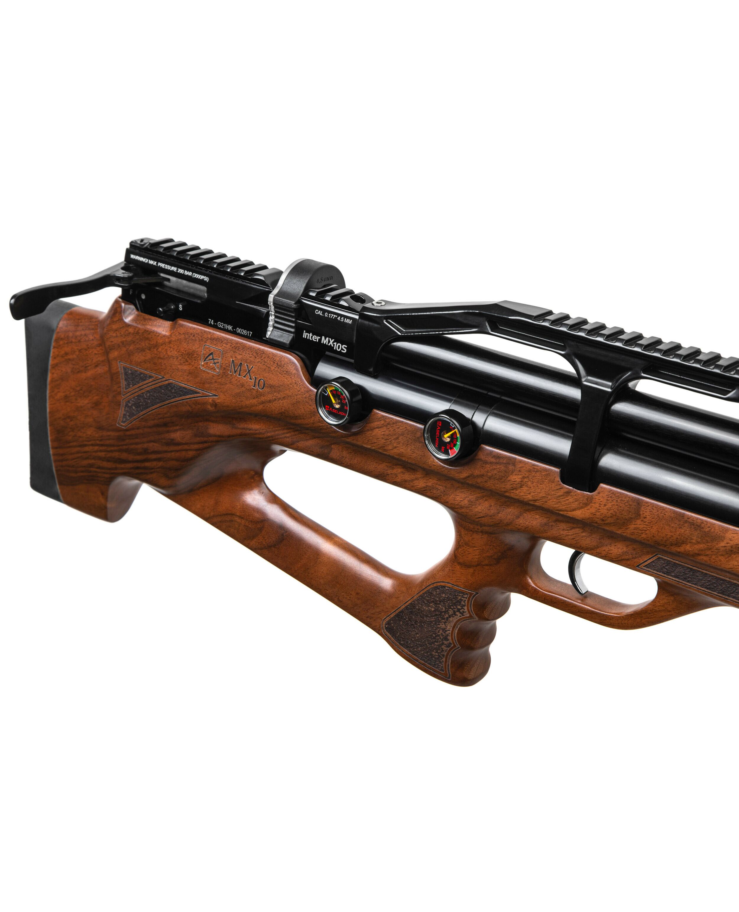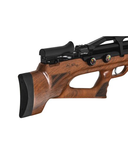 Пневматическая Редукторная PCP винтовка Aselkon MX10-S Wood - ложе с регулируемым подщёчником и эргономичной рукоятью для более удобного хвата, выполнено из дерева (орех), имеет мягкий затыльник не только смягчающий и без того незначительную отдачу, но и обеспечивает более удобную вкладку, благодаря чему вы сможете вести более кучную и прицельную стрельбу. Компоновка выполнена по схеме булл-пап, что позволило сократить общую длину винтовки. При этом в отличии от модели МХ-7 был так же укорочен ствол, что сделало винтовку ещё более компактной и манёвренной. Теперь стрелять из положения стоя и с колена стало ещё более комфортно. Общая длинна этой винтовки составляет всего 650мм., а ствола 450мм. Винтовка хорошо сбалансирована и весит 3580гр. Встроенный баллон объемом 275куб. см. на 20% больше чем у других винтовок этого класса, и обеспечивает максимальное давление в 200бар. Это, в сочетании со встроенным редуктором, позволяет сделать около 90 выстрелов с одной заправки, что является отличным показателем, позволяя всецело насладиться стрельбой, и тратить минимум времени на подготовку винтовки к стрельбе. У винтовки нет открытых прицельных приспособлений, но она имеет встроенную планку Пикатинни, для крепления различных оптических прицелов. Благодаря этому вы не стеснены в выборе и сможете подобрать наиболее подходящий Вам прицел. В передней нижней части цевья есть технологическое отверстие с винтом, позволяющее установить сошки, либо дополнительную планку Пикатинни для крепления различных приспособлений (Фонарь, ЛЦУ и т.п.). Начальная скорость вылета пули составляет в среднем 264м.с., а энергия 22Дж. Что является очень хорошим показателем, по сравнению с большинством винтовок данного класса. Взвод винтовки, осуществляется при помощи затвора, рычажного типа, позволяя не сводить глаз с мишени, и вносить соответствующие поправки при стрельбе. Ручной предохранитель расположен чуть ниже затвора, и позволяет перевести винтовку в режим огня одним движением, сразу после взвода. Регулируемый спусковой крючок позволяет подстроить плавность спуска специально для вас, что также сказывается на точности в лучшую сторону. Поставляется в пластиковом кейсе, довольно прочном и удобном для транспортировки. В комплект поставки входят два магазина на 14 пулек, барабанного типа, но также есть возможность стрельбы одиночными выстрелами, путём прямого заряжания. Одним словом - качественная, сбалансированная РСР винтовка в данном ценовом сегменте, которая придётся по вкусу, как новичкам, так и опытным стрелкам. Прекрасно подойдёт как для спортивной стрельбы по мишеням, так и развлекательной стрельбы, по баночкам, на природе.