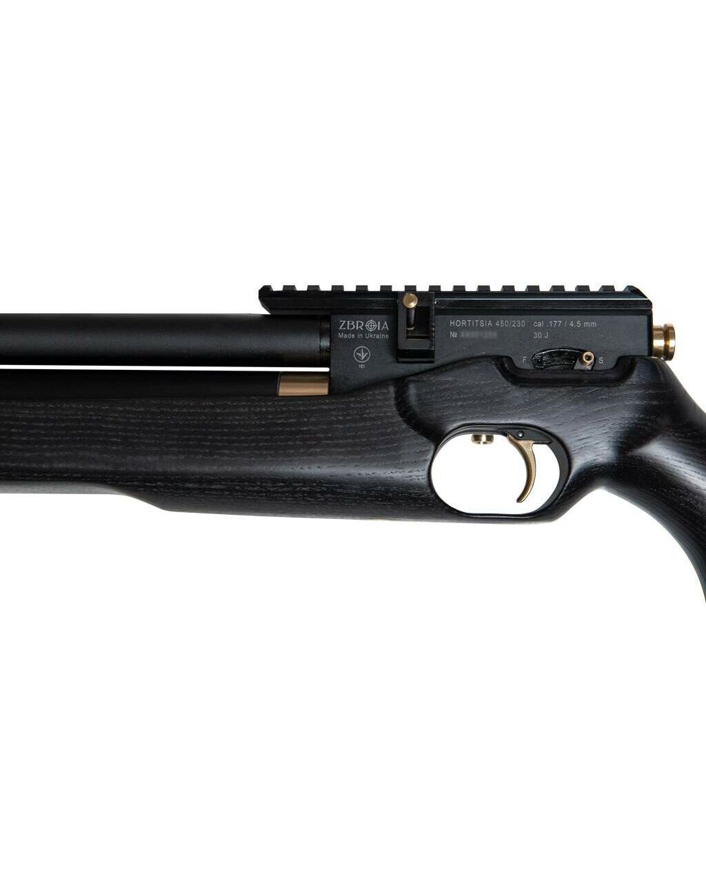 Хортица 450/230 — винтовка с предварительным накачиванием резервуара от украинской компании ZBROIA (ЗБРОЯ), город Харьков. Данная модель — новинка конца 2021 года. Она имеет видоизменённый внешний вид и принципиально новую проработанную конструкцию, максимально адаптированную для стрелковых и охотничьих задач. Тут сразу нужно отметить, что в Украине охота с пневматической винтовкой запрещена, в отличии от Саудовской Аравии, США, Чили и Перу (страны, в которые экспортируются винтовки ZBROIA).