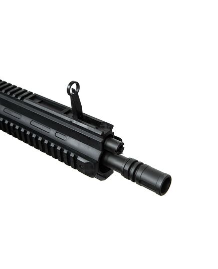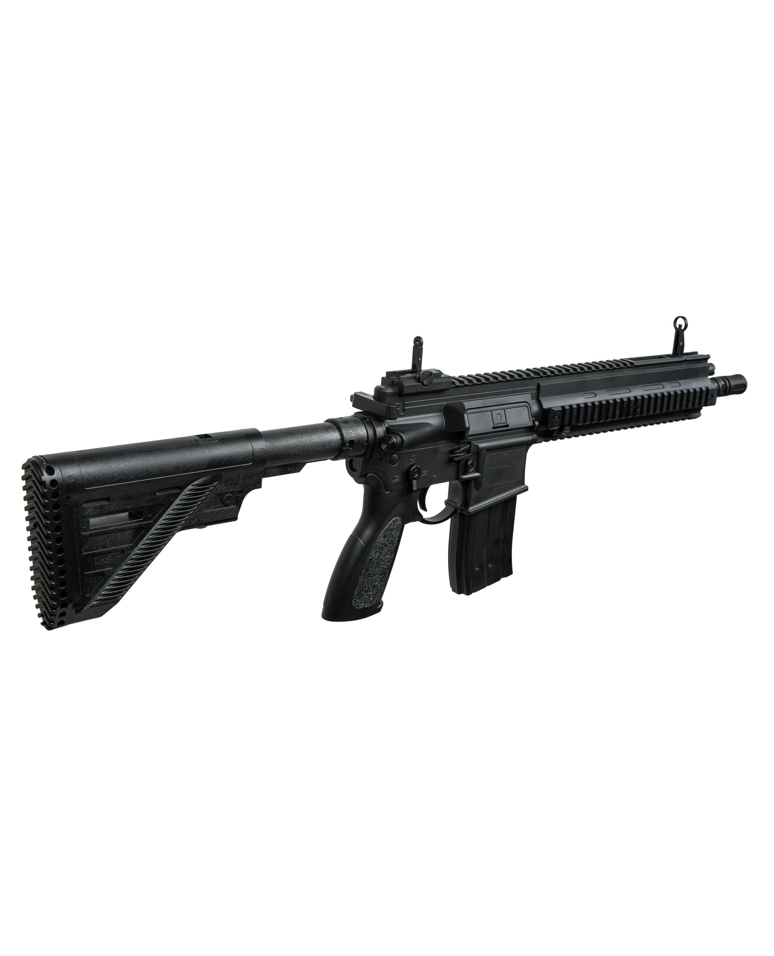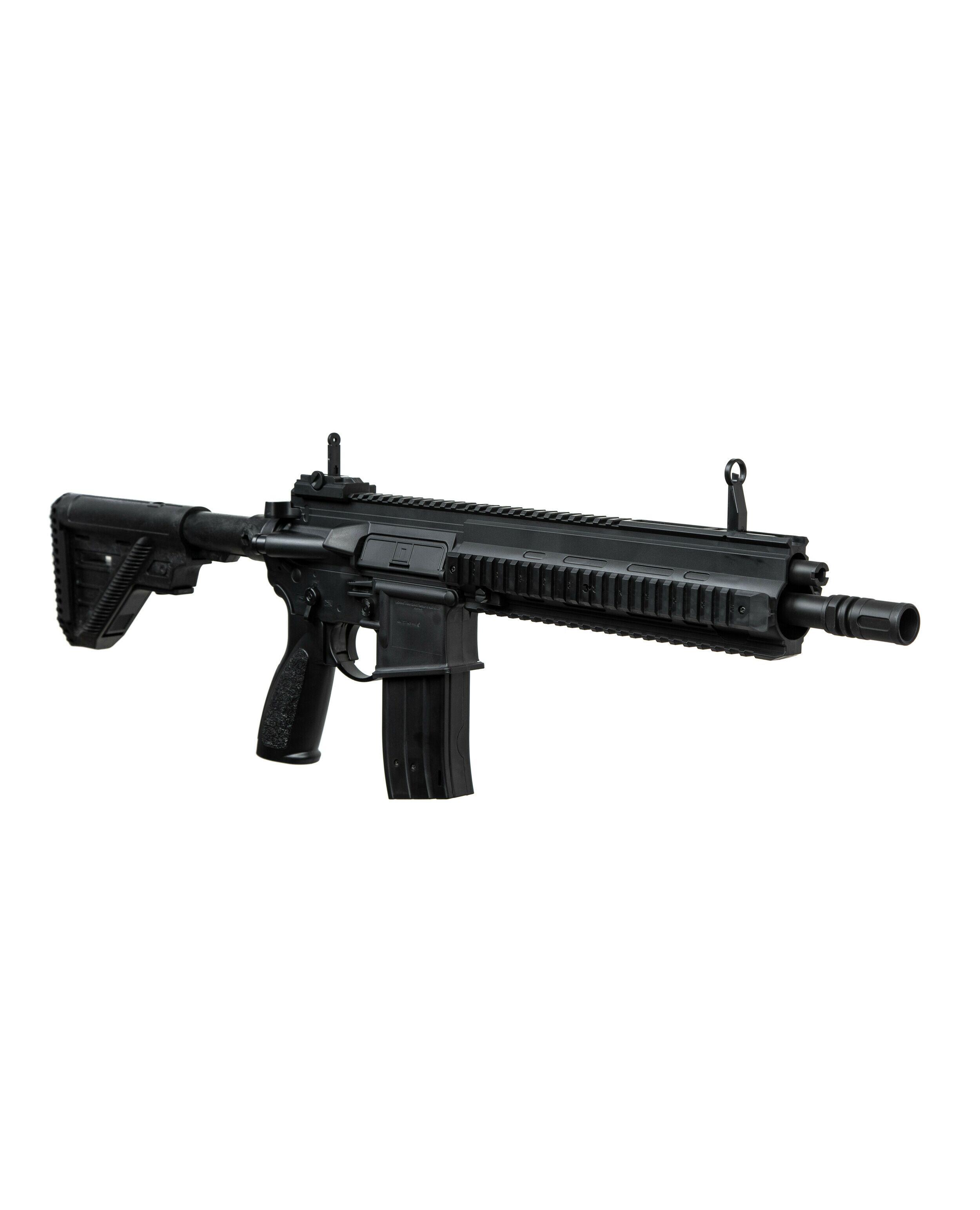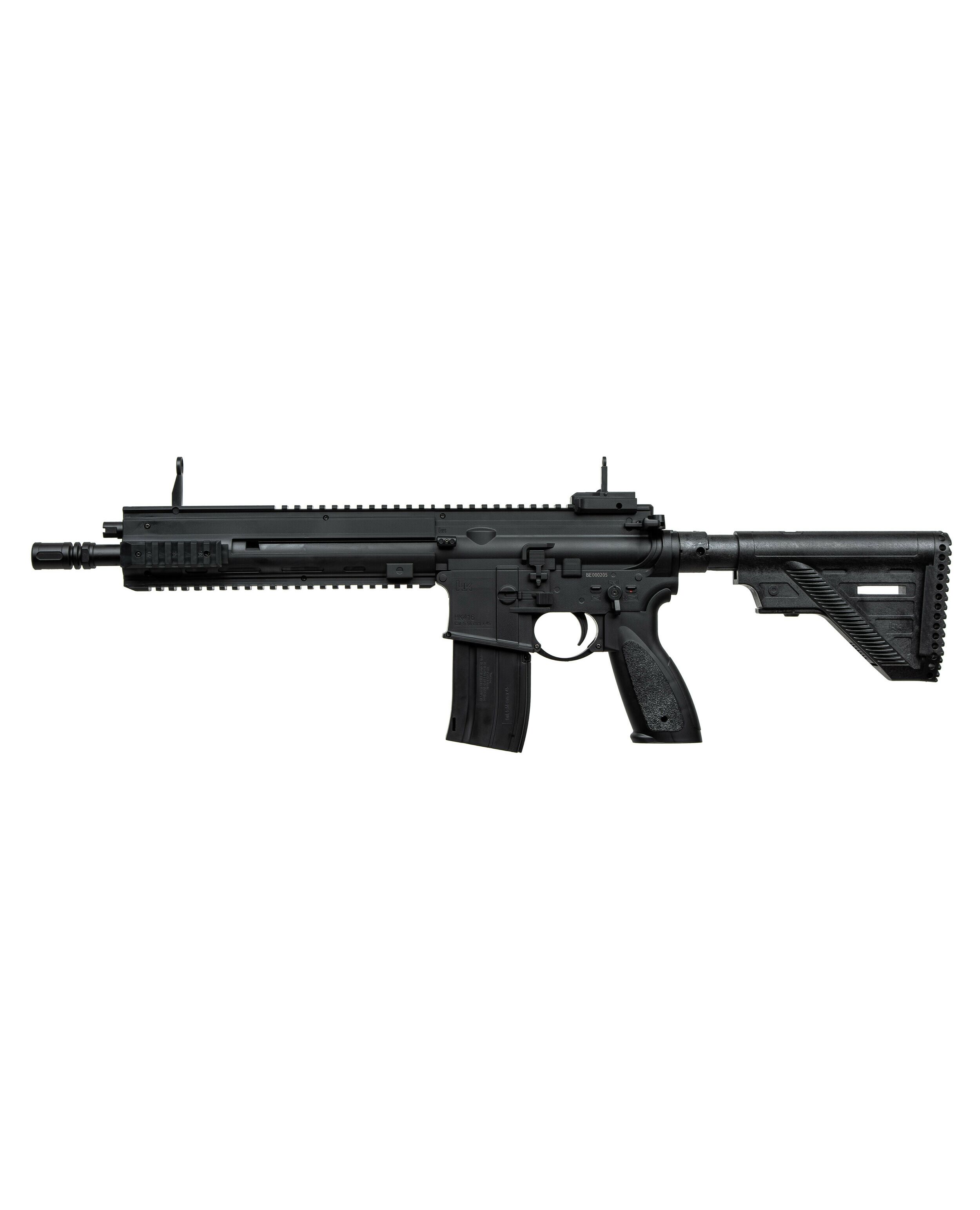 Модель воспроизводит дизайн знаменитой винтовки Heckler & Koch HK416, разработанной немецкой компанией Heckler & Koch на базе американского карабина M4, обеспечивая высокую степень реализма. Изготовлена из прочного и легкого полимера, оборудована металлическим стволом, откидные прицельные приспособления. А четыре планки Picatinny позволяют доукомплектовать дополнительными аксессуарами.