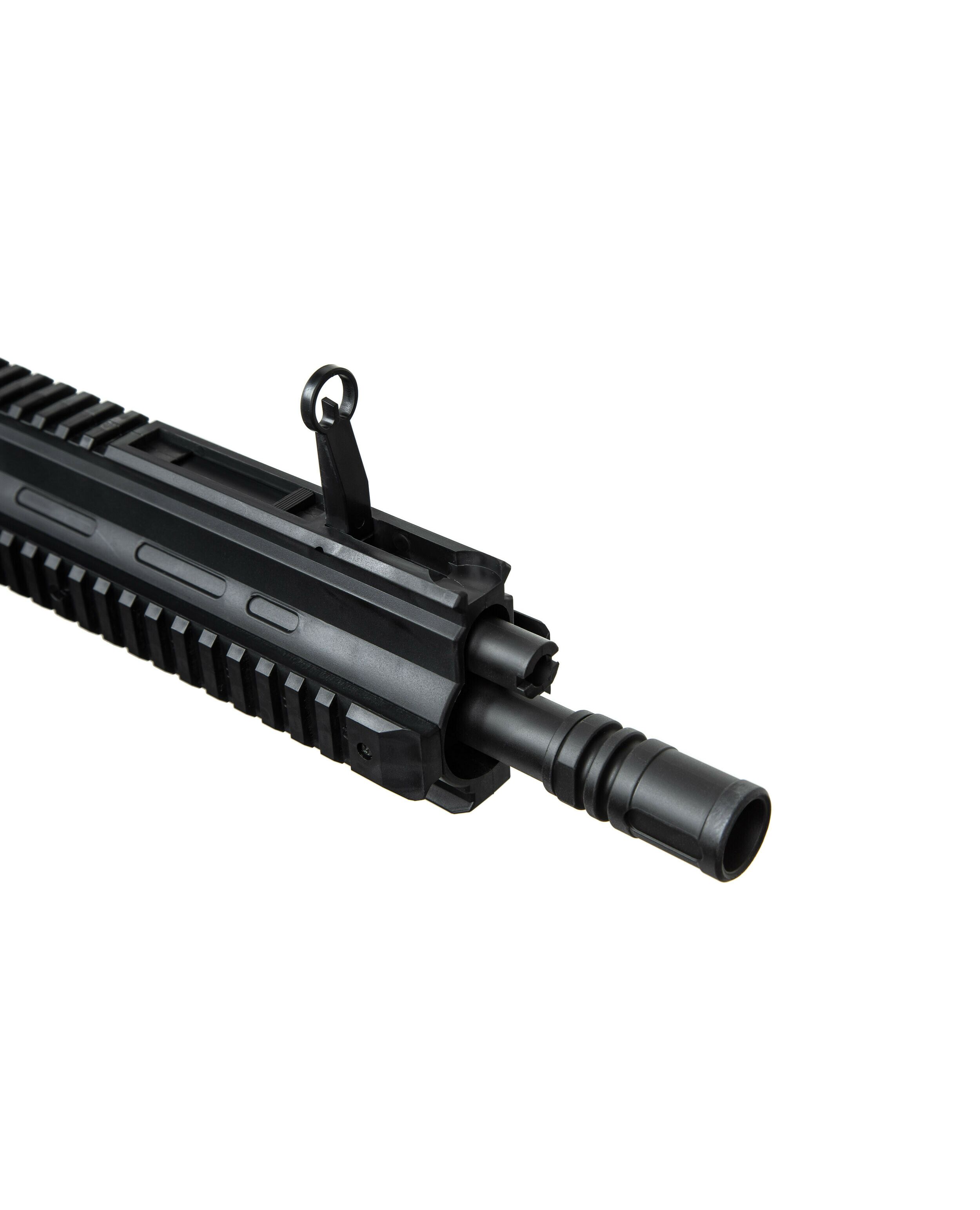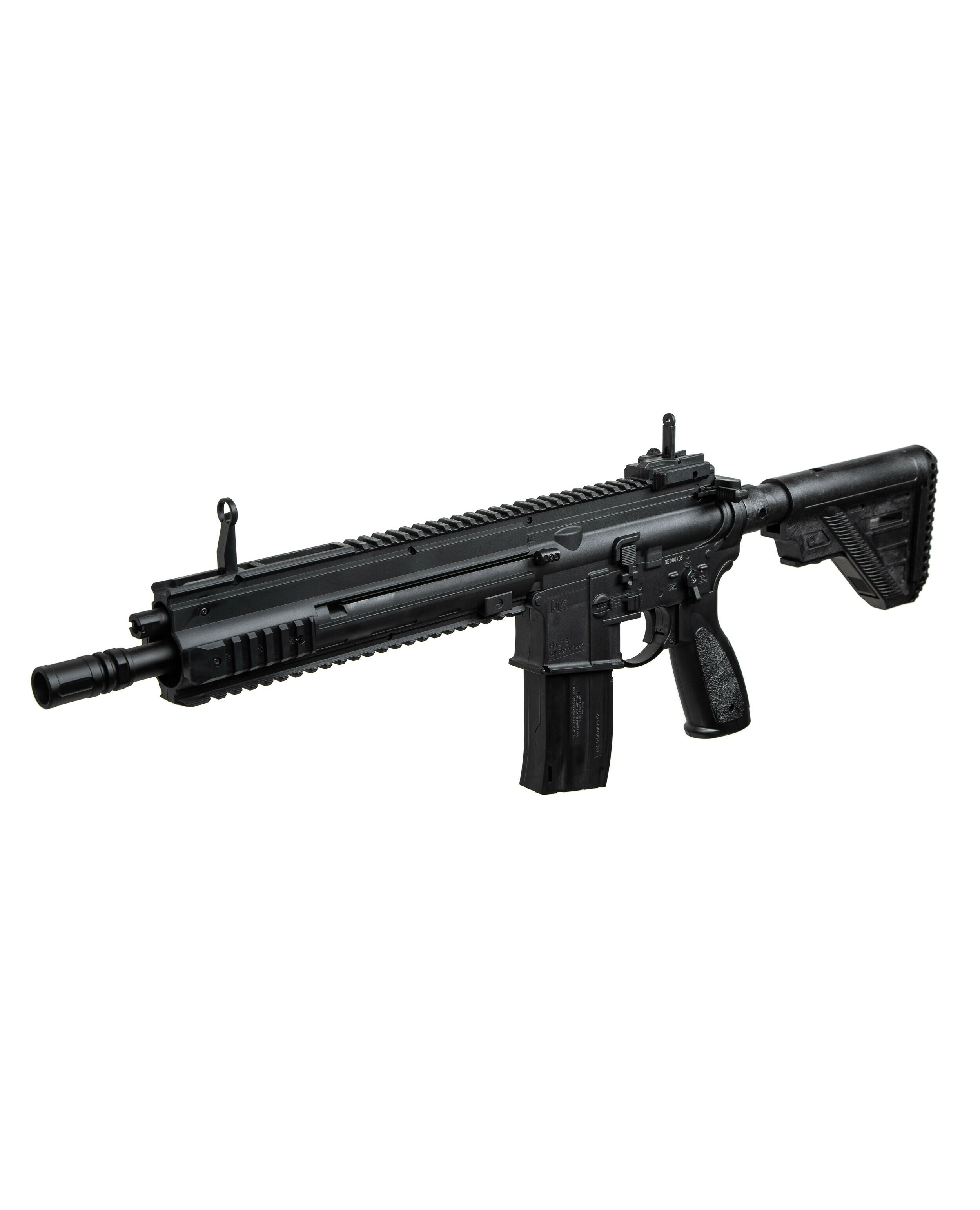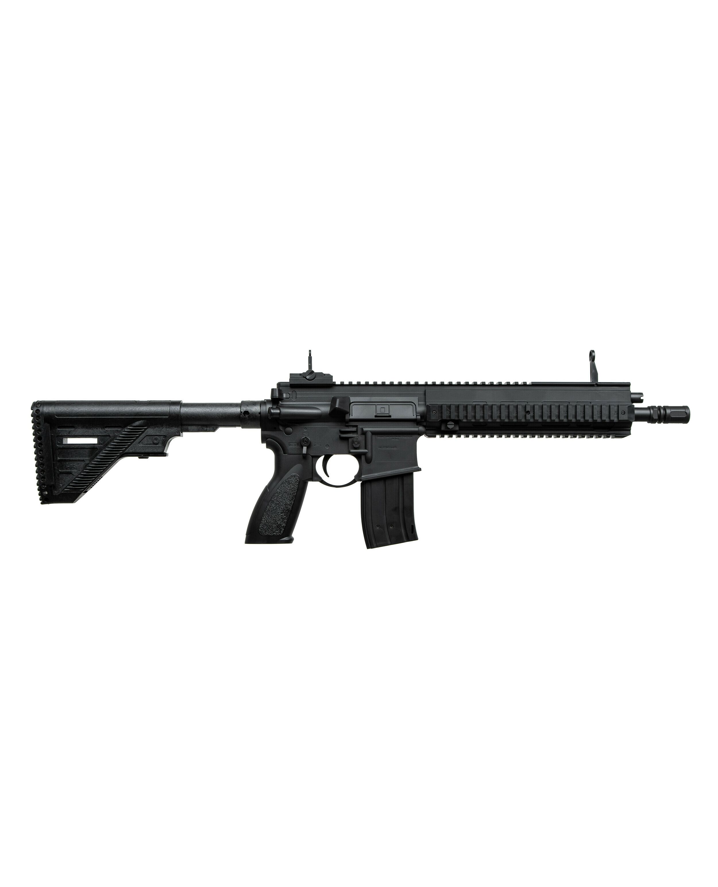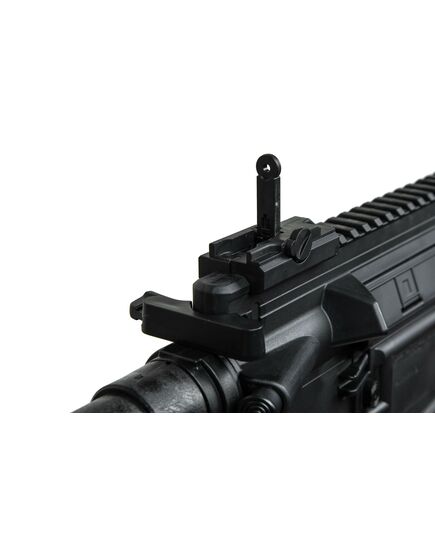 Модель воспроизводит дизайн знаменитой винтовки Heckler & Koch HK416, разработанной немецкой компанией Heckler & Koch на базе американского карабина M4, обеспечивая высокую степень реализма. Изготовлена из прочного и легкого полимера, оборудована металлическим стволом, откидные прицельные приспособления. А четыре планки Picatinny позволяют доукомплектовать дополнительными аксессуарами.