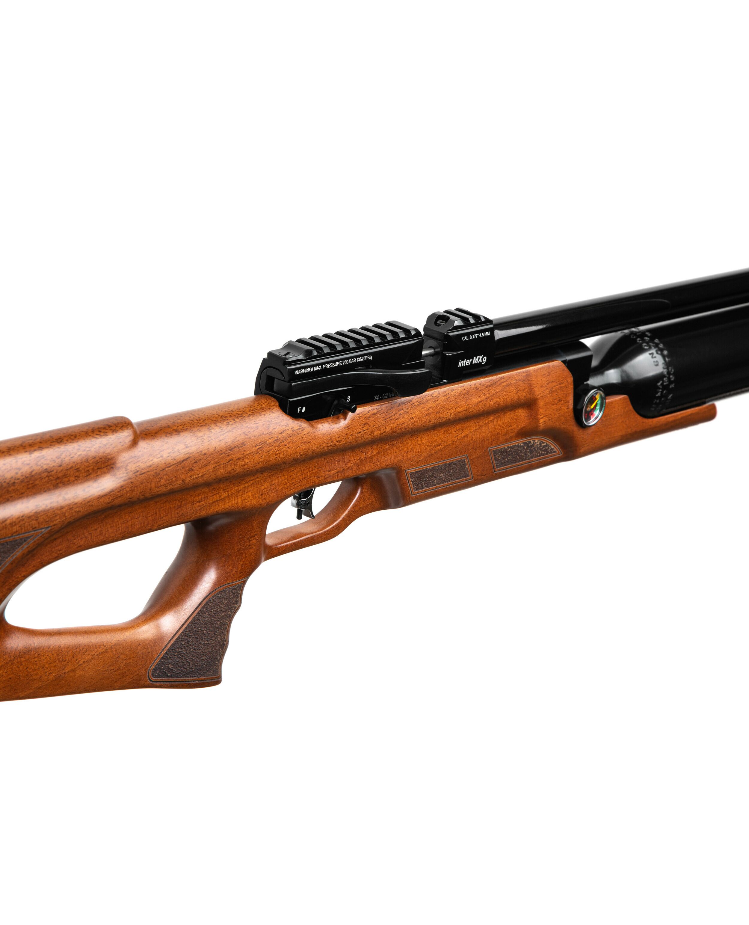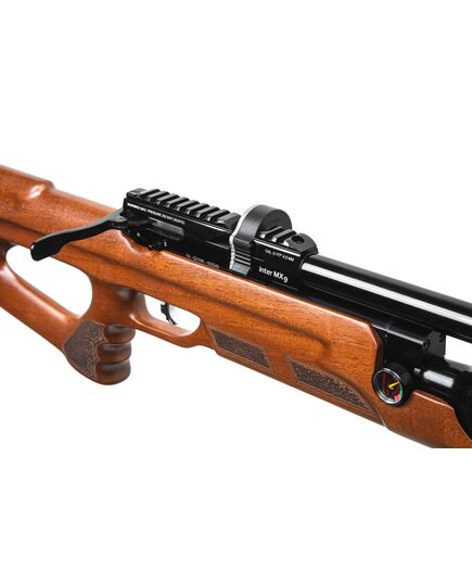 Пневматична Редукторна PCP гвинтівка Aselkon MX9 Sniper Wood - ложе типу Монте-Карло з ергономічним руків'ям для більш зручного хвата, виконано з дерева (горіх), має м'який потиличник, що не тільки пом'якшує і без того незначну віддачу, але і забезпечує більш зручну вкладку, завдяки чому ви зможете вести більш кучну і прицільну стрільбу.