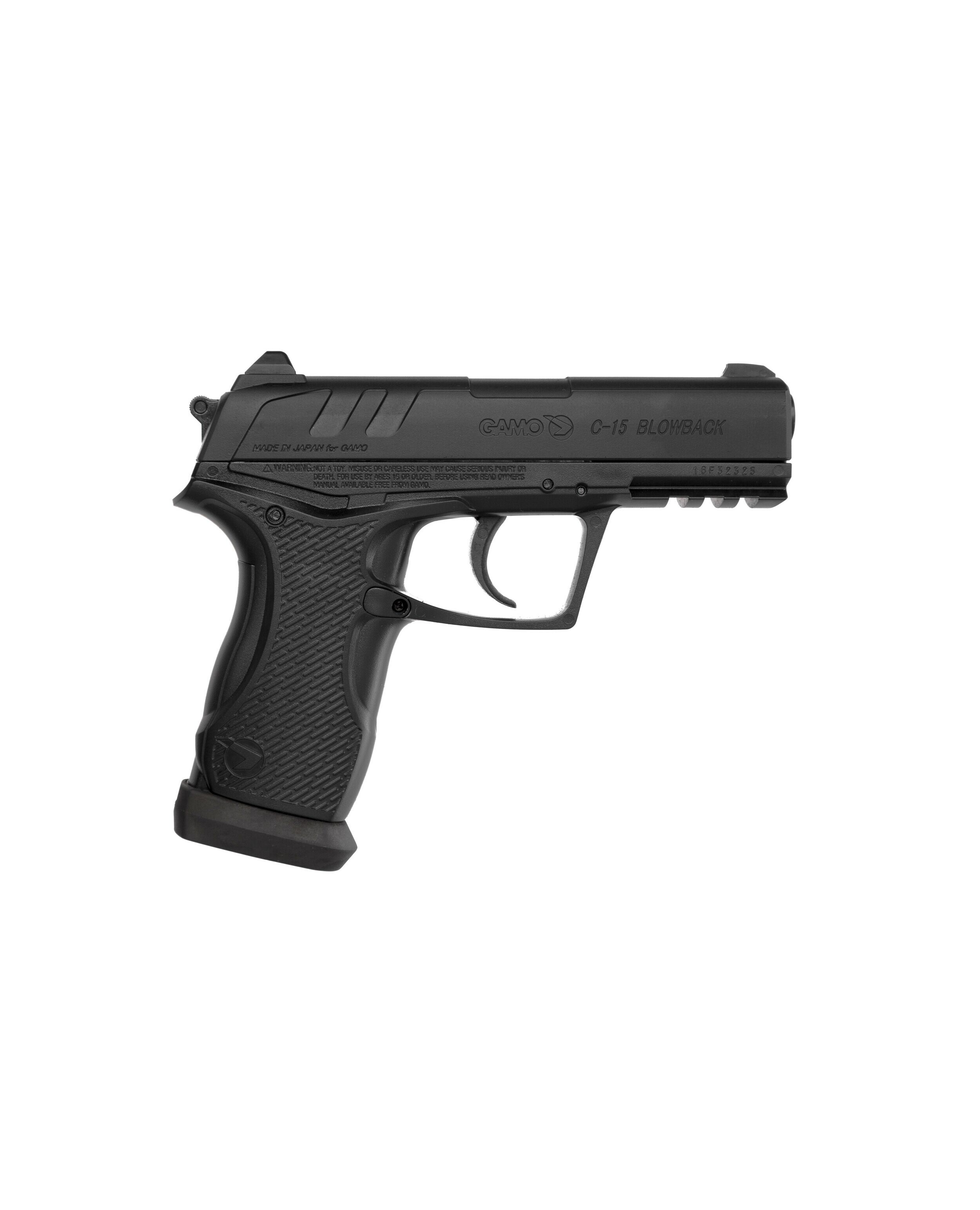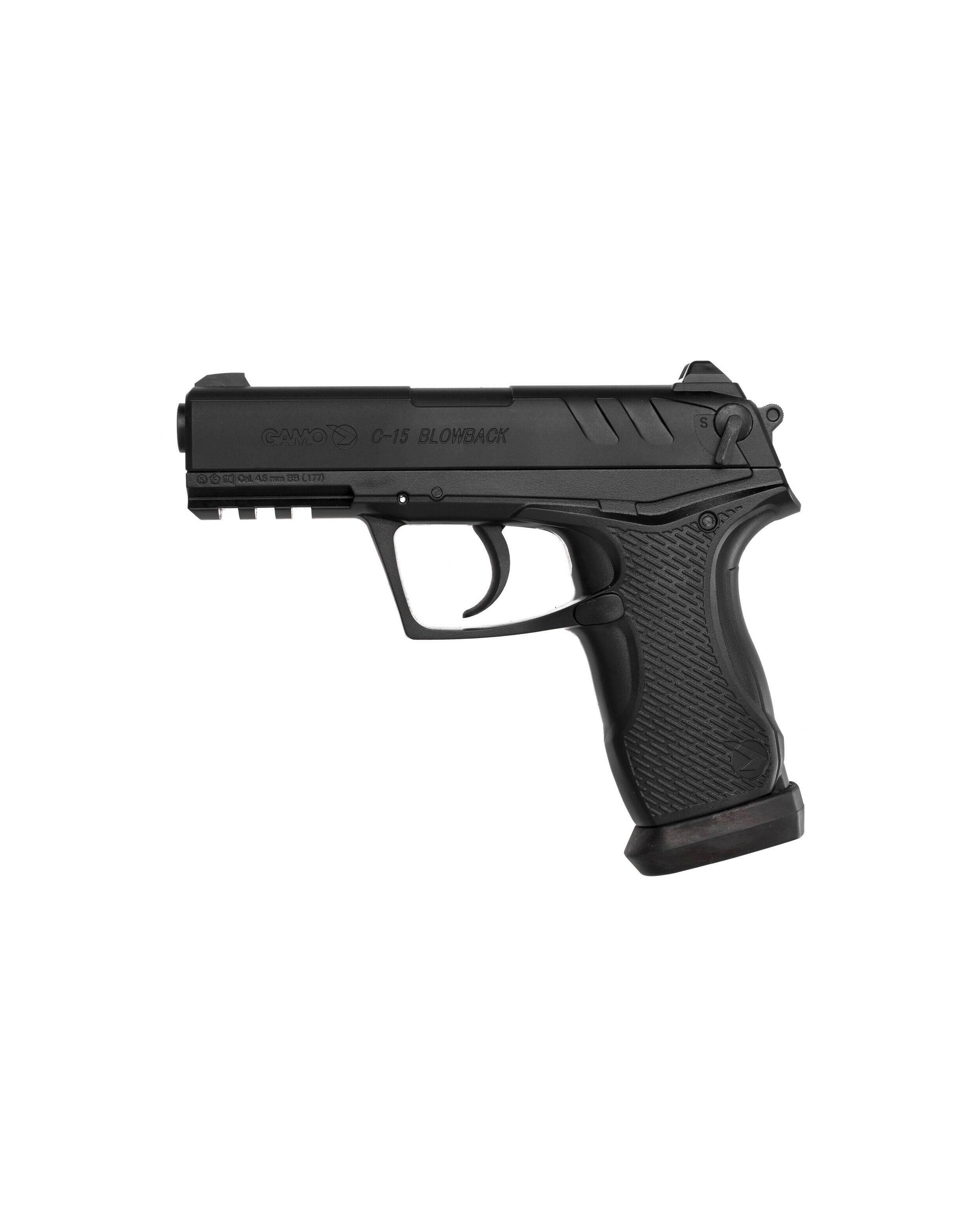 Пневматичний пістолет GAMO C 15 Blowback – напівавтоматичний легкий та компактний пістолет з рухомим затвором. Пневматичний пістолет GAMO C 15 Blowback має рухому раму затвора. Калібр пістолета 4.5 мм. Джерелом енергії є балончик CO2 – 12 г. Нарізний ствол пістолета виготовлений зі збройової сталі. Для стрільби використовуються кульки BB. Магазин вміщує 15 кульок. Швидкість пострілу може досягати 130 м/с. Важить GAMO C– 15 Blowback 680 м. Запобіжник Не автоматичний. Рифлена поверхня руків'я робить стрілянину комфортною та безпечною. Gamo C– 15 Blowback досить простий в застосуванні та обслуговуванні.