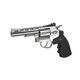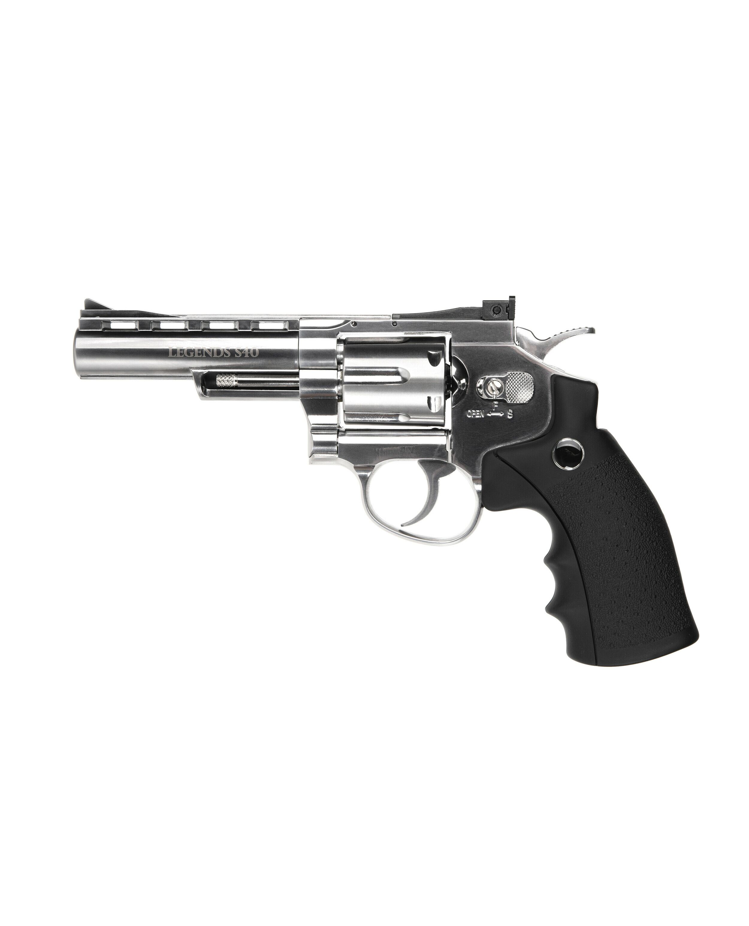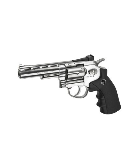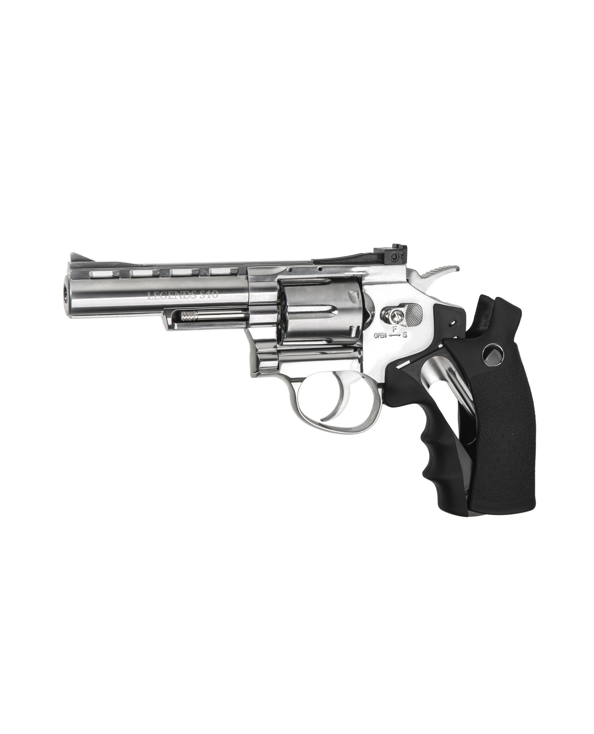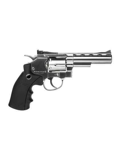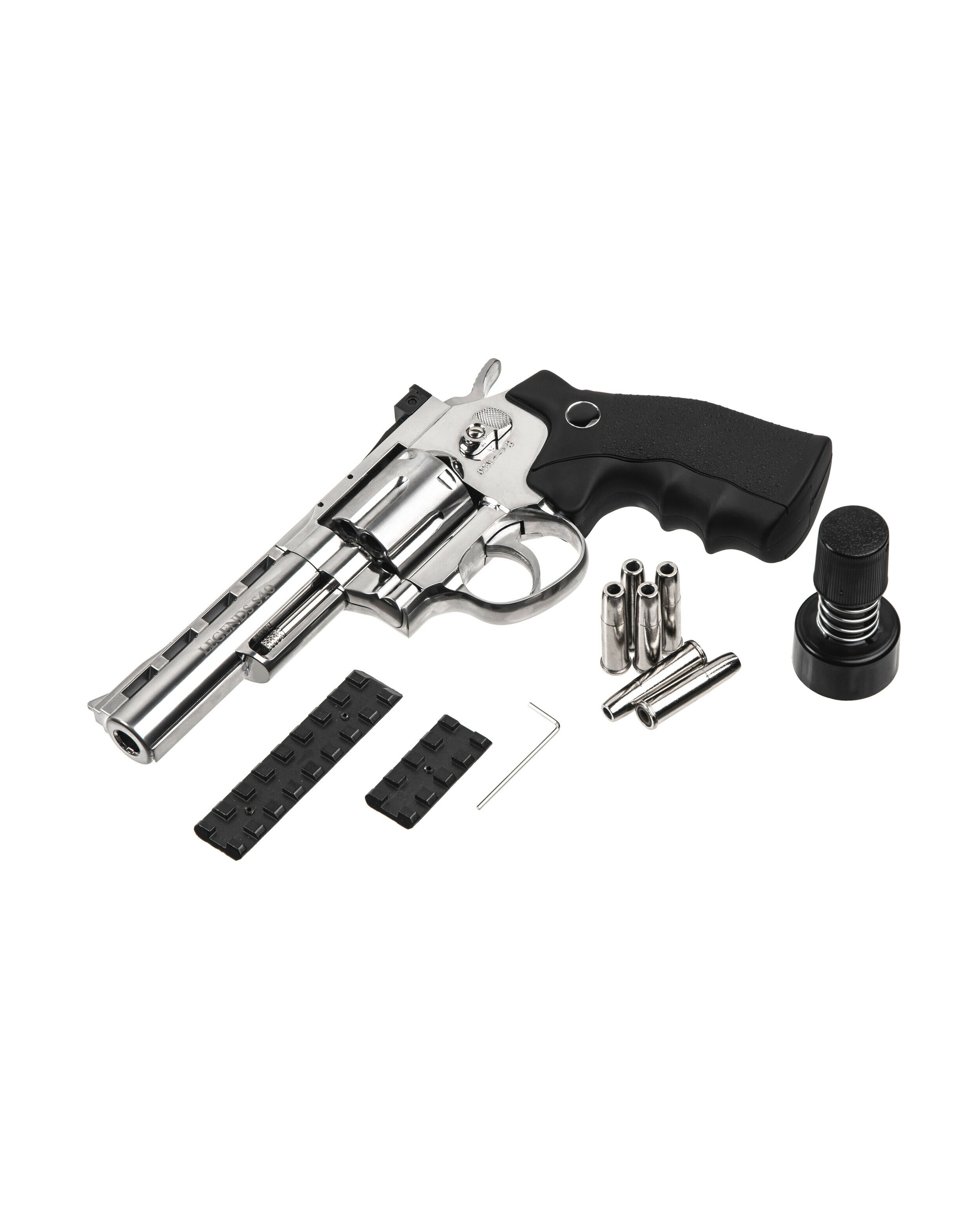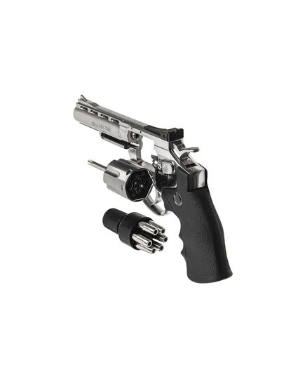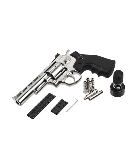 По-настоящему качественный револьвер, цельнометаллический, с блестящей никелированной отделкой. Для аутентичности свинцовые пули Диаболо вставляются в шесть металлических картриджей-патронов, каждый на одну пулю, а ствол нарезной для более точной стрельбы. Целик регулируемый, а фиксатор барабана служит предохранителем при нажатии в противоположном направлении. В комплекте также есть спид-лоадер для быстрого снаряжения картриджей в барабан и сьёмная планка Пикатинни, которую можно установить вместо целика и поставить колиматорный прицел.