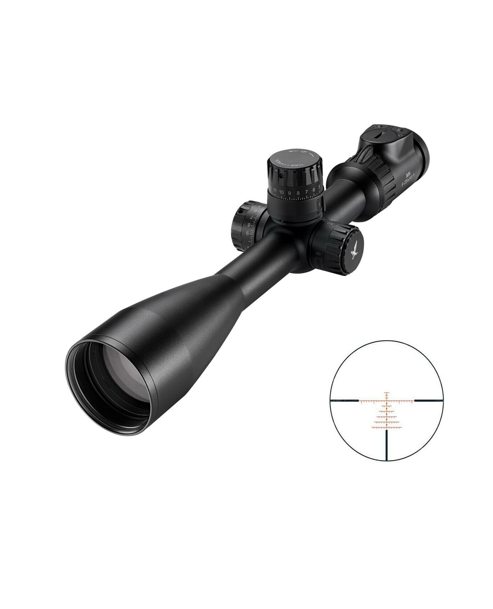 Оптичний приціл X5i 5-25x56 P 1/4 MOA від компанії Swarovski Optik. Приціл виготовлений з високоякісного матеріалу і піддається найсуворішому контролю якості. Вбудовані сталеві деталі та потовщені стінки основної труби забезпечують стабільність при використанні великих калібрів та при екстремальних температурах. Система фіксуючих пружин дозволить оптичному прицілу підтримувати збільшений діапазон регулювання до 160 МОА. Чудова оптична система прицілу дозволяє виконувати точне прицілювання без утоми очей, навіть при тривалому використанні, наприклад, на змаганнях.