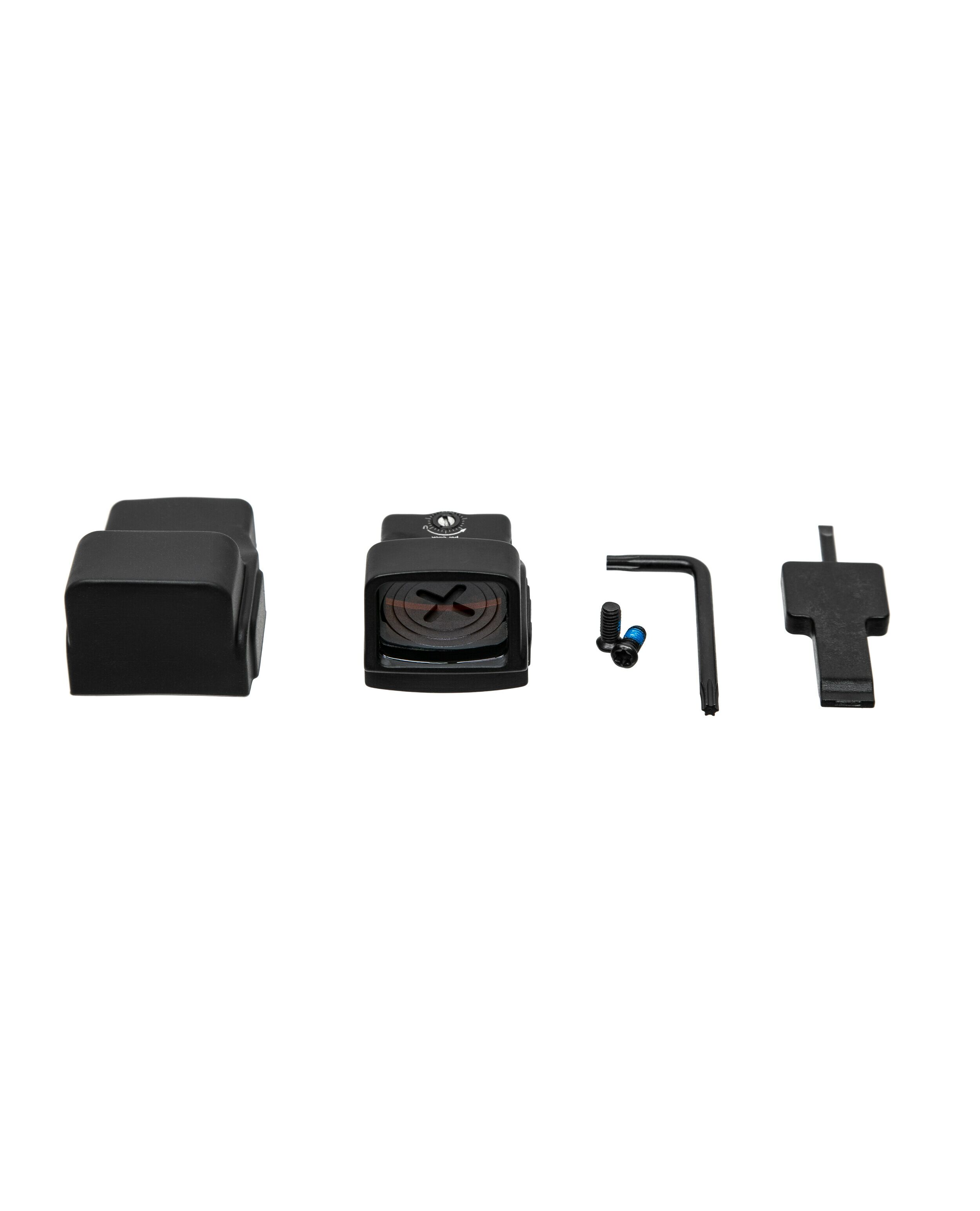 В комплекте: миниатюрный коллиматорный прицел EFLX™, руководство пользователя, ключ торкс, 2 винта M4, батарея CR2032, защитный чехол.