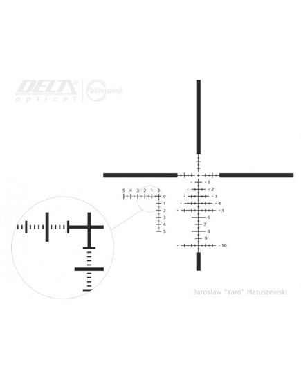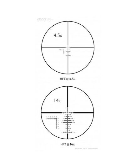 Titanium 4.5-14 × 44 FFP HFT - один з небагатьох прицілів для пневматики з прицільною сіткою в першій фокальній площині. Сама прицільна сітка HFT була розроблена і протестована Ярославом Матушевським. За основу взята класична сітка Mild-Dot, але з додаванням відміток поділів на +/- півмилі, що дозволяє здійснювати оцінку дистанцій і стріляти максимально точно. Налаштування від паралакса розташоване на об'єктиві і дозволяє робити налаштування від 15 метрів і до безкінечності.