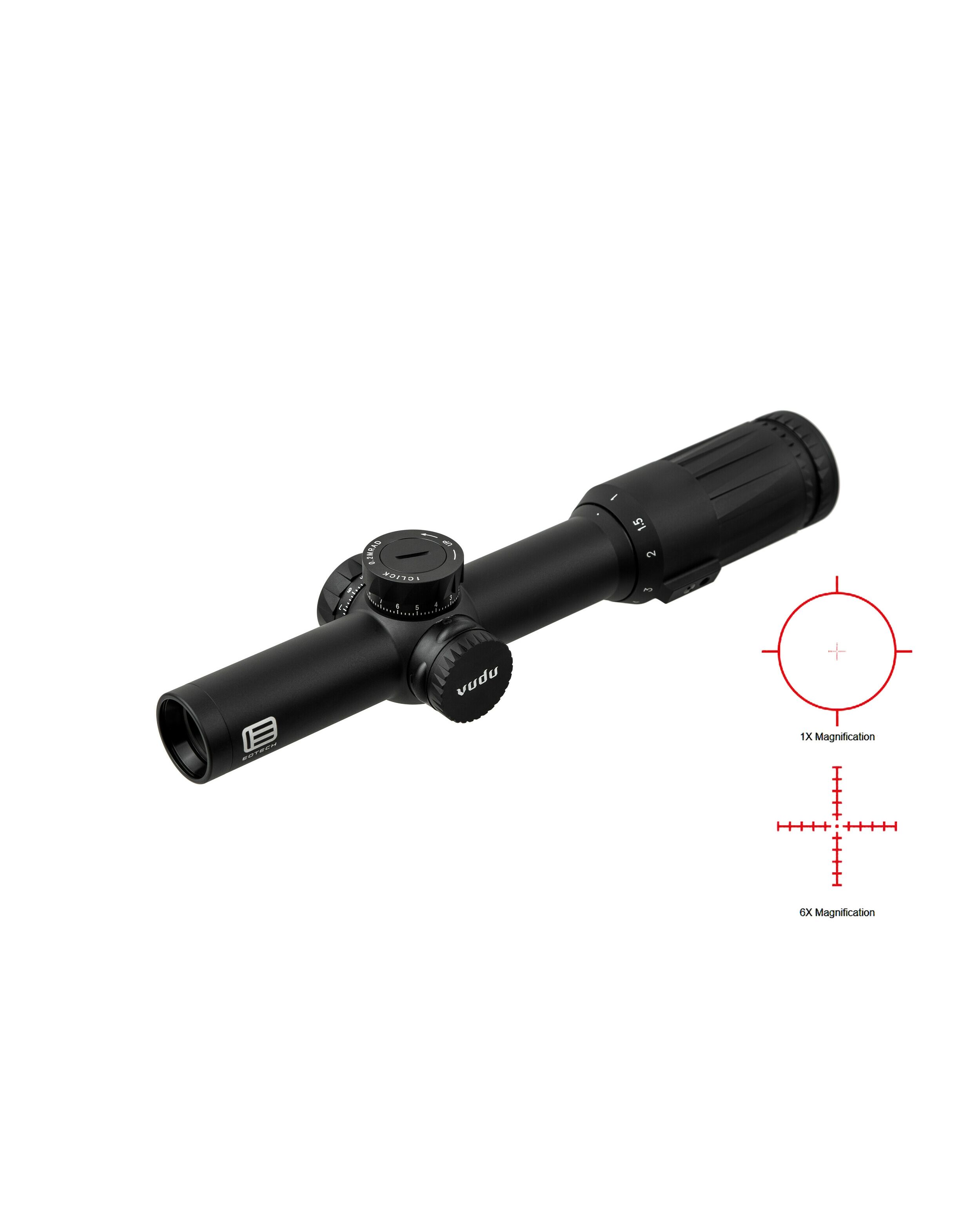 Vudu 1-6X24 в первой фокальной плоскости — идеальное решение для работы на коротких и средних дистанциях. Прицельная сетка EOTECH Speed Ring позволяет быстро поражать цель при малом увеличении, а при более высоком увеличении обеспечивает разрешение и точность, необходимые для более дальних выстрелов.