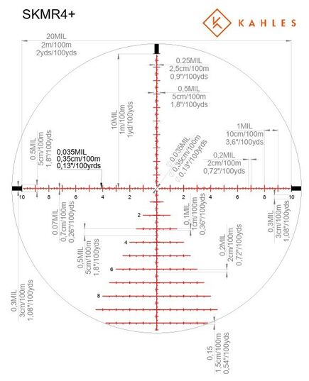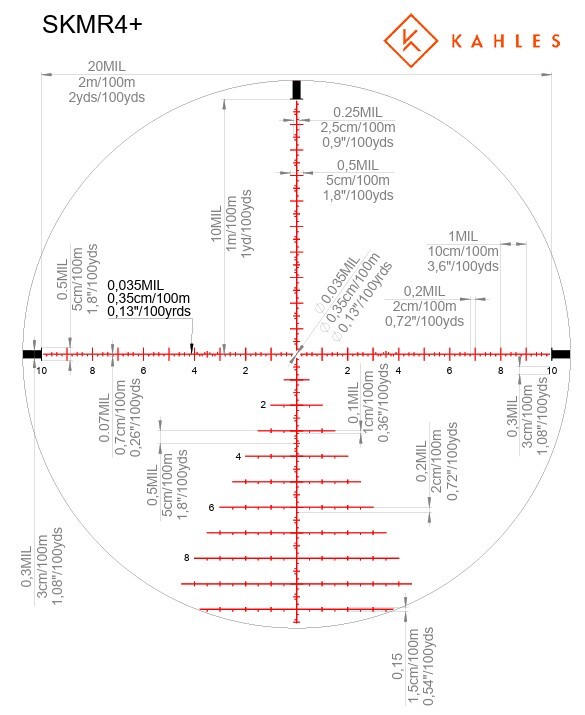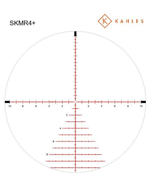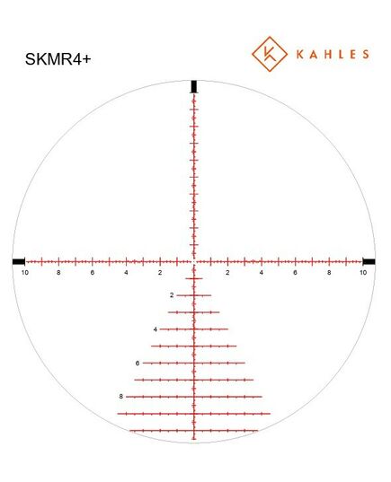 -- Прицельная сетка SKMR4+ в MRAD с подсветкой является сеткой первой фокальной плоскости (FFP), которая позволяет сохранять пропорции сетки независимо от увеличения. Это облегчает определение дистанции и компенсацию ветра или падения шара. Сетка SKMR4+ специально разработана высокоточными стрелками для высокоточных стрелков.