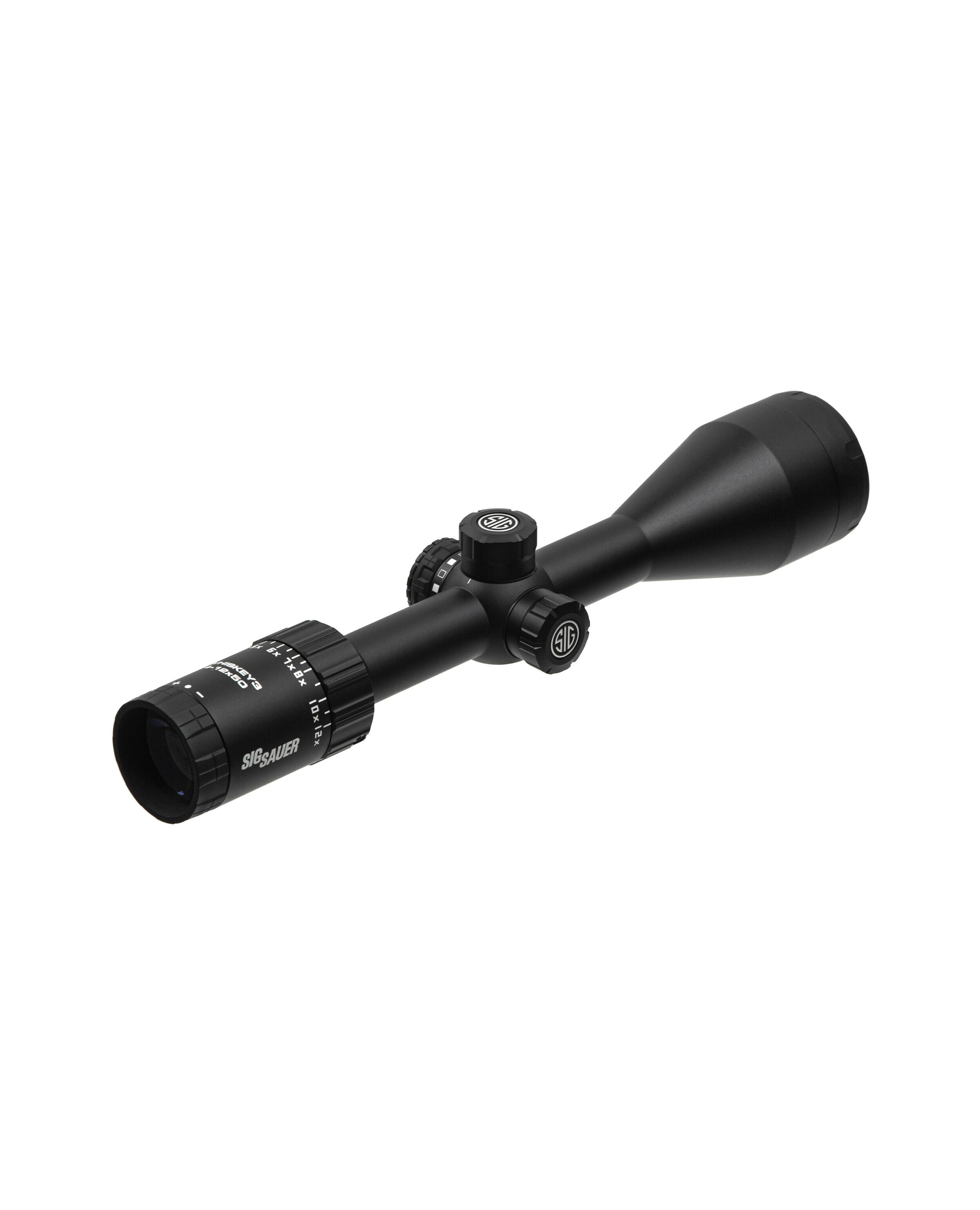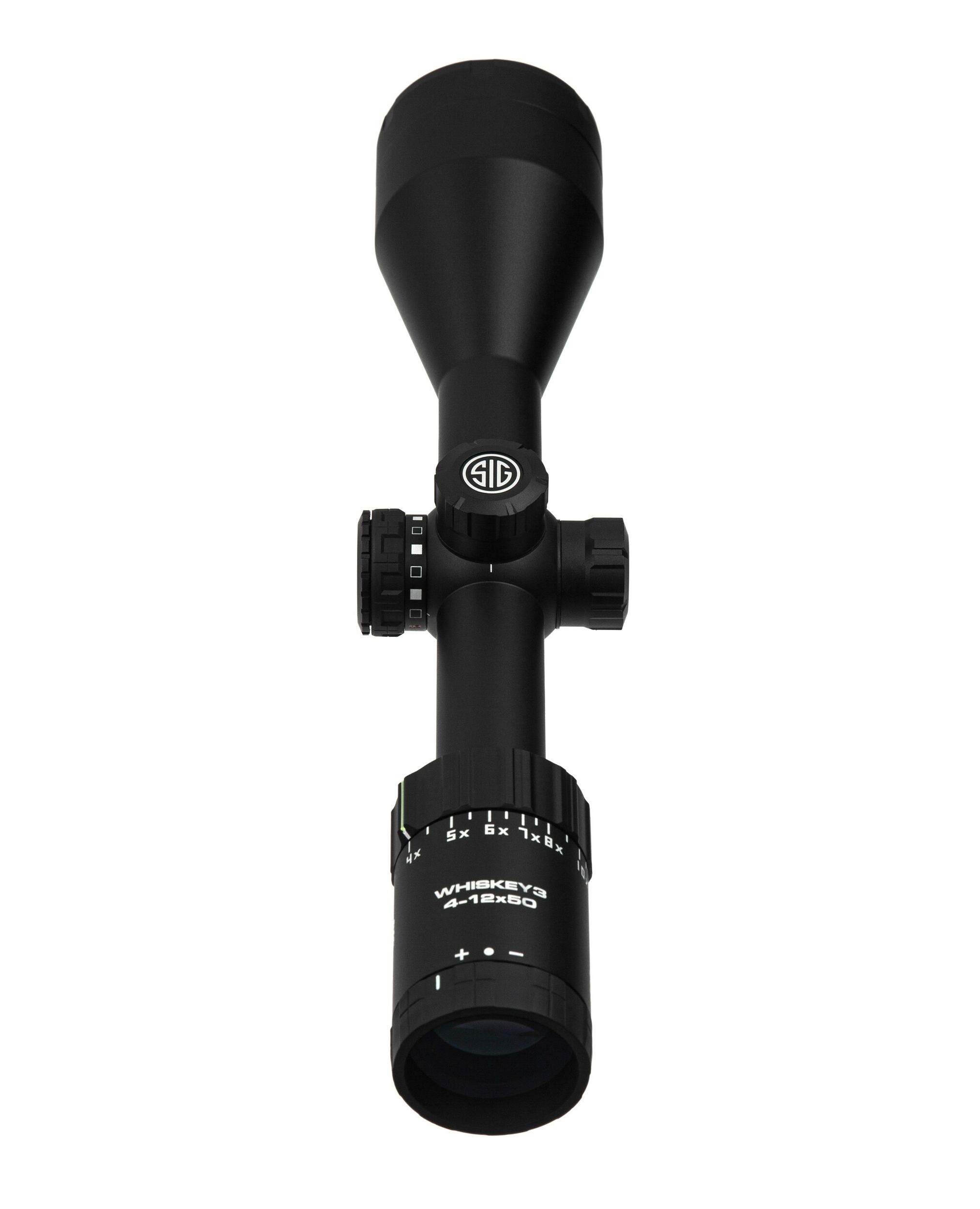 Розроблений для традиційних мисливських рушниць, а також розповсюджених платформ MSR/AR, оптичний приціл WHISKEY3 4–12x50 мм є ідеальним рішенням для бою на середніх та далеких дистанціях, а також для розважальної стрільби з широкого діапазону калібрів. Також призначений для полювання на небезпечну дичину. Має 3-кратний оптичний зум у другій фокальній площині (SFP) із сіткою QuadPlex, яка має підсвічування HellFire. Скло з низькою дисперсією (LD) забезпечує найкращу в галузі оптичну чіткість у будь-якій ситуації. Окуляр європейського типу забезпечує плавне, швидке та точне налаштування сітки. Приціл має надійну водонепроникність (клас захисту IPX-7 для повного занурення на глибину до 1 метра) та захист від запотівання.