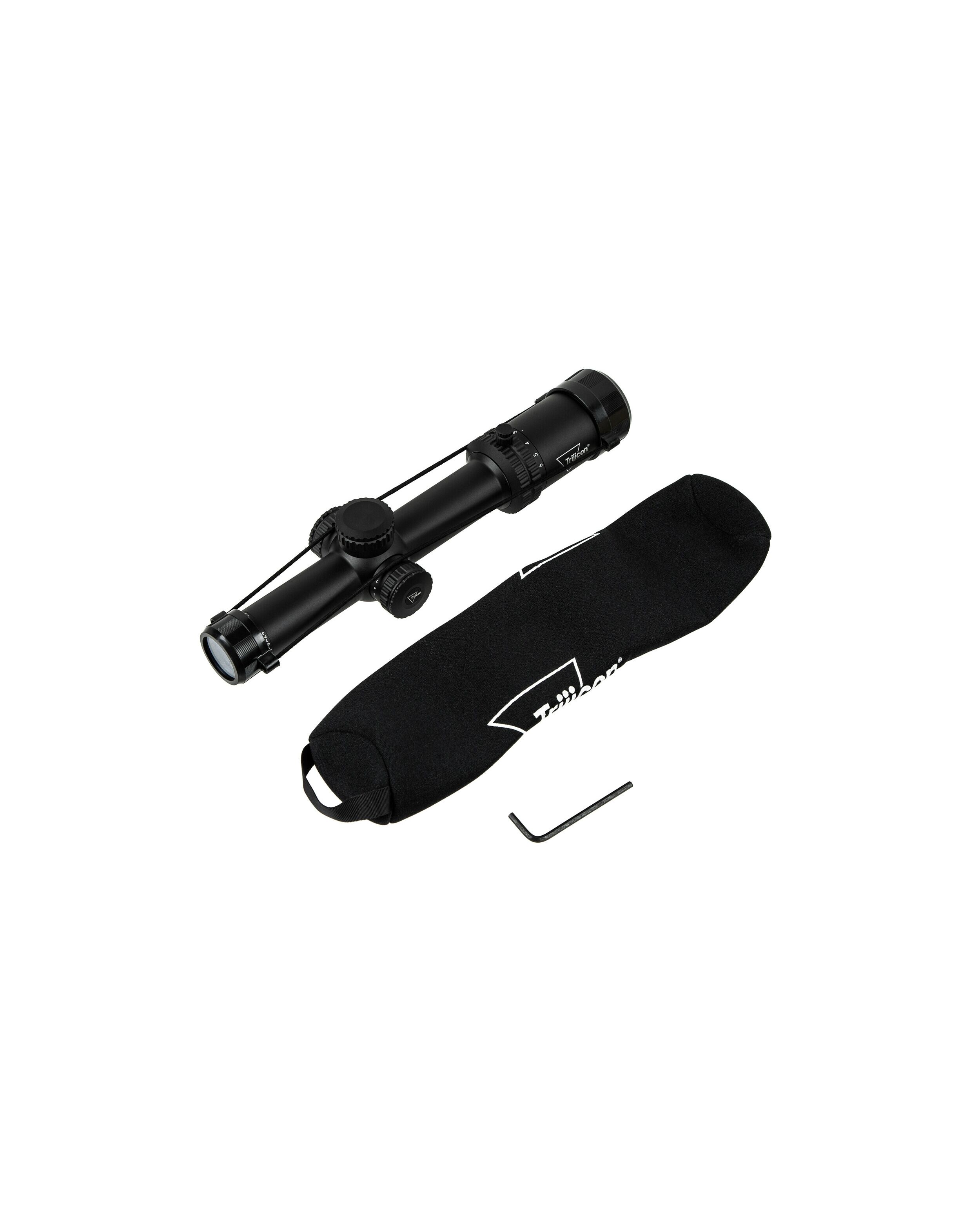 Комплект прицела включает: крышки объектива и окуляра, защитный неопреновый чехол, батарея CR2032, шестигранный ключ, салфетка для обслуживания, руководство пользователя, виниловая наклейка Trijicon.