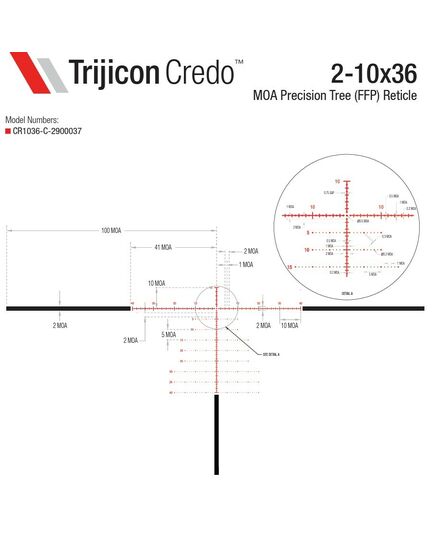 Тактический прицел Trijicon Credo® 2-10x36 в первой фокальной плоскости обеспечивает быстрое обнаружение цели при любых условиях освещения на разных расстояниях. Сетка MOA Precision Tree основана на популярнейшей сетке Trijicon для стрельбы на дальние дистанции, но используется в меньшем корпусе прицела Credo.