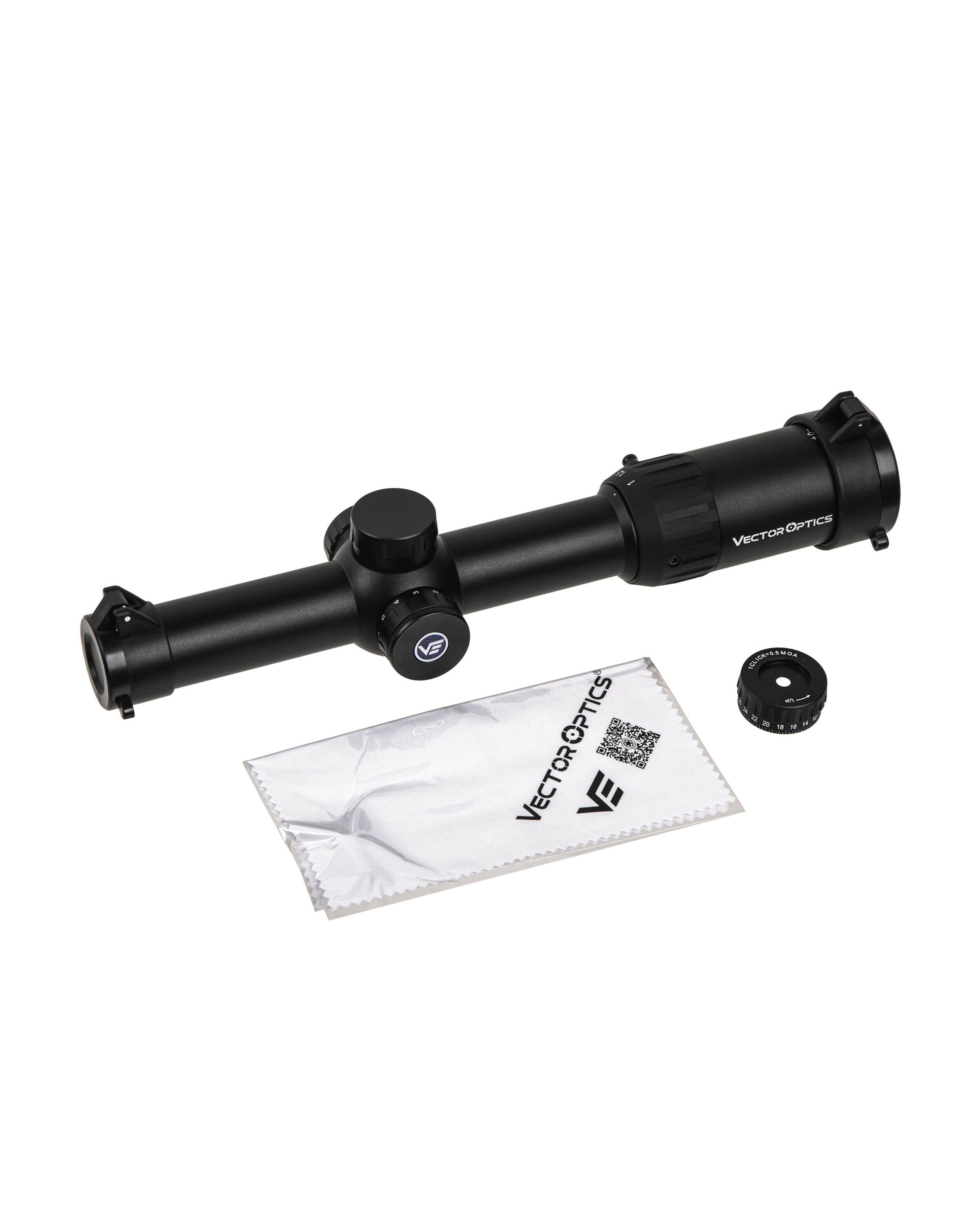 В комплекте сменный открытый барабанчик вертикальных поправок с отметками 1/2 MOA, также в комплект прицела входят кольца 30 мм на Вивер/Пикатин, откидные крышки на объектив и окуляр, чистящая салфетка.