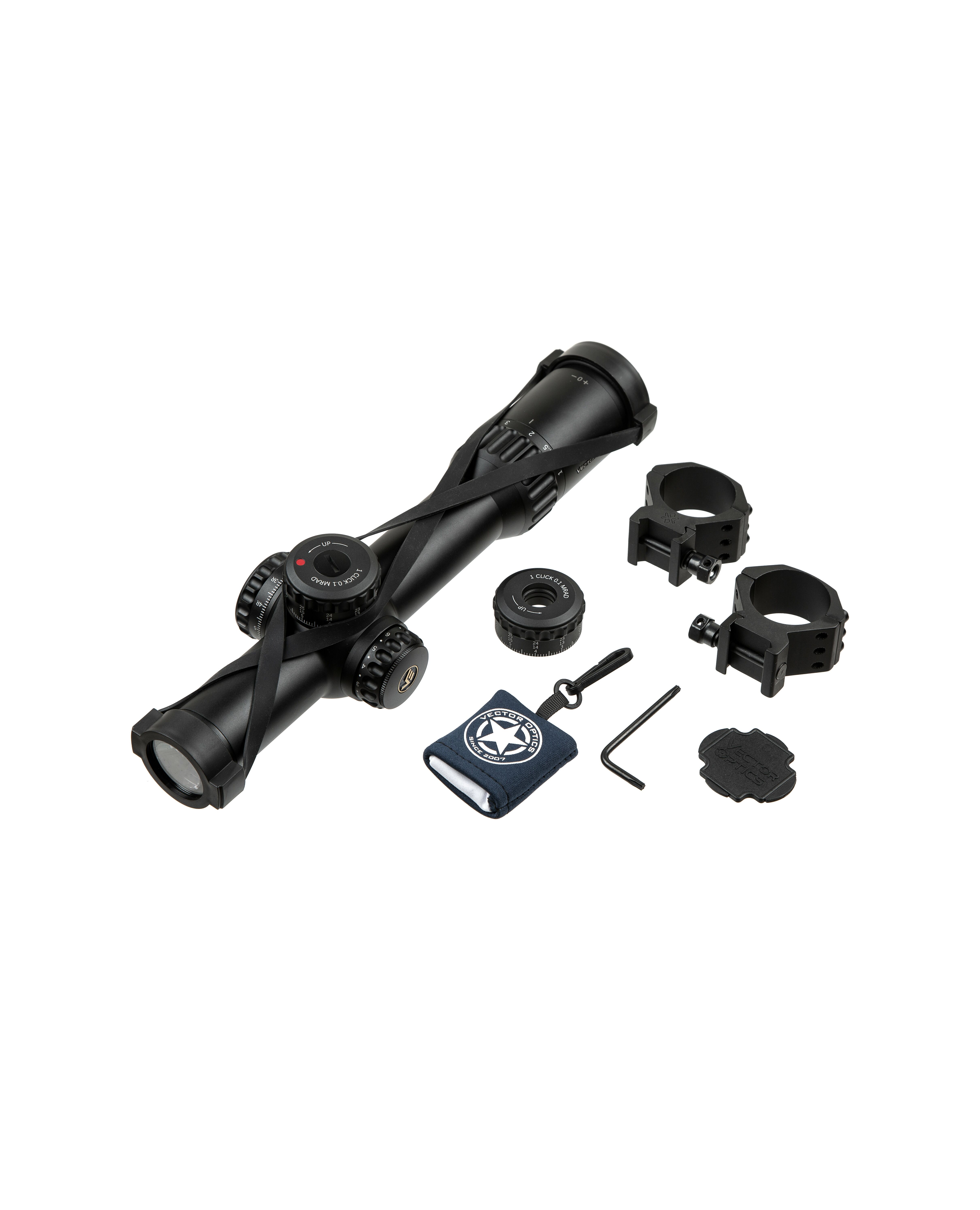 Комплектация: пара 34-миллиметровых колец для прицела на планку Пикатинни, запасной барабанчик поправок (без функции Zero Stop), руководство пользователя, крышки для объектива и окуляра, чистящая салфетка.