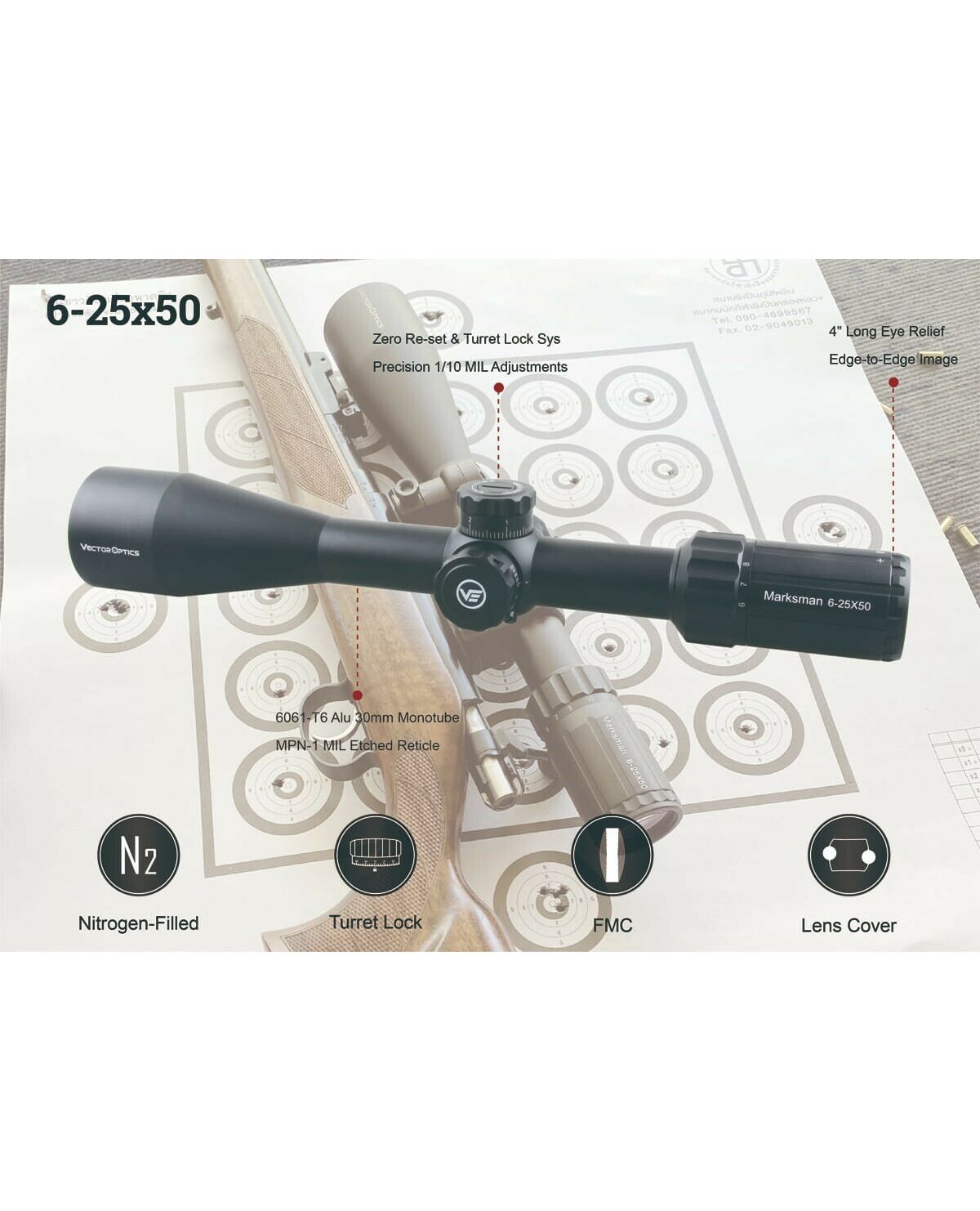 Прицел оптический Vector Optics Marksman 6-25x50 (30mm) SFP во второй фокальной плоскости имеет барабанчики поправок с фиксацией, тонкую гравированную сетку и достаточную кратность чтоб стать отличным дополнением к РСР или малокалиберной винтовке, т.к. отстройка параллакса возможна уже от 10 метров. В комплект прицела входят: крышки объектива и окуляра на резинках, сменный рычаг управления кратностью, антибликовая насадка на объектив, сменные барабанчики поправок и кольца.