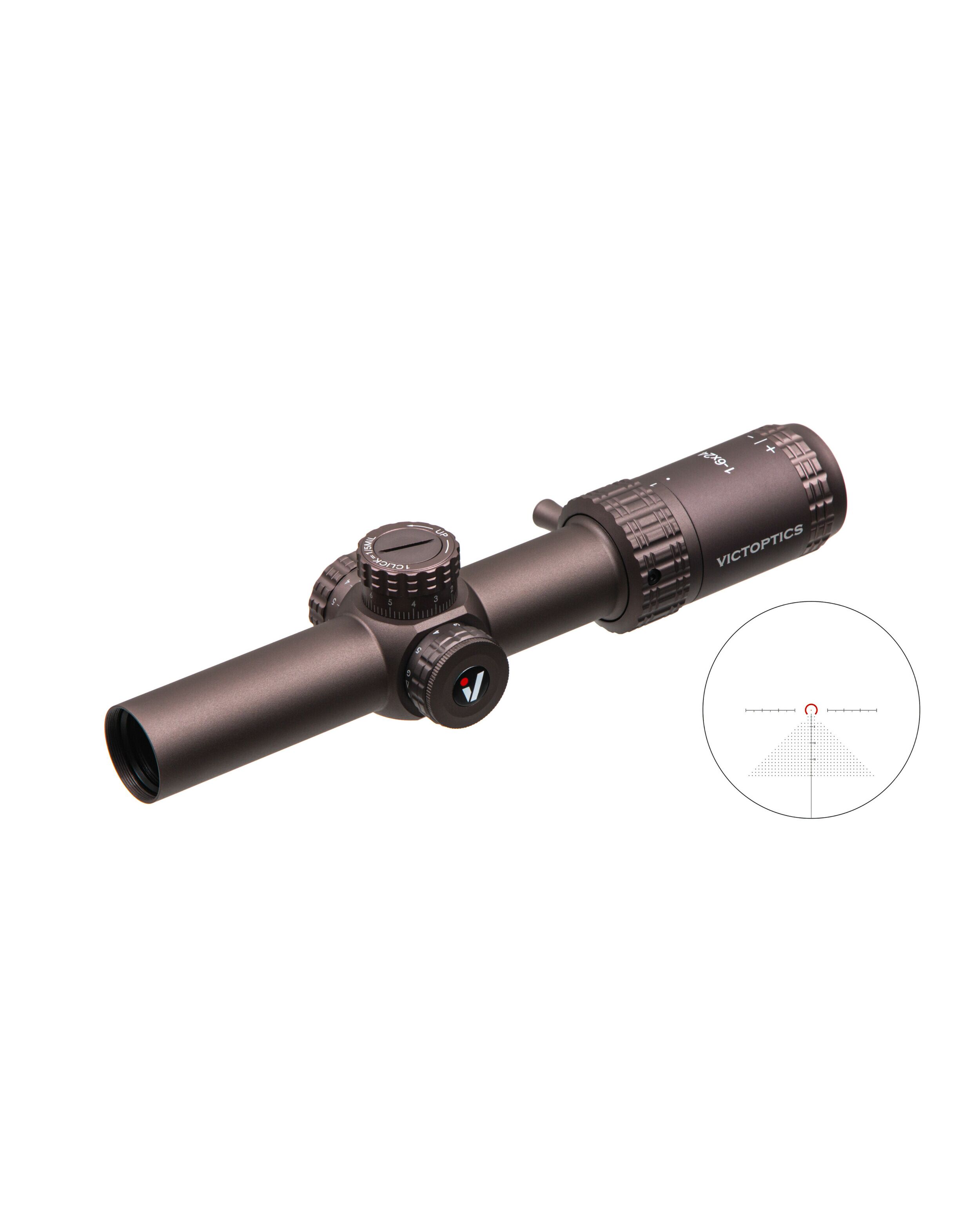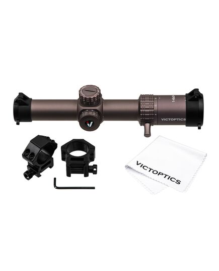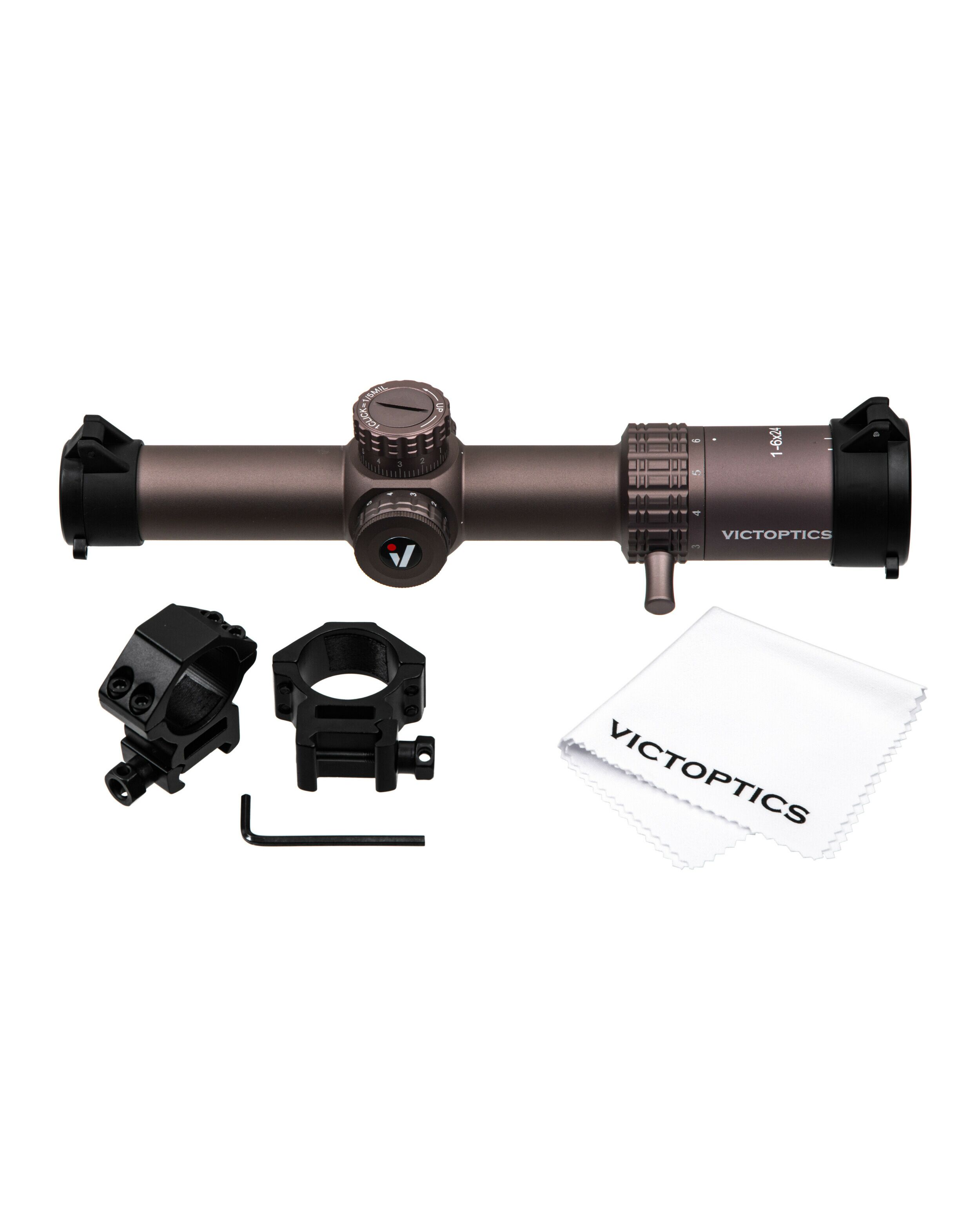 Оптический прицел S6 с увеличением 1-6х от фирмы Vector Optics, которая c 2007 года производит высококачественные прицелы и коллиматоры для огнестрельного оружия. Корпус, обеспечивающий водонепроницаемость и ударопрочность  изготовлен из высококачественного алюминия 6061-T6 с покрытием в цвете FDE. Внутренняя часть заполнена азотом, чтобы предотвратить запотевание линз. Стекло оптики покрыто многослойным антибликовым покрытием. Диоптрийная компенсация в диапазоне от -2 до +2 и диапазон регулировки по высоте и горизонтали> 50MIL (цена клика 1/5MIL). Сетка VI-CTSIX имеет 5-ступенчатую регулировку яркости подсветки . Питание от батарейки CR2032 (не входит в комплект).