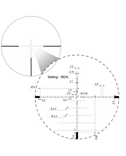 Прицельная сетка Sentinel 6-24x50 имеет прицельную сетку типа VSE-3 MOA, расположенную в первой фокальной плоскости (FFP), поэтому размер сетки изменяется с увеличением. Это позволяет производить замеры дистанции с помощью сетки на любой кратности.