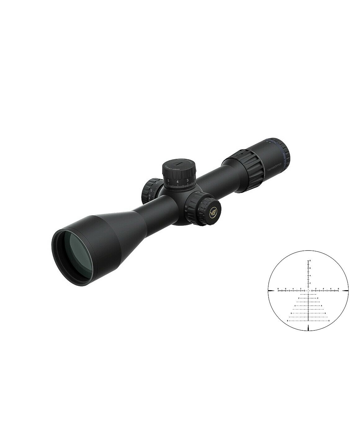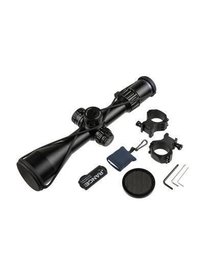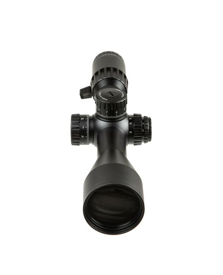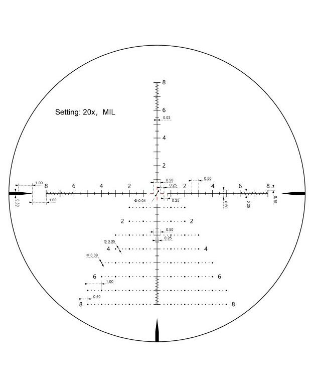 Прицельная сетка: Сетка расположена во второй фокальной плоскости (SFP), что означает, что ее размер остается неизменным при изменении увеличения. Это удобно для пользователей, предпочитающих постоянный размер сетки независимо от уровня увеличения. На кратности 20-х прицел позволяет правильно измерять дистанцию до объектов, размер которых известен. Сетка в MIL облегчает просчет благодаря метрической системе, а также позволяет производить выстрелы «выносом» благодаря древовидной структуре.