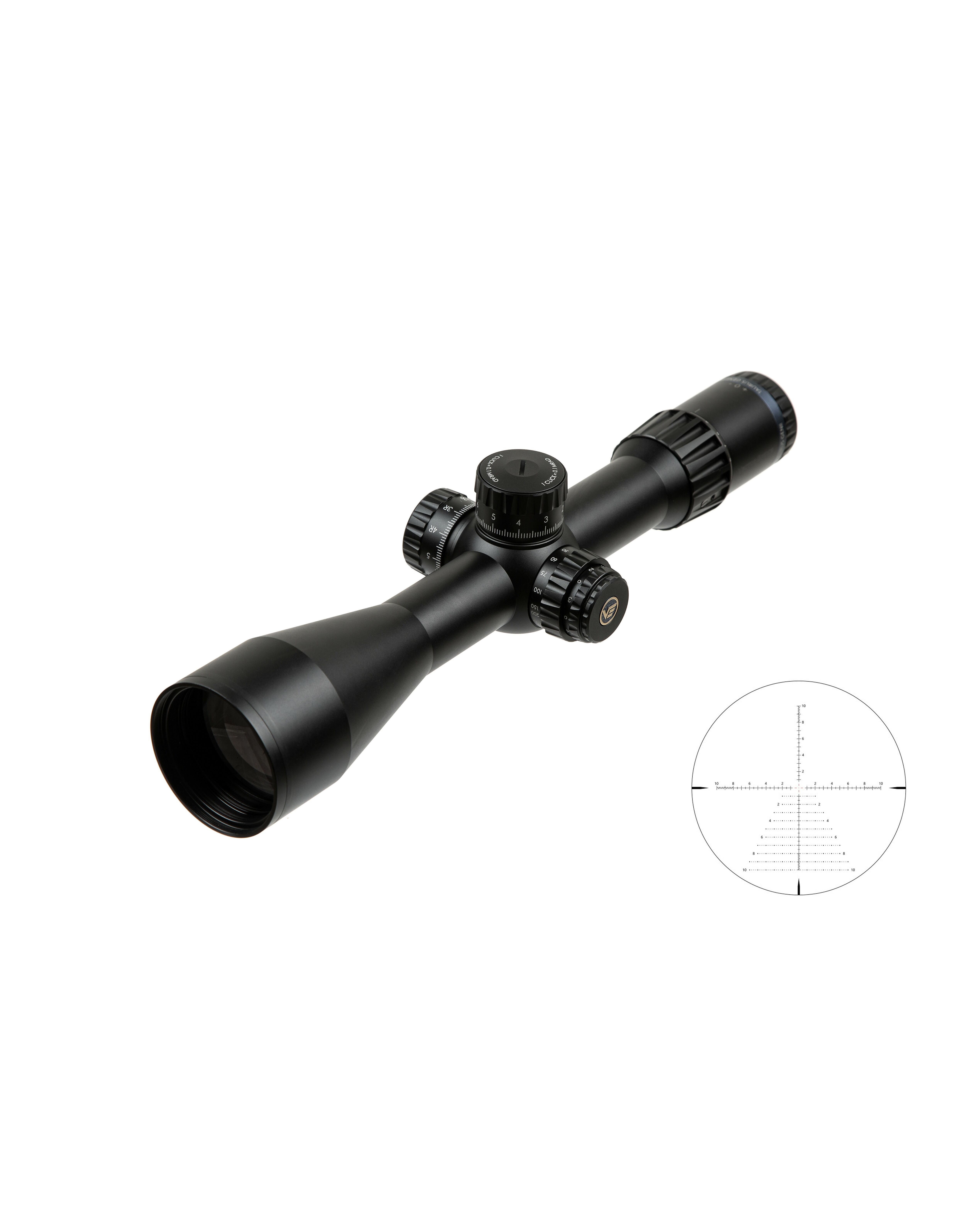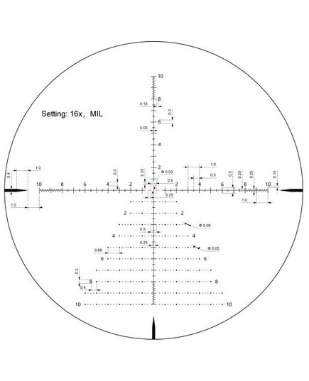 Прицельная сетка: Сетка расположена во второй фокальной плоскости (SFP), что означает, что ее размер не меняется при изменении увеличения. Это обеспечивает неизменную точность на всём диапазоне кратности. На кратности 16х прицел позволяет правильно измерять дистанцию до объектов, размер которых известен. Сетка VTA-6 в MIL облегчает просчет благодаря метрической системе, а также позволяет производить выстрелы «выносом» благодаря древовидной структуре.