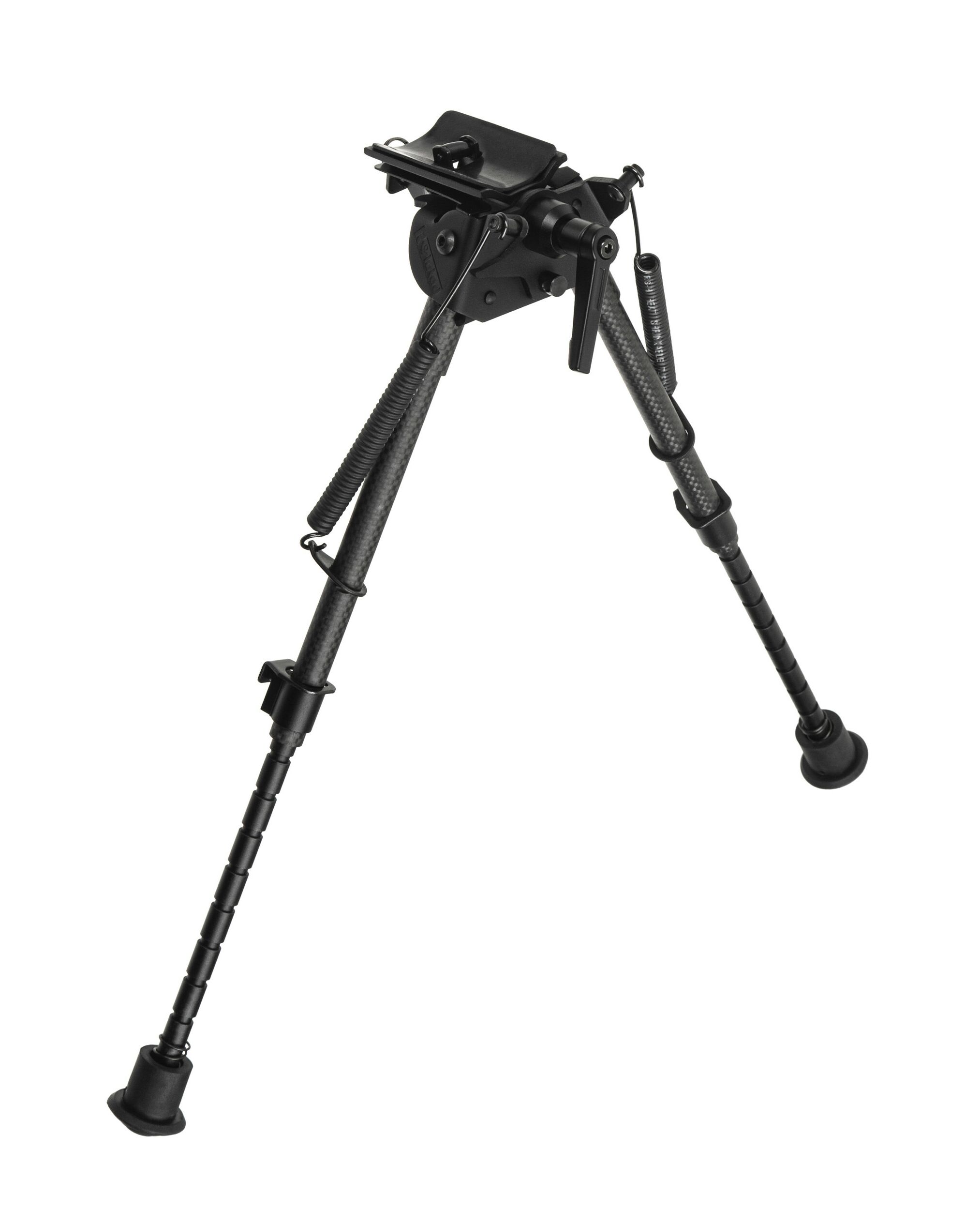 Сошки предназначены для применения на охоте и стрельбе. Крепятся на винтовки с помощью антабки или планки Пикатинни через адаптер. Высота сошек составляет от 230 мм до 345 мм в зависимости от выдвижения ног, которые имеют 10 уровней регулировки (по 11.5 мм каждый уровень). Ножки, покрытые резиновыми втулками, предотвращают скольжение, могут использоваться как на грубых поверхностях, так и на твердых грунтах. Для того, чтобы выдвинуть ноги, необходимо нажать на кнопку. Пружины также покрыты резиновыми втулками. Благодаря тому, что корпус Carbon Fiber 9-13.5" Swivel Spring изготовлен из алюминиевого сплава 6061-T6, а ножки из углеродистого волокна, сошки имеют лёгкий вес. Верхняя часть сошек покрыта резиной, чтобы не поцарапать оружие. Сошки имеют блокировку рычагом для того, чтоб обеспечить лучшую устойчивость.