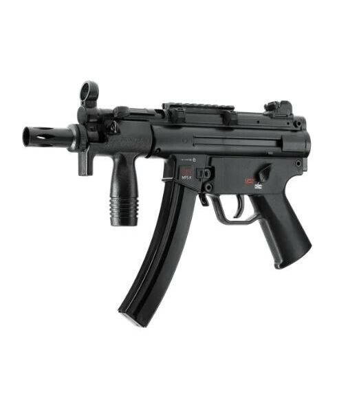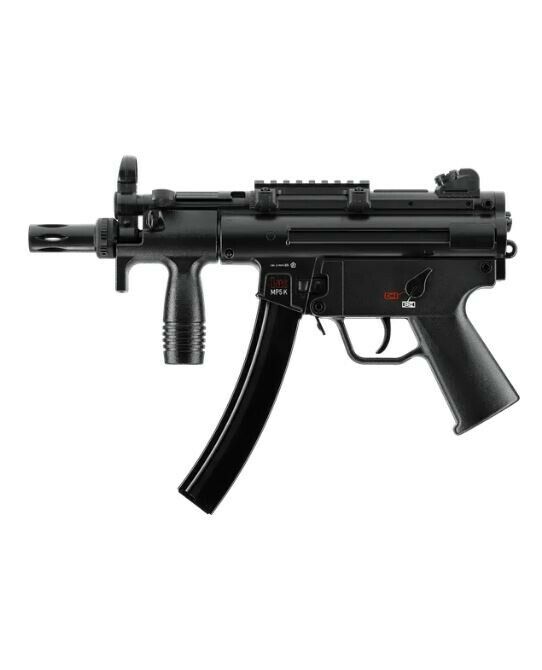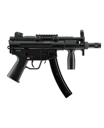 MP5 от Umarex - это страйкбольная версия легендарного пистолета-пулемета от всемирно известного производителя оружия Heckler&Koch модификации К, особенность которой заключается в применении затыльника (заглушки) вместо складного приклада. Корпус и рукоятка реплики изготовлены из прочного полимера, а ствол, магазин и УСМ - из стали. Как и оригинальная модель, страйкбольная версия оснащена съемным пламегасителем и передней рукояткой на цевье для удобного удержания. Также модель оснащена механическими прицельными приспособлениями - целиком и мушкой и двусторонним предохранителем, благодаря которому обеспечивается удобство пользования как для левши, так и правши. Для реалистичности стрельбы в модели применена система Blowback, которая имитирует движение затвора и отдачу. В качестве элемента питания выступает 12-ти граммовый баллон с CO2 газом, которого хватает на 80 выстрелов. Стрельба ведется одиночными выстрелами. Магазин Low-cap изготовлен из стали и имеет емкость 30 шариков BB калибра 6 мм. Для удобства заряжания пружина в магазине легко фиксируется в нижнем положении. MP5 от Umarex полностью лицензированная модель компанией Heckler&Koch, а значит на ней нанесены аутентичные маркировки, как и в оригинале.