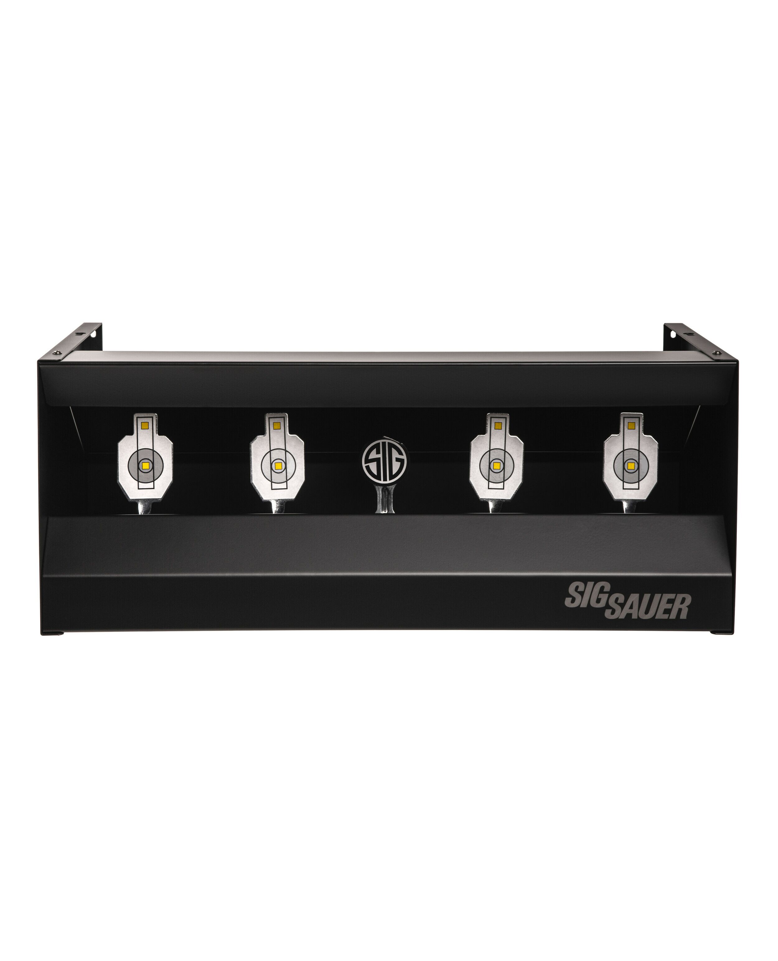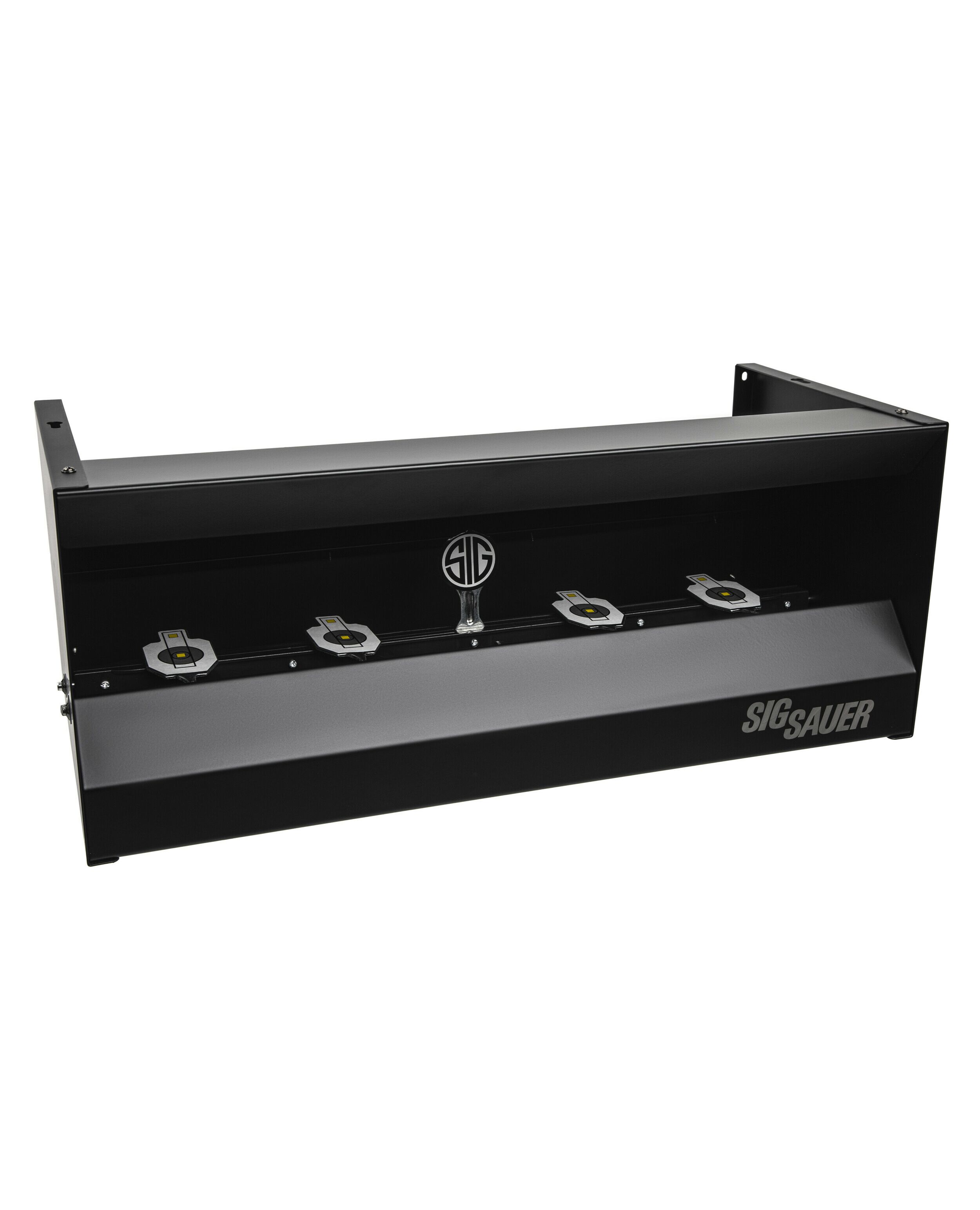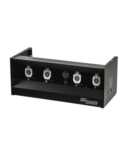 Тир Sig Sauer Airgun Quad Shooting Gallery представляет из себя стальной пулеулавливатель с четырьмя падающими мишенями, и центральной мишенью Sig с функцией сброса.
