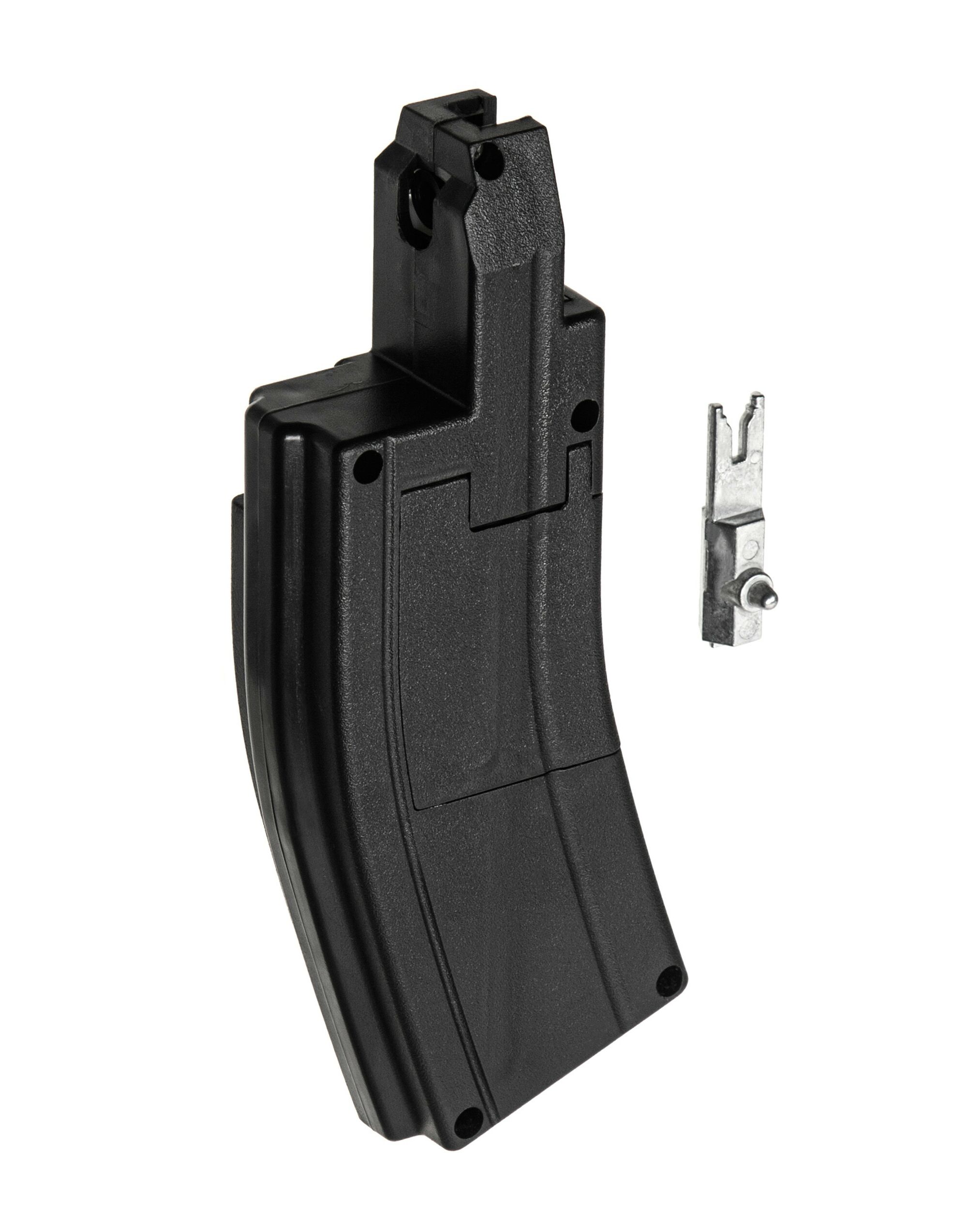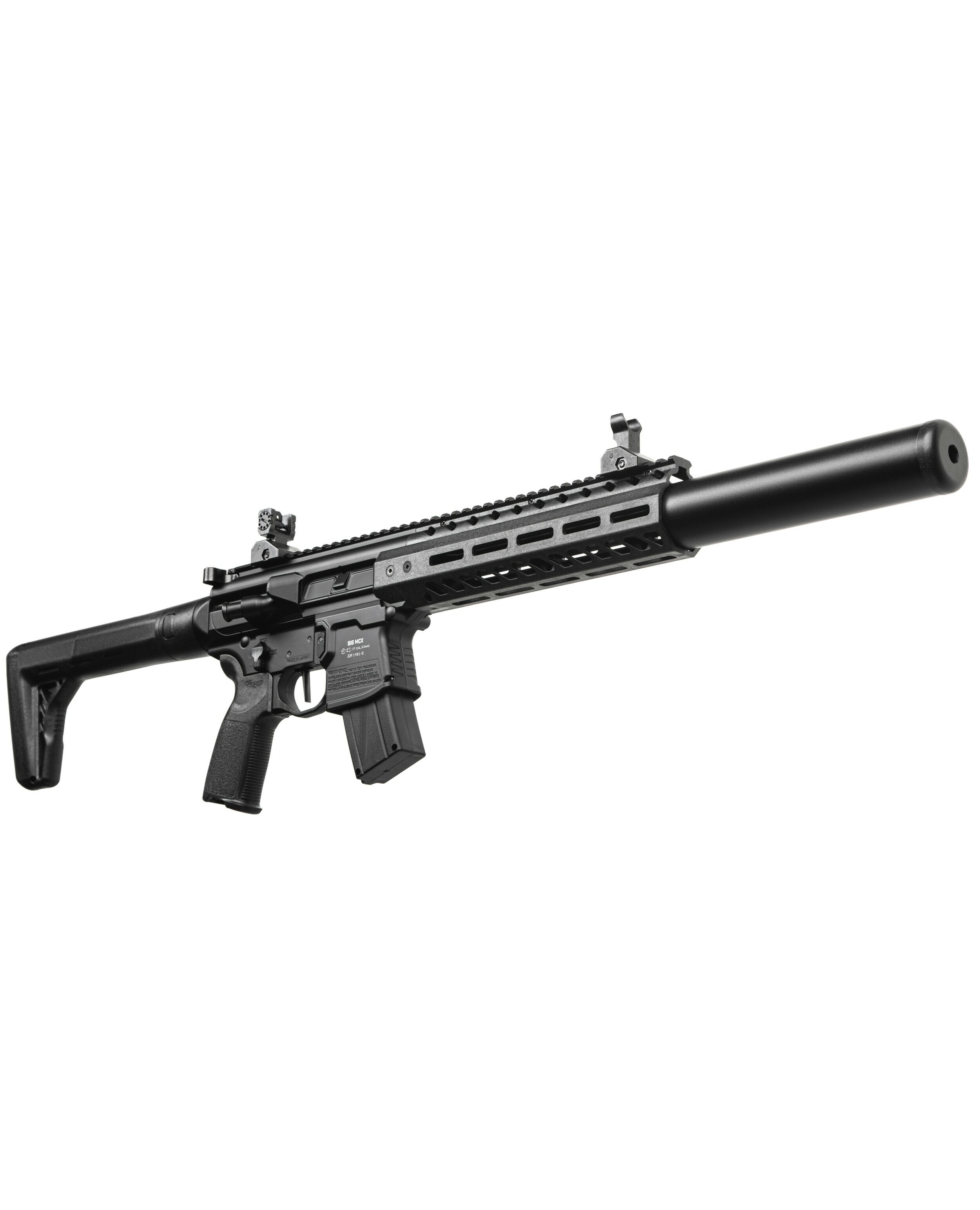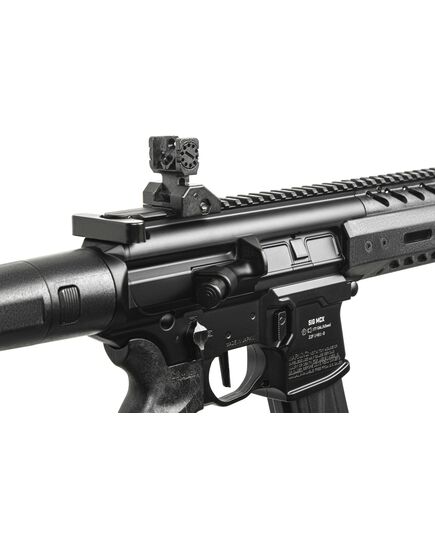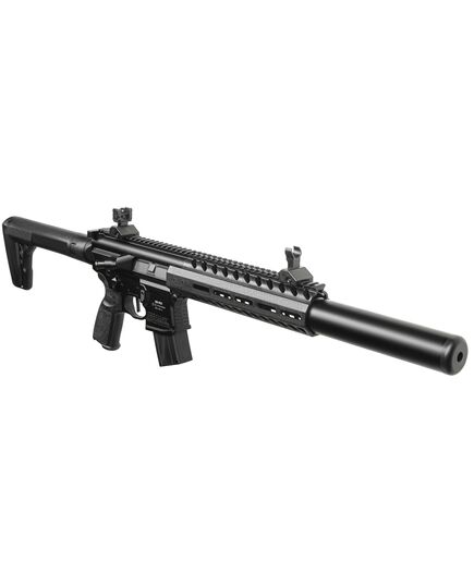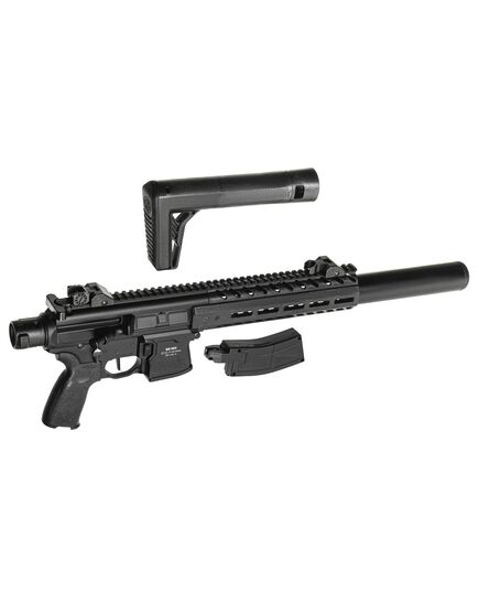Sig Sauer MCX GEN II – это пневматическая винтовка, созданная по мотивам популярной боевой винтовки Sig MCX. Это изделие относится к газобаллонной пневматике, где источником энергии является баллон с сжатым углекислым газом CO2 на 88 или 90 грамм, который устанавливается в приклад. Такого баллона хватит более чем на 300 выстрелов. Корпус выполнен из прочного полимера, а отдельные элементы, такие как ствол и затвор, изготовлены из метала. Запатентованная система магазина RPM – это ленточная вращающаяся система подачи пулек, которая увеличивает скорость последующих выстрелов. Магазин 30-ти зарядный. Ствол, сделанный из стали, с нарезами, что повышает точность стрельбы. Наведение на цель осуществляется с помощью съёмных прицельных приспособлений (целик и мушка). В качестве боеприпасов используют свинцовые пули кал. 4,5 мм, оптимальный вес от 5.0 до 8.5 грамм. Стрельба ведется в полуавтоматическом режиме. Над стволом по всей длине винтовки расположена планка пикатинни для закрепления различных прицельных приспособлений. Также есть ручной предохранитель. Под стволом расположено цевье с системой крепления M-lock, что дает возможность выбрать различные подствольные аксессуары. Отличительная черта GEN II от предыдущей версии – это уменьшение угла рукоятки, что позволило улучшить контроль над оружием, снизить нагрузку на кисть и увеличить скорость прицеливания. Так же изменен спусковой механизма – крючок стал прямым и плоским, что обеспечило более естественное положение пальца. Улучшен дизайн приклада и затыльника, теперь он стал тоньше, что уменьшило вес винтовки. Sig Sauer MCX GEN II относится к премиальному сегменту благодаря высокому качеству изготовления, реалистичному виду и хорошим техническим характеристикам.