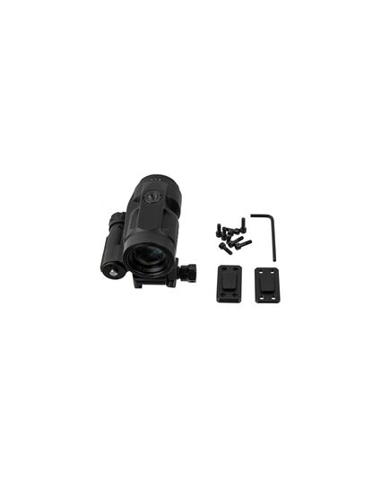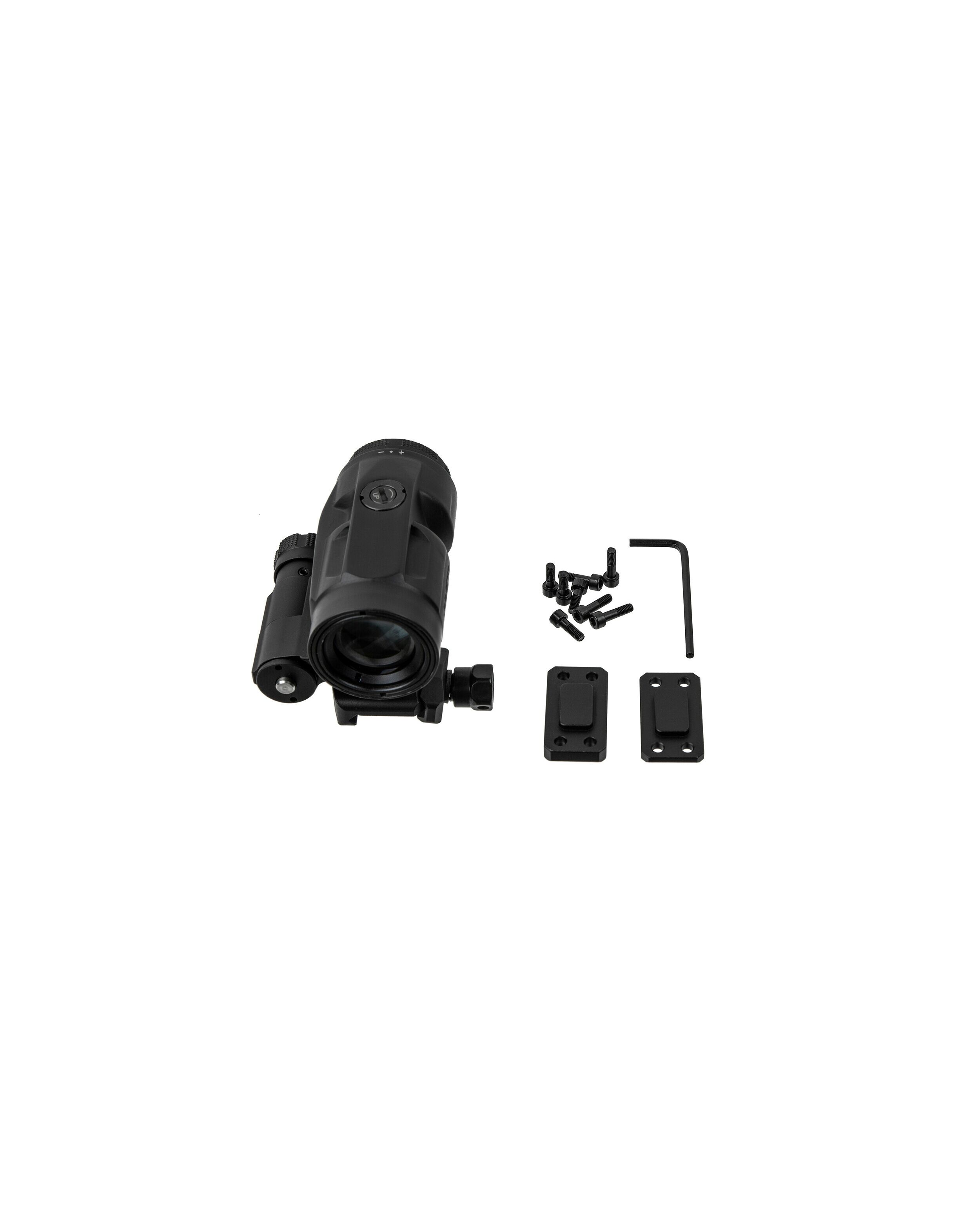В комплект увеличителя входит шестигранный ключ, 2 райзера для совместимости с различными коллиматорами по высоте, 8 винтов для крепления, резиновые крышки для объектива и окуляра, руководство пользователя, салфетка для обслуживания.